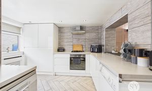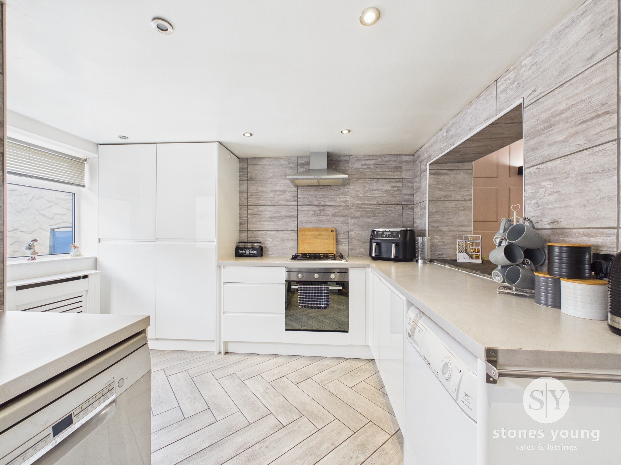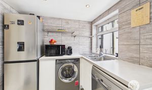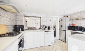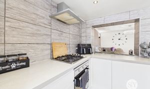 Laminate flooring, range of wall and base units and contrasting work surfaces, integrated 4x ring gas hob, oven, extractor fan, space and plumbing for washing machine, space for dishwasher, space for fridge freezer, uPVC double glazed window x2, uPVC door to rear, panel radiator, ceiling spotlights.