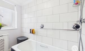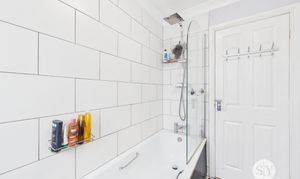 Tiled flooring, three piece suite in white with mains fed shower over bath, uPVC frosted window, panel radiator.