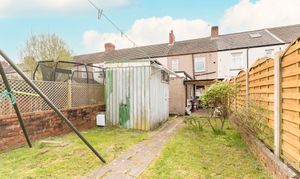 The rear garden is a standout feature of the property, offering a generous outdoor space that is perfect for families and entertaining. The garden is easily accessible from the kitchen and includes a lean-to area currently housing an outdoor utility space. A paved patio area leads to a good-sized lawn, providing plenty of space for children to play, outdoor dining, or simply enjoying the fresh air.