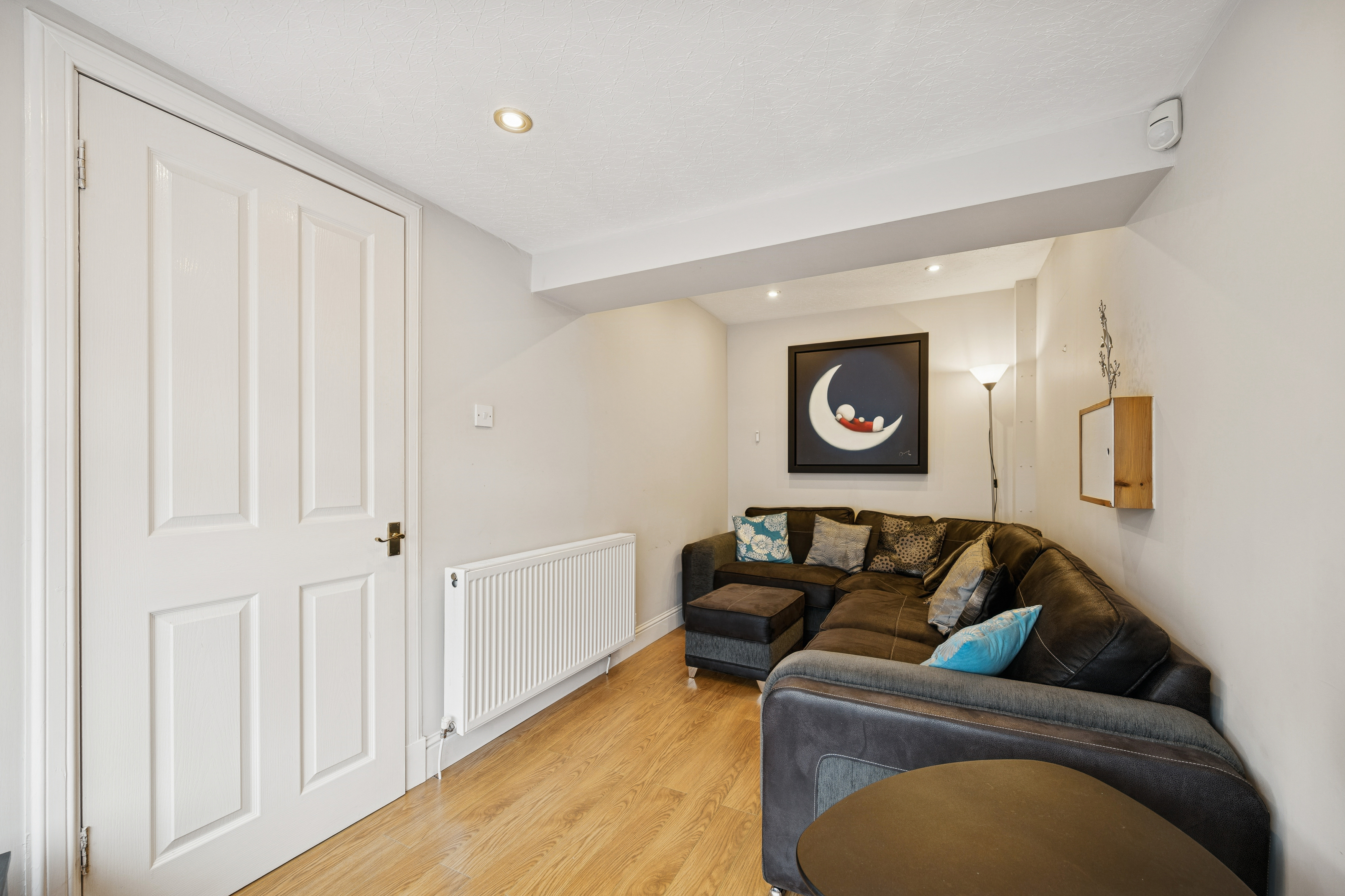 Stepping inside, you are greeted by a bright and welcoming hallway that introduces the home. To the right, the former garage has been thoughtfully converted into an additional lounge a flexible space that can easily serve as a second sitting room, guest bedroom, or home office.
