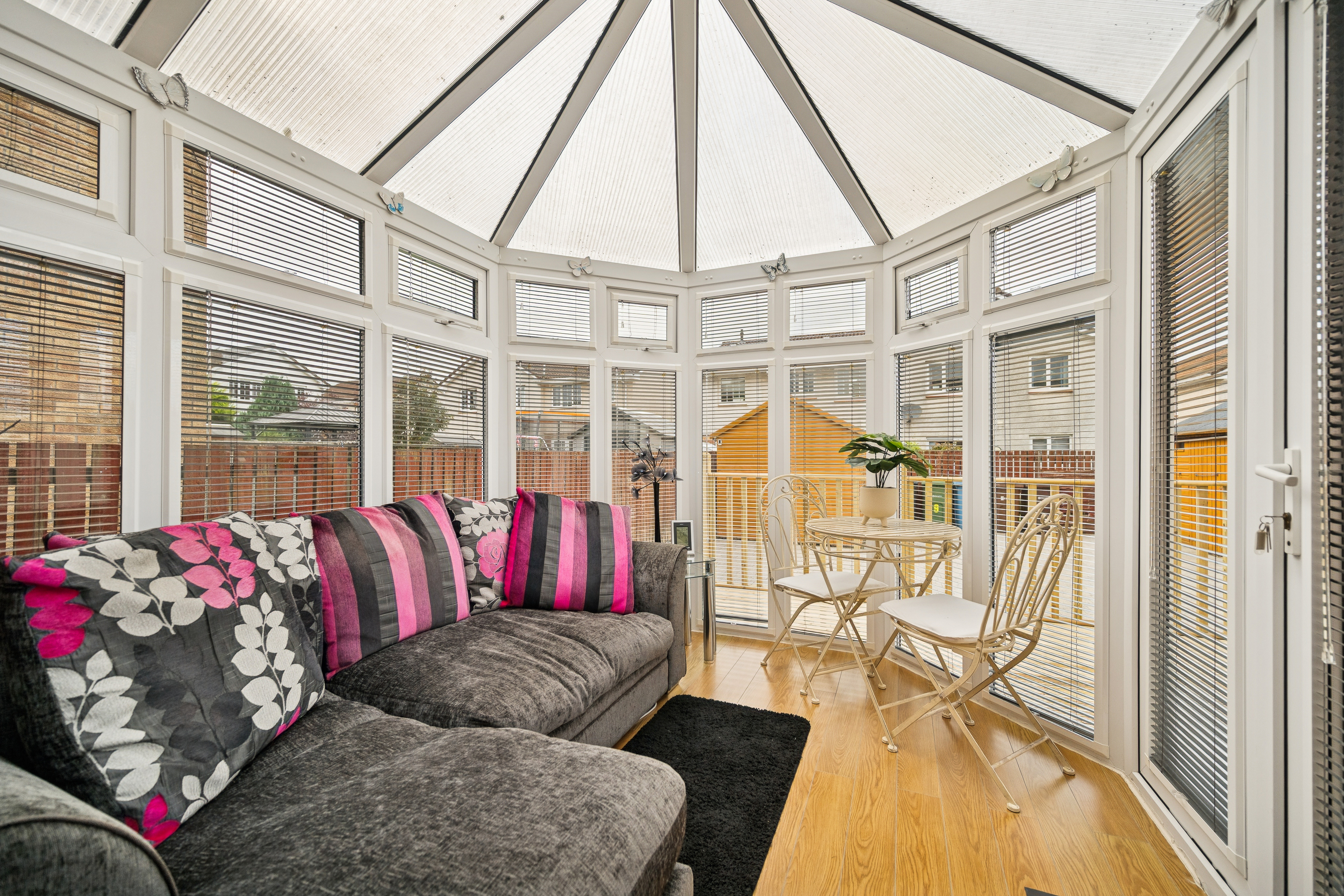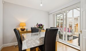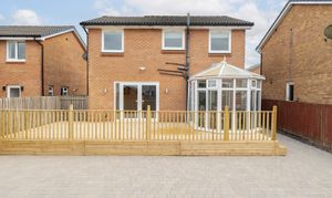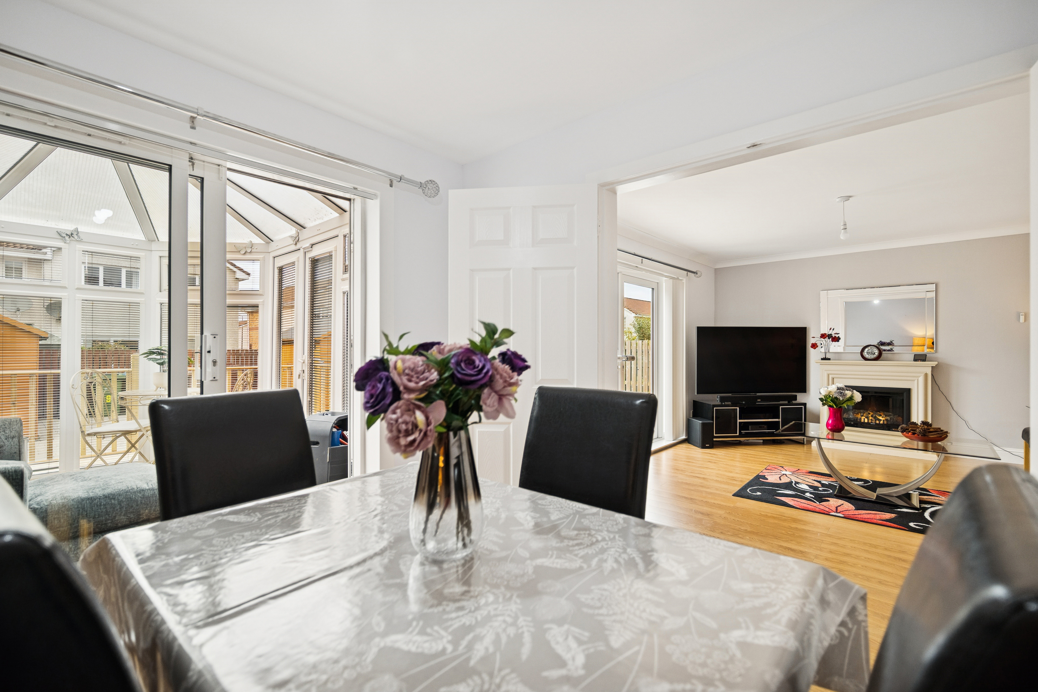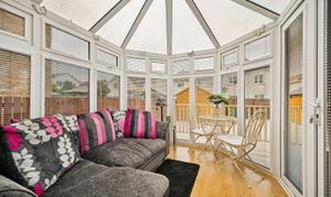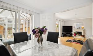 Straight ahead, the open-plan lounge and dining area forms the heart of the home. The lounge is generously proportioned, with space for two large sofas, a media wall, and a feature fireplace, while patio doors open directly onto the rear decking, seamlessly connecting indoor and outdoor living. To the side, the dining area can host four to six people and opens into the conservatory, a tranquil retreat that can be used as an additional lounge, playroom, or entertaining space.