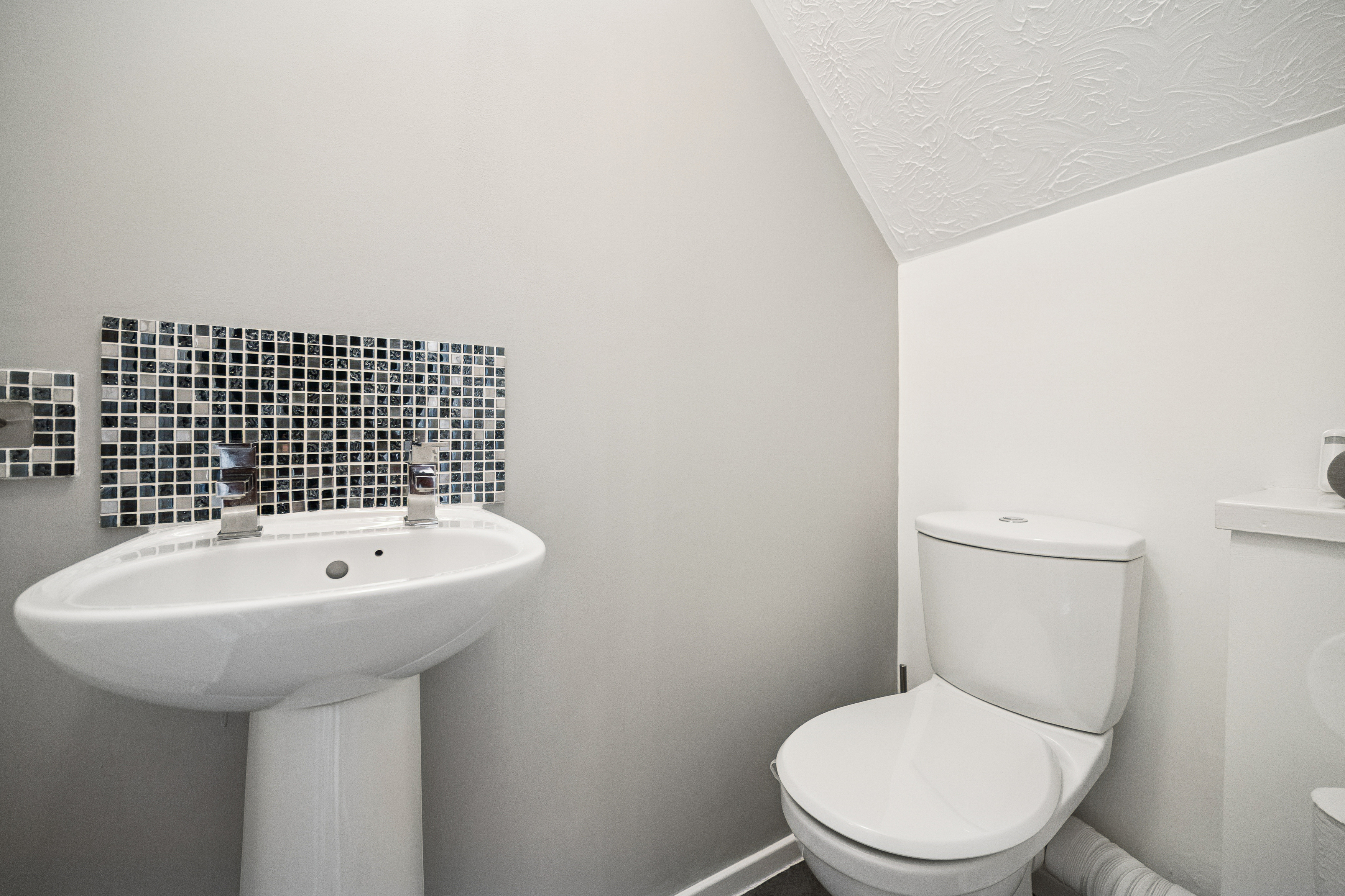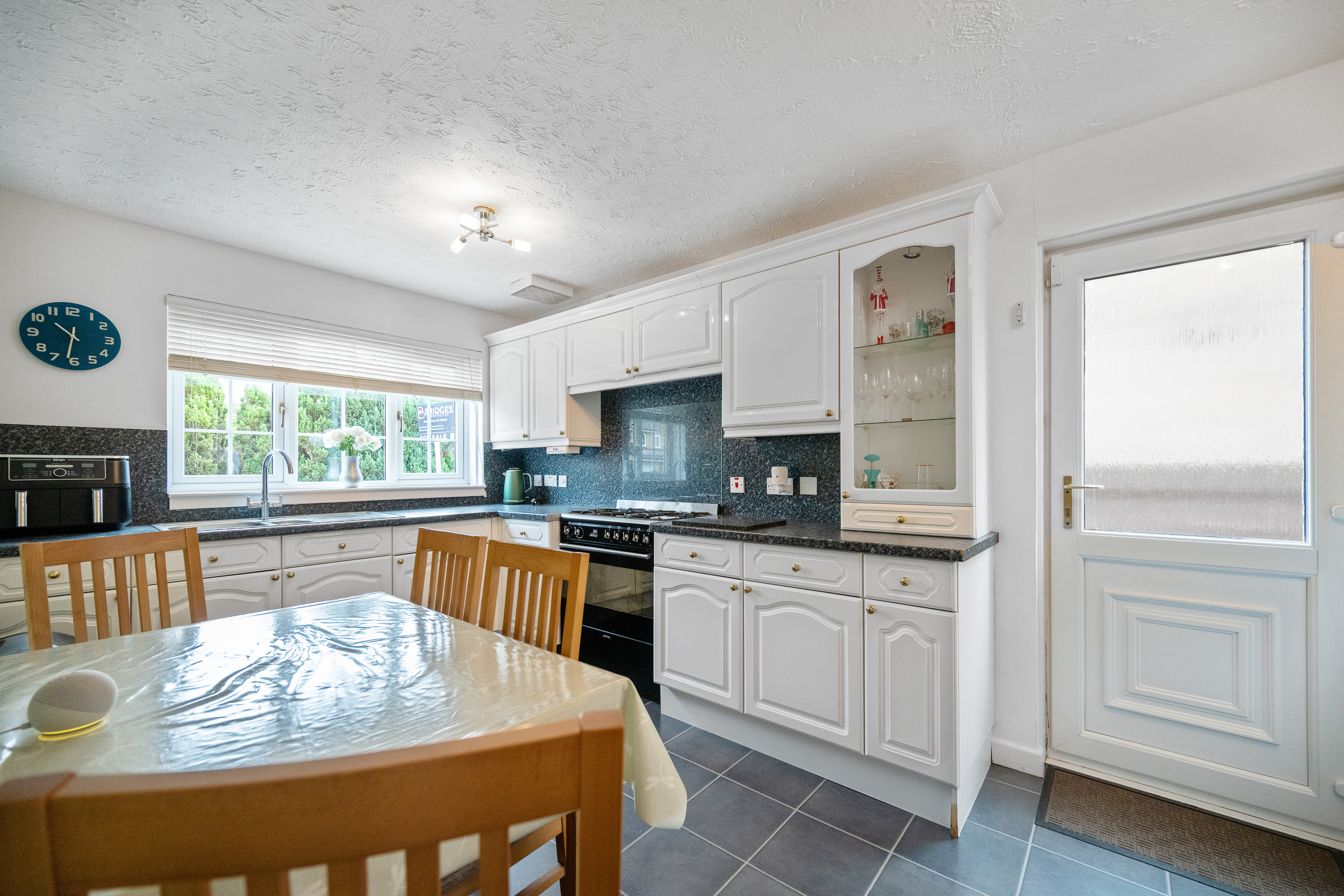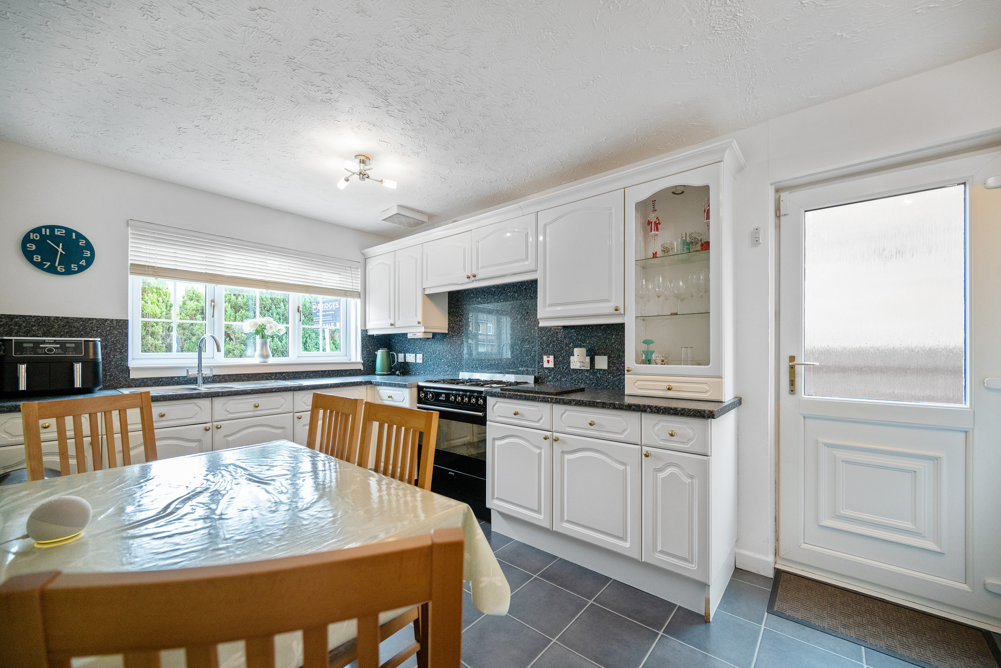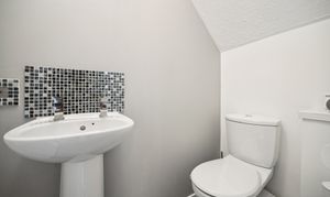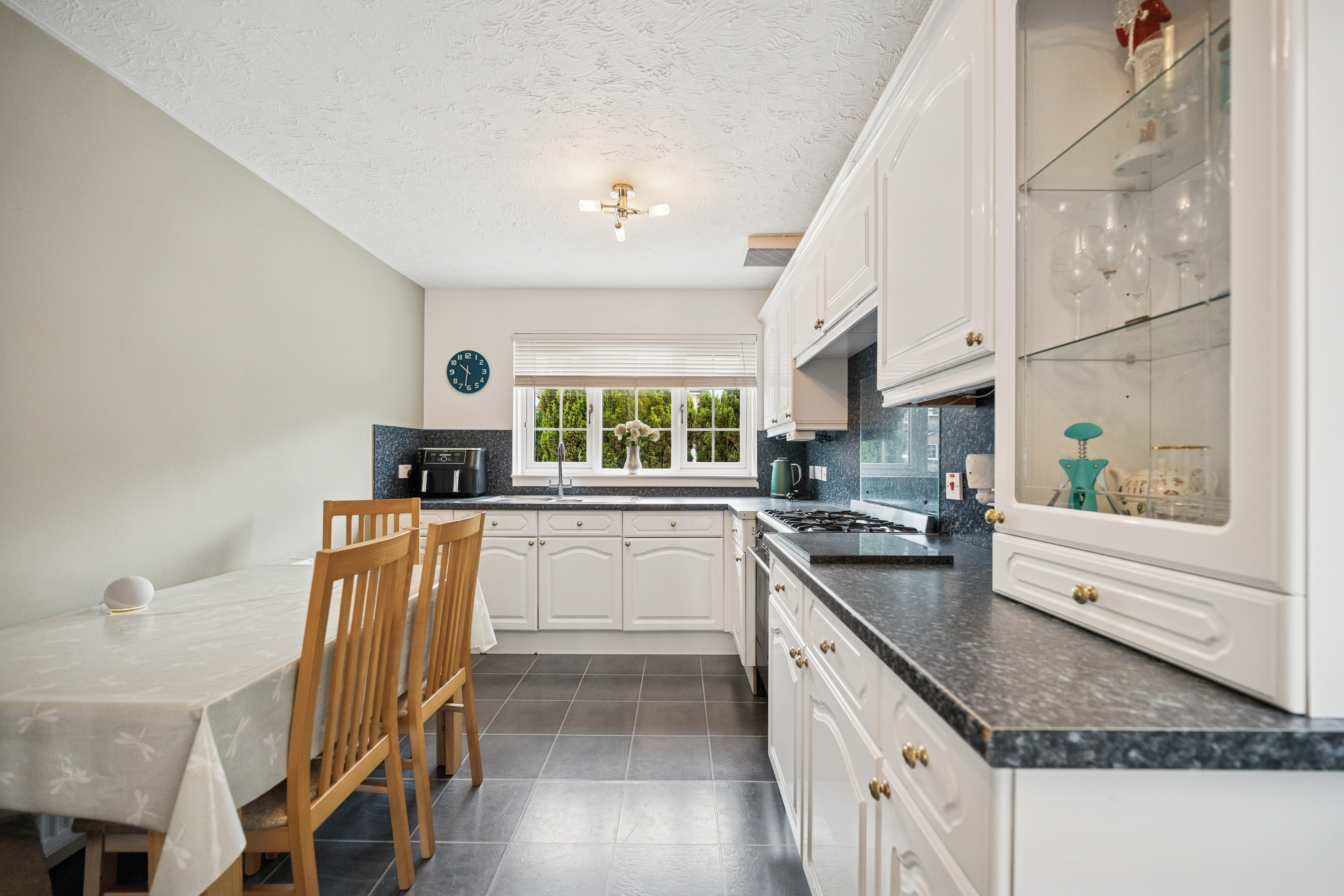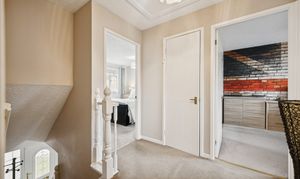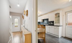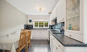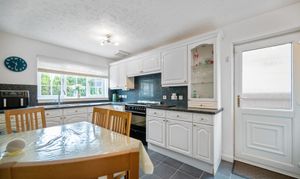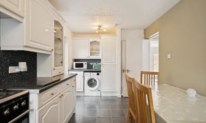 The kitchen is equally impressive in size, featuring neutral décor, chrome accents, and a five-point gas cooker. There is ample room for a breakfast table seating four, alongside plentiful cabinetry, countertop space, and integrated appliances. Additional space is available for a washing machine, fridge-freezer, and more, with a handy storage cupboard completing the setup. A ground-floor WC with splashback tiling adds everyday convenience.