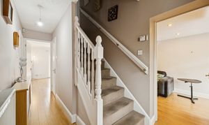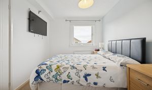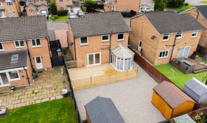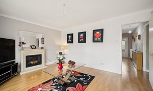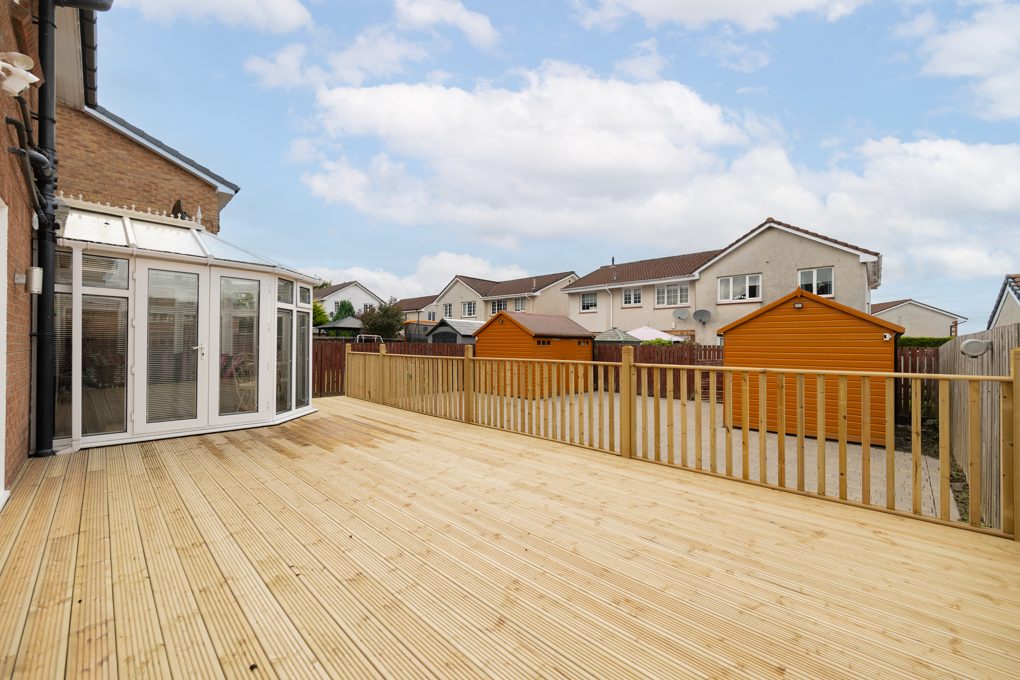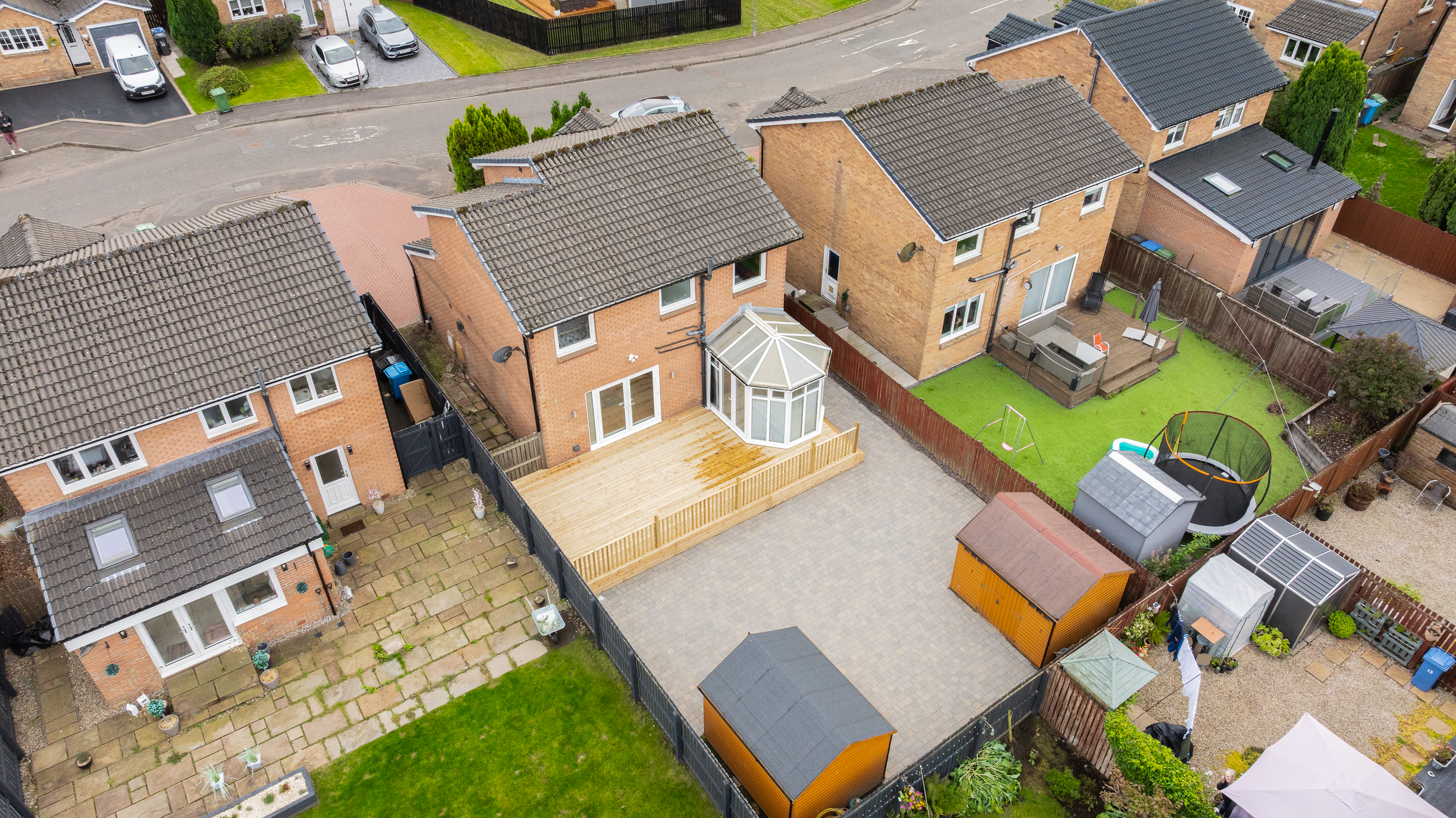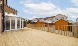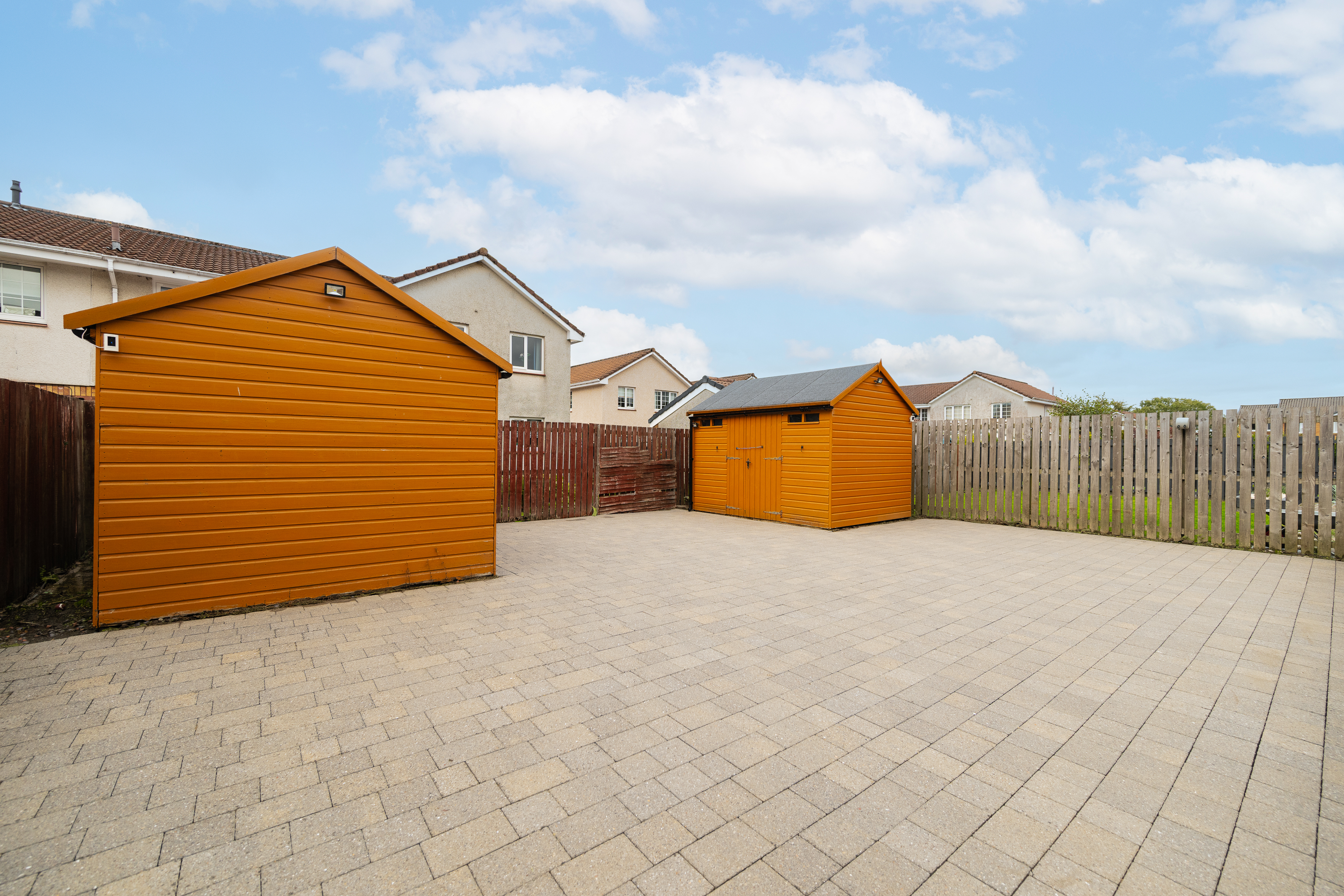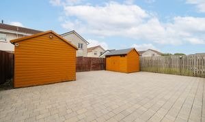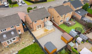 The rear garden is private, low maintenance, and perfectly designed for entertaining. Featuring recently installed decking, space for two sheds, and full monoblock surfacing, it provides a secure, practical, and sun-filled outdoor area. To the front, a generous three- to four-car driveway ensures ample parking, with visitor spaces also available. Additional benefits include a security system with cameras and an alarm for added peace of mind.