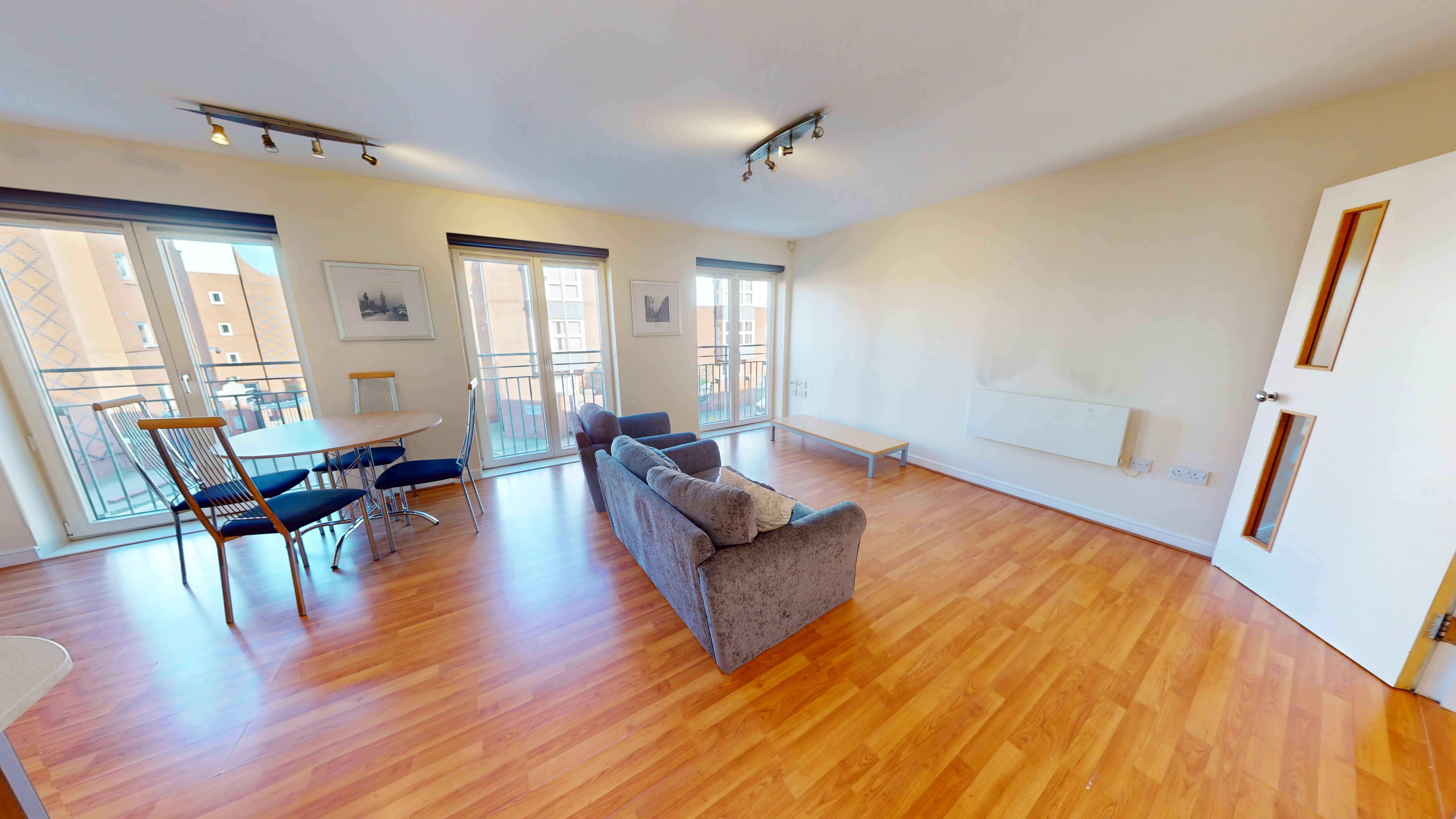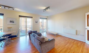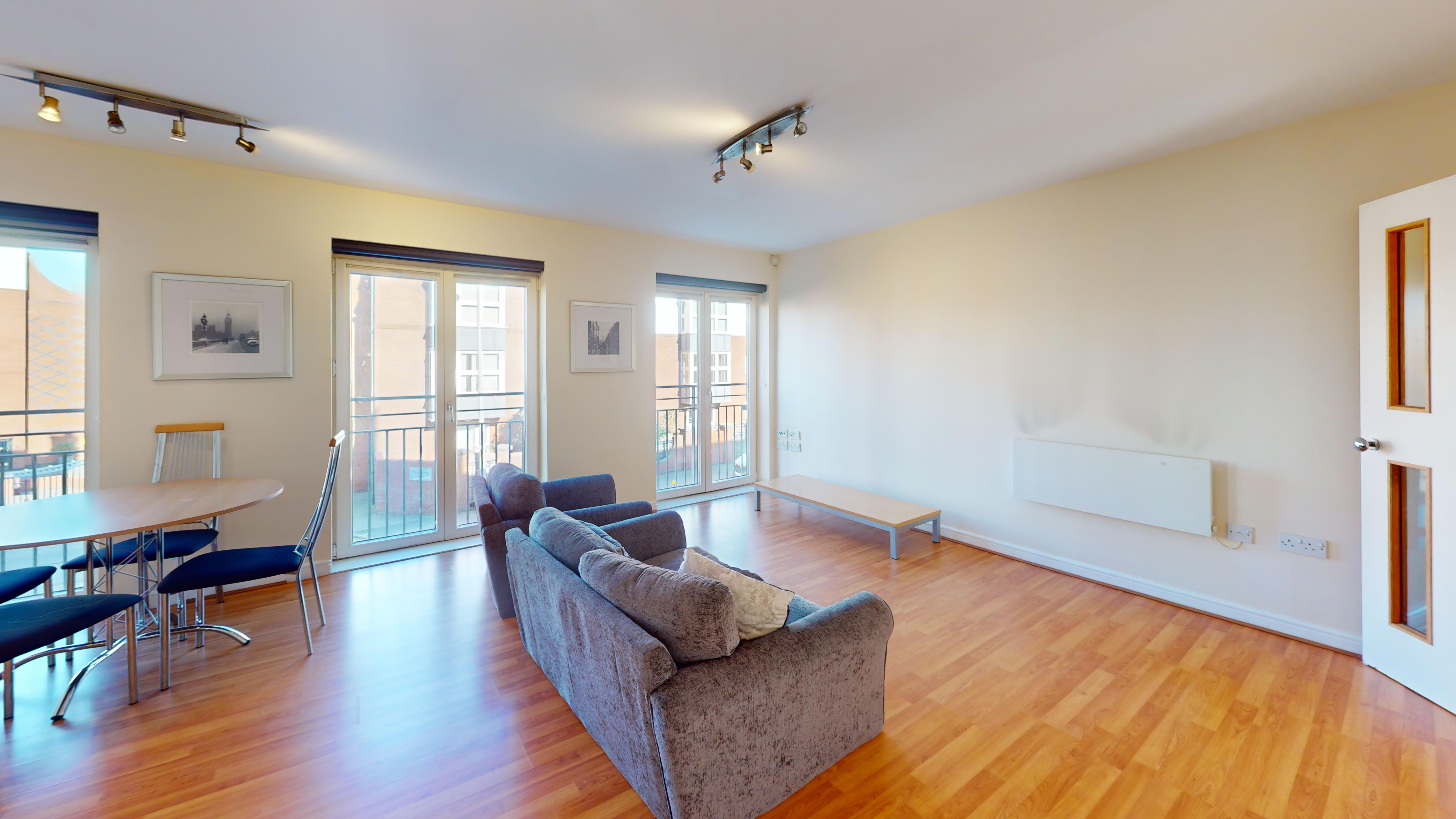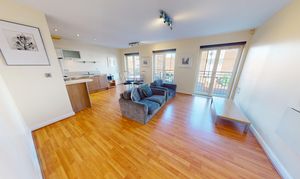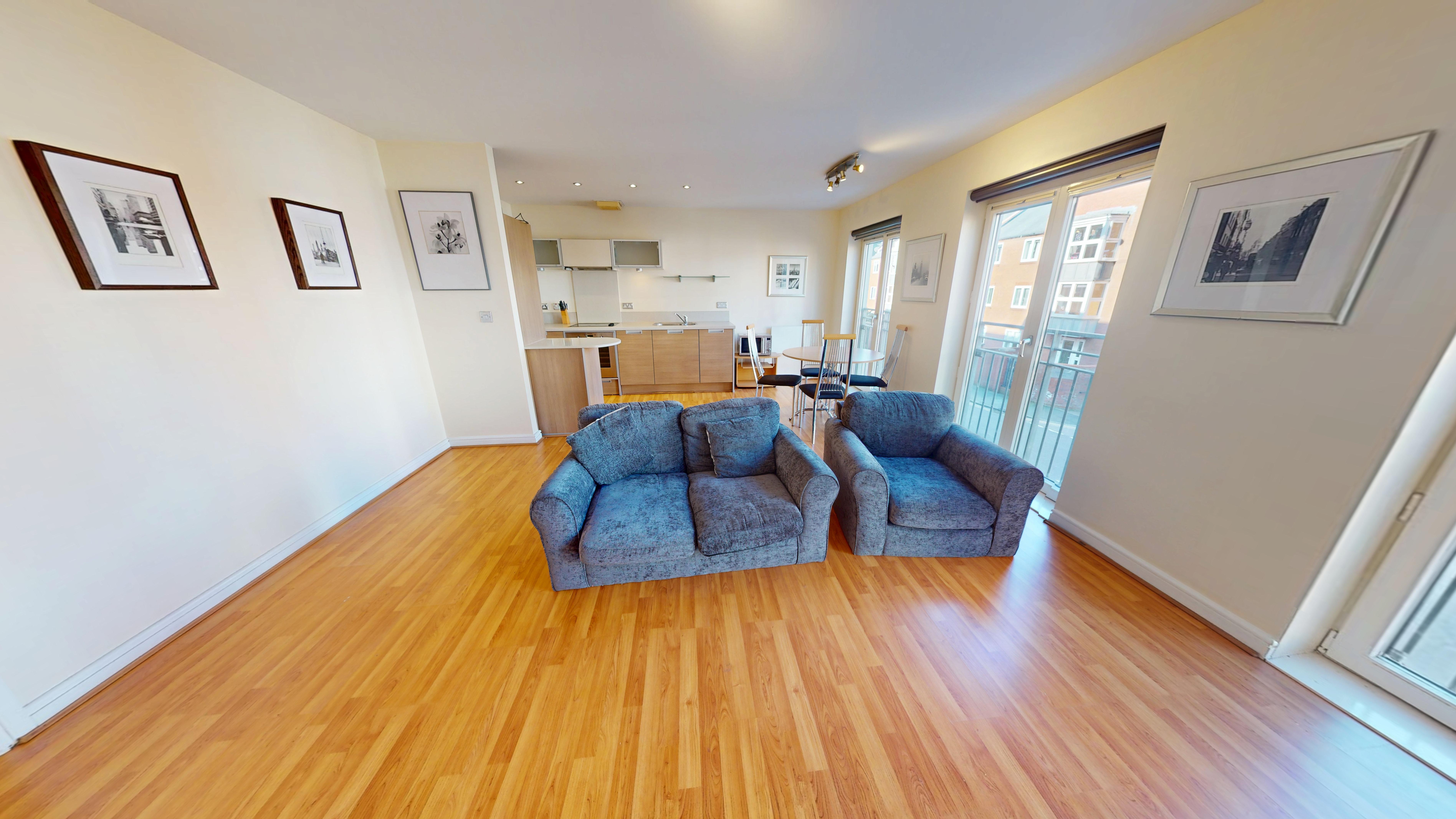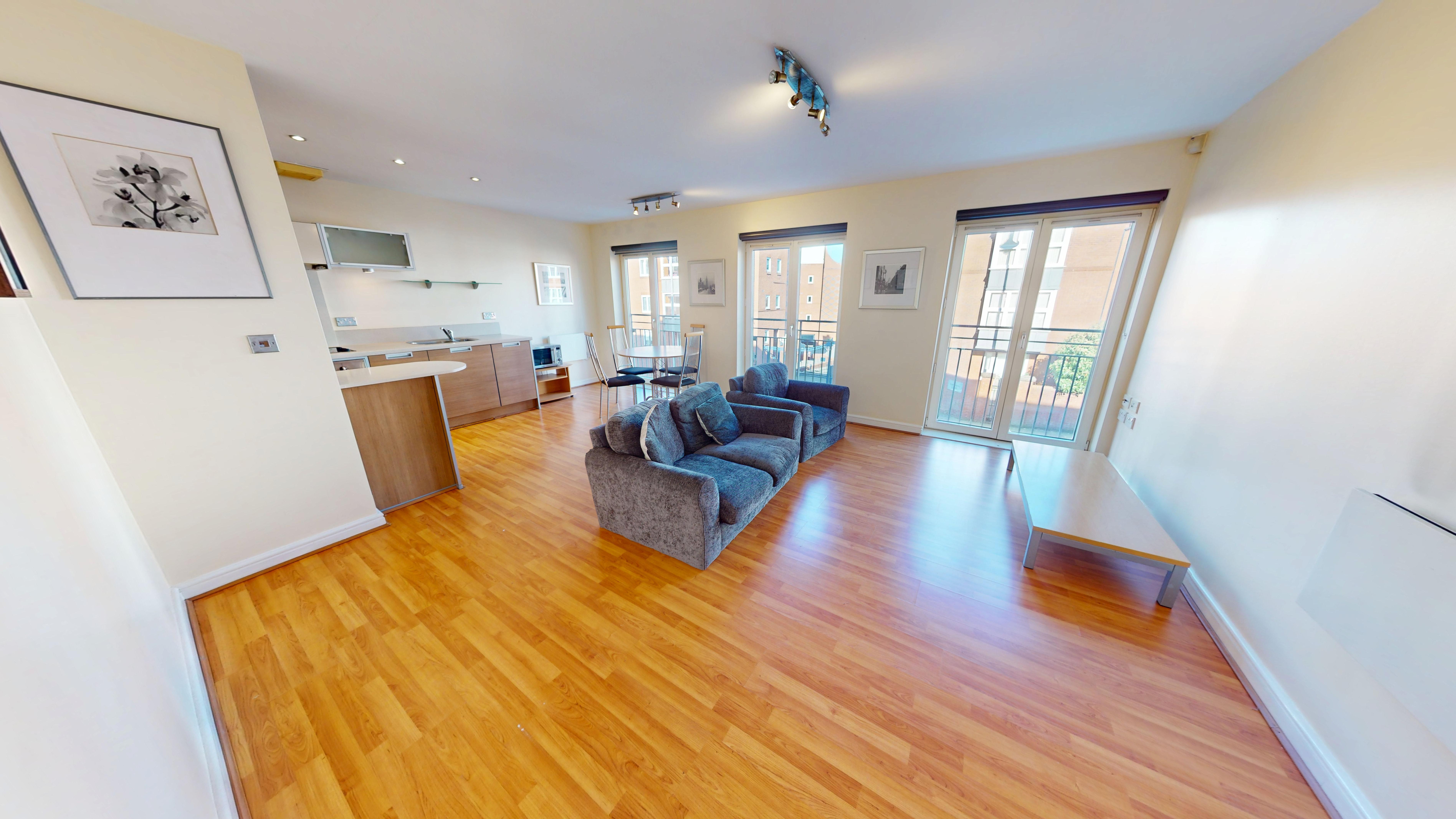 The apartment features a spacious open-plan living and dining area with ample natural light, enhanced by stylish Juliet balconies that provide an elegant outlook and a sense of openness. The contemporary kitchen is fully equipped with integrated appliances, sleek cabinetry, and generous worktop space, making it perfect for both every-day living and entertaining guests.