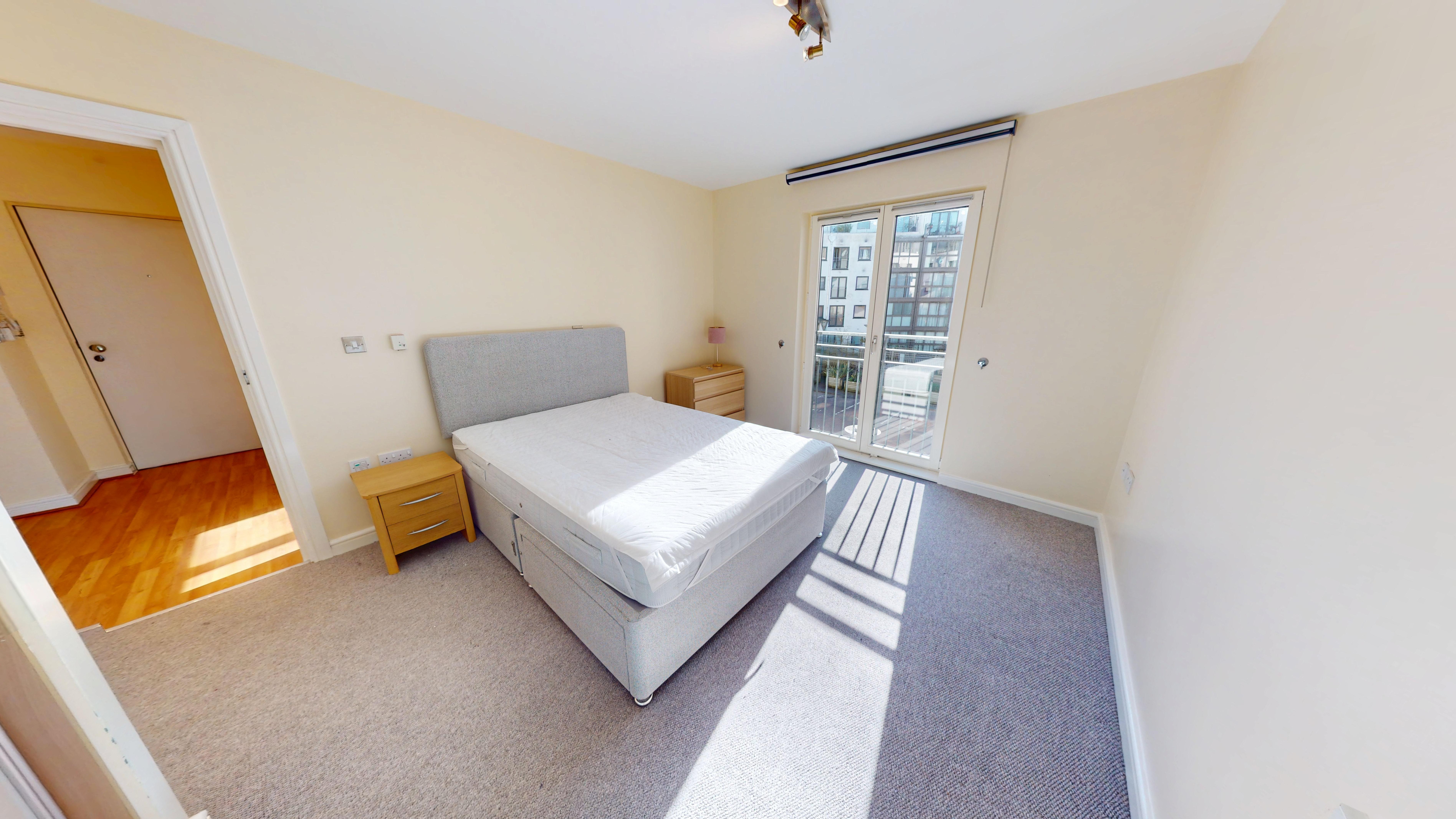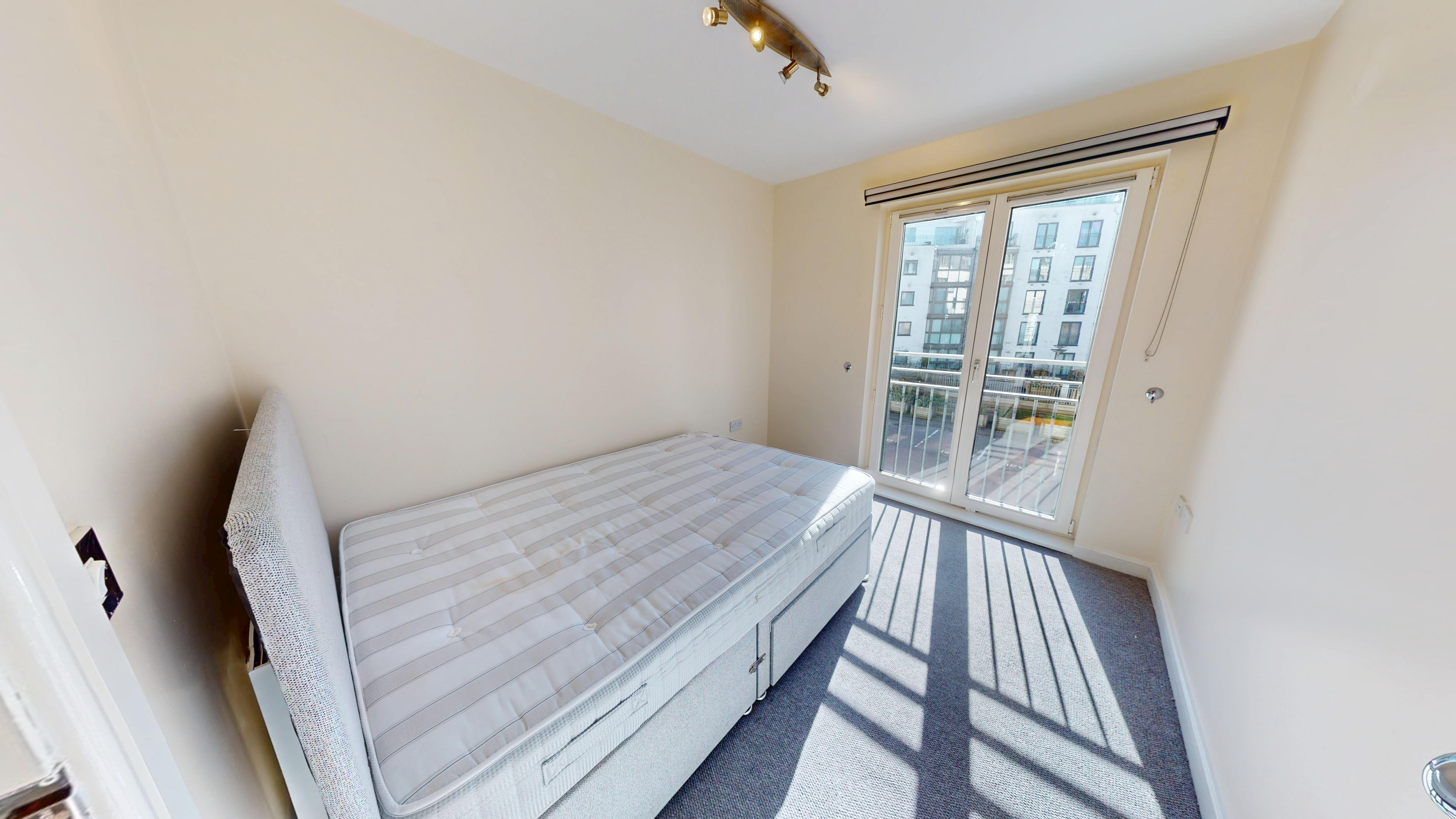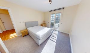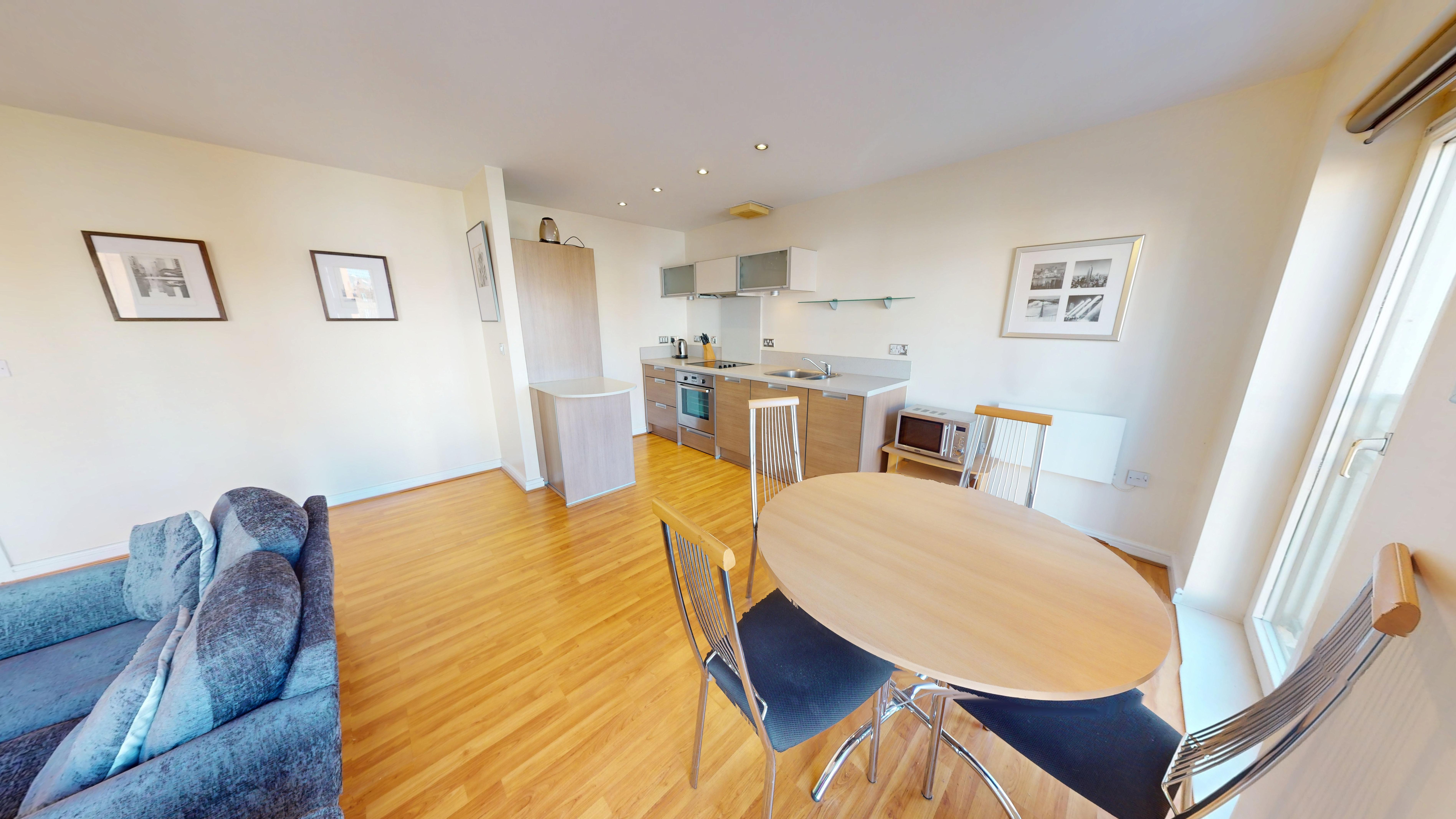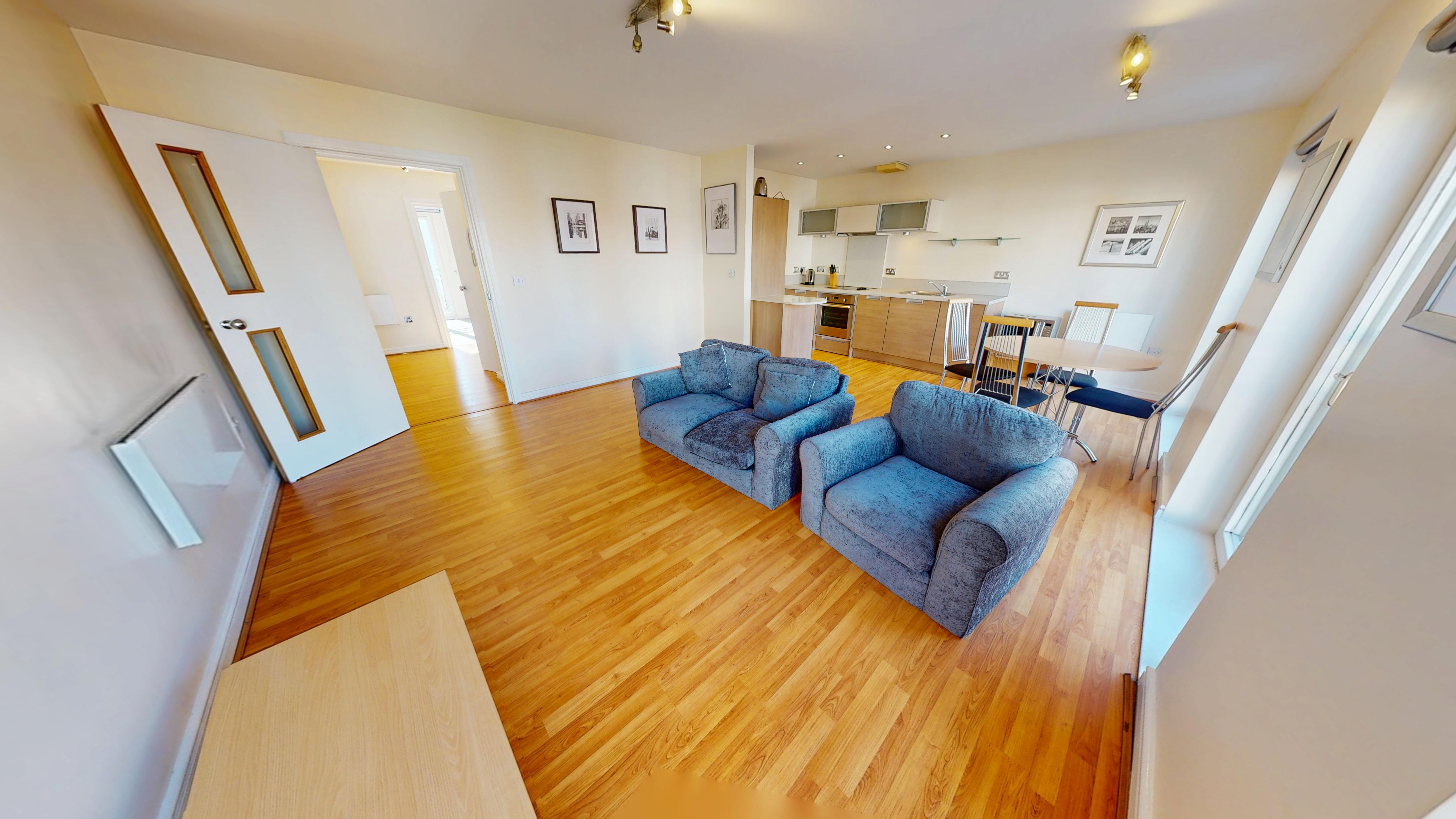 The apartment features a spacious open-plan living and dining area with ample natural light, enhanced by stylish Juliet balconies that provide an elegant outlook and a sense of openness. The contemporary kitchen is fully equipped with integrated appliances, sleek cabinetry, and generous worktop space, making it perfect for both every-day living and entertaining guests.