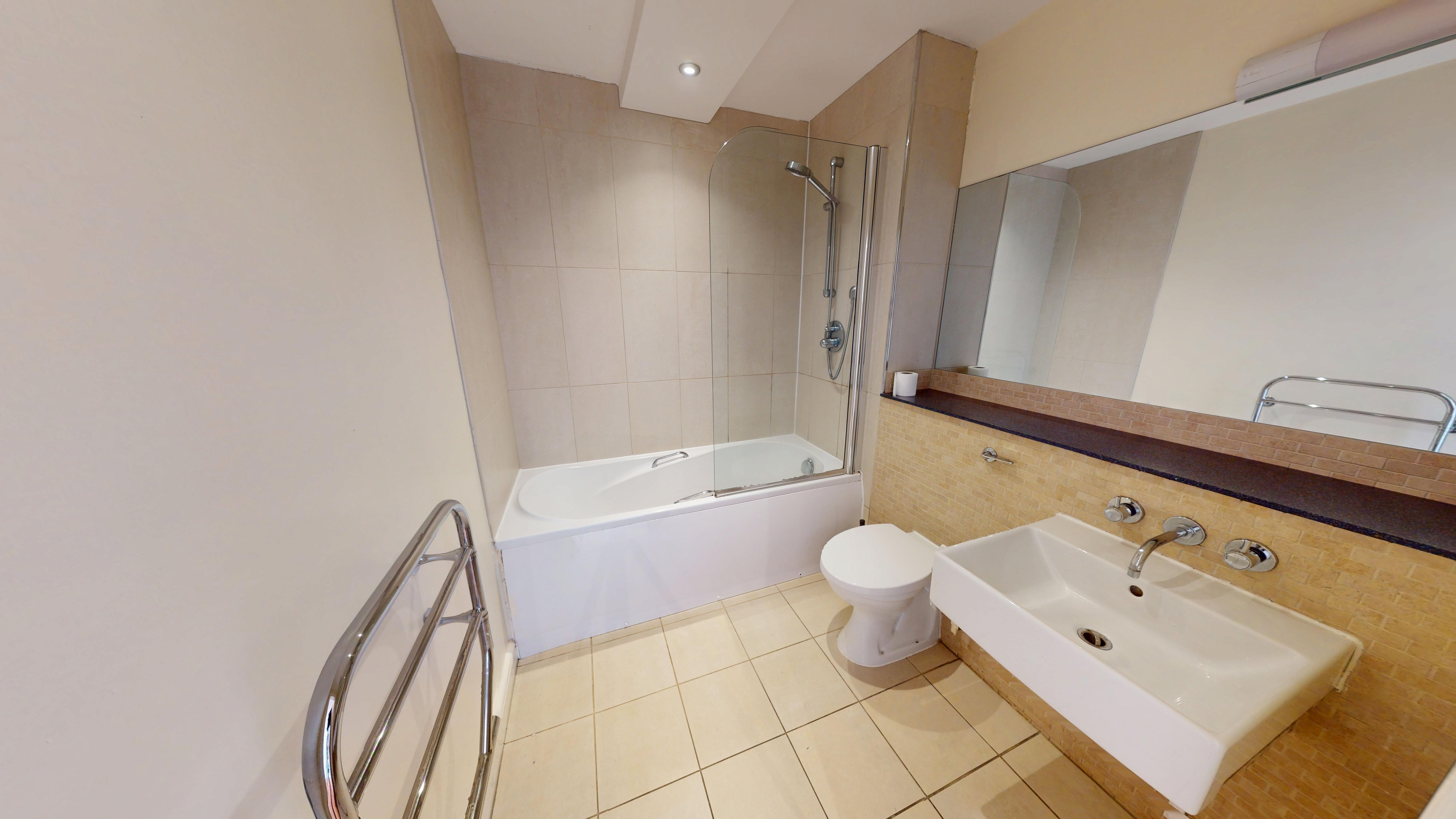 The modern bathroom is finished to a high standard, featuring a full-size bath and contemporary fixtures.