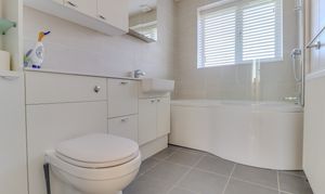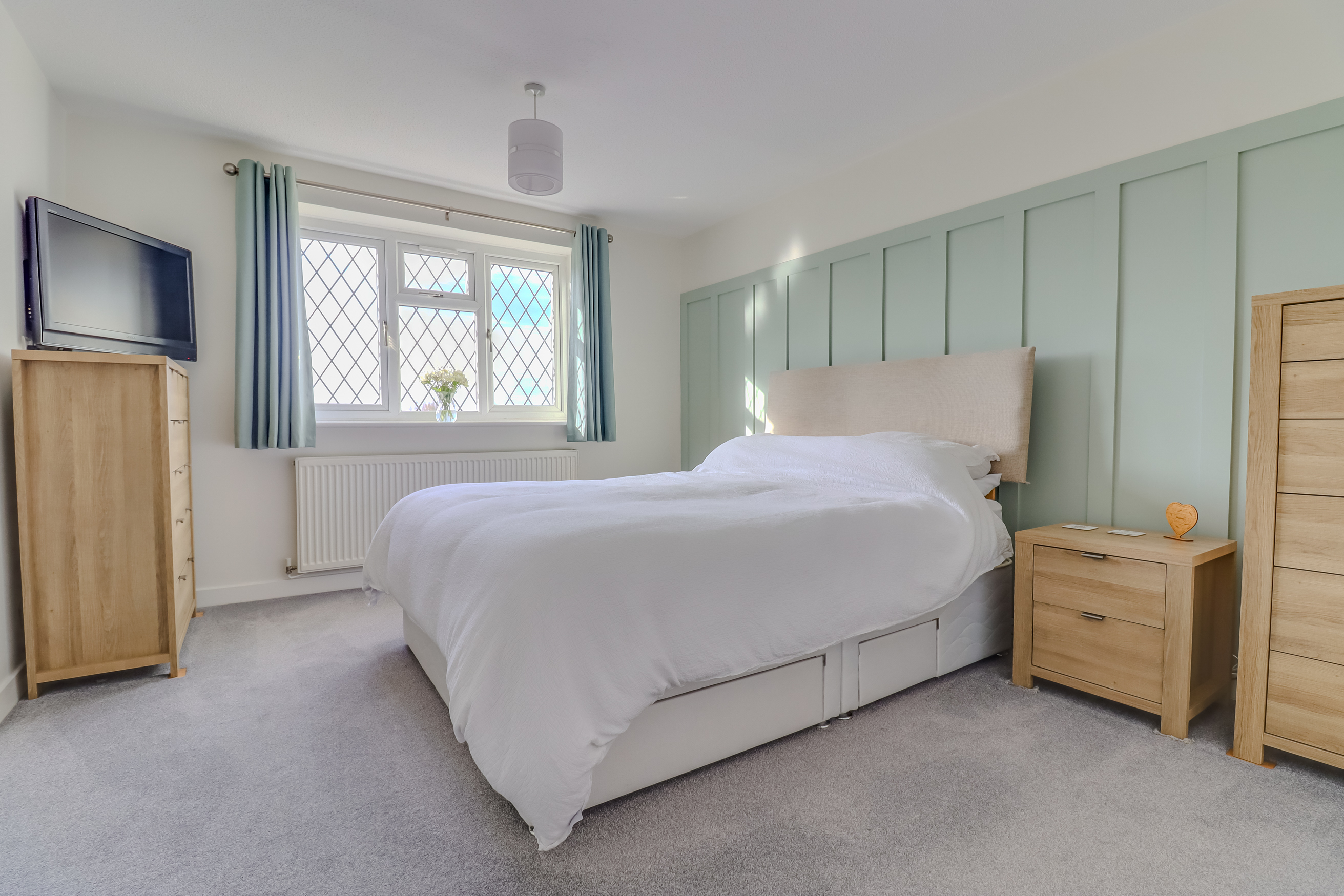Upstairs, the landing provides access to four well-proportioned bedrooms, two of which feature fitted wardrobes. The main bedroom enjoys an en-suite shower room, while the family bathroom is fitted with a white suite including a shower bath and vanity wash basin.