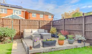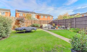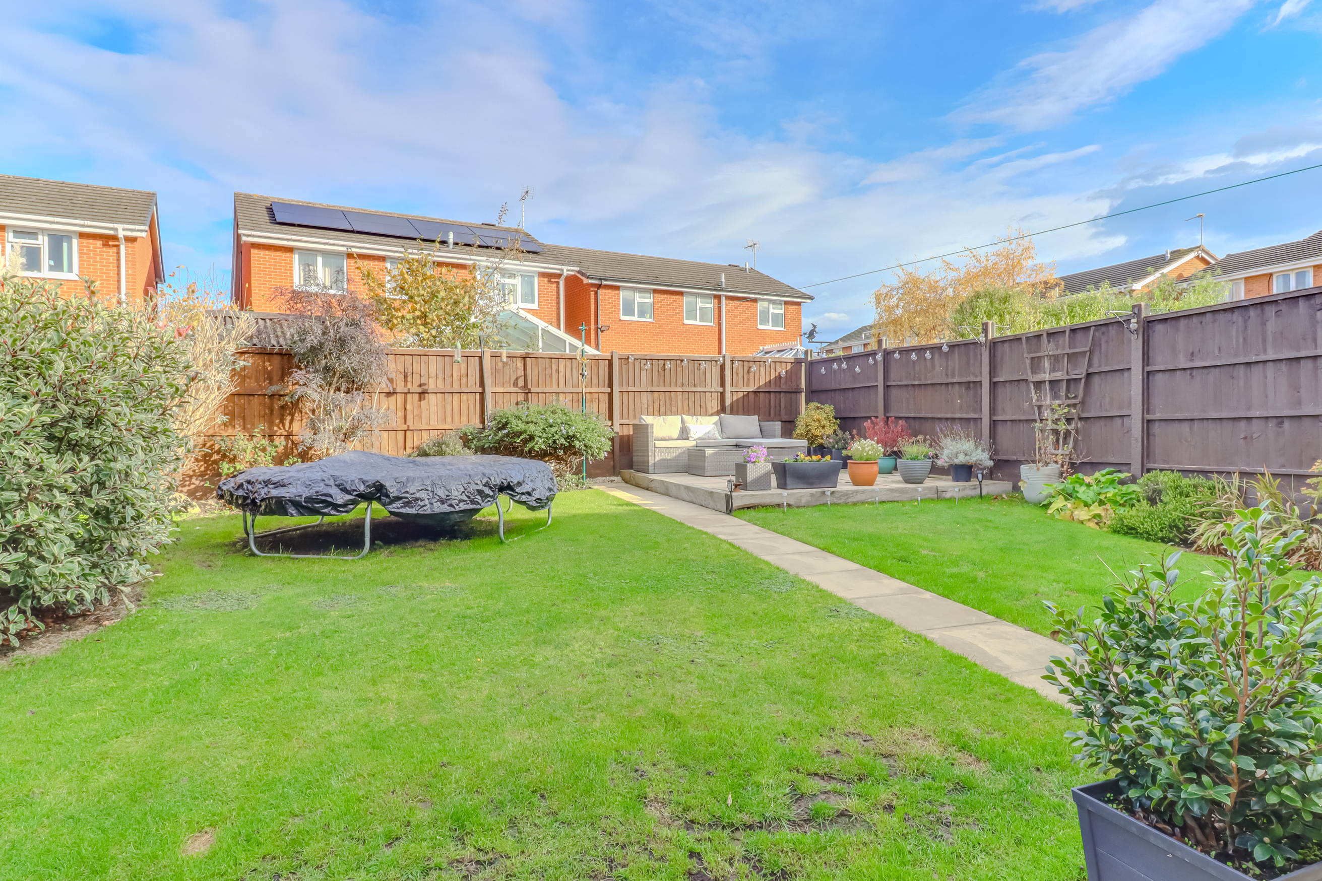 Externally, the property has an open-plan front garden with a lawn and a driveway providing off-road parking for two vehicles, leading to an attached single garage with power and lighting. The enclosed rear garden is a lovely private space with patio areas, a lawn, and fenced boundaries with side access.