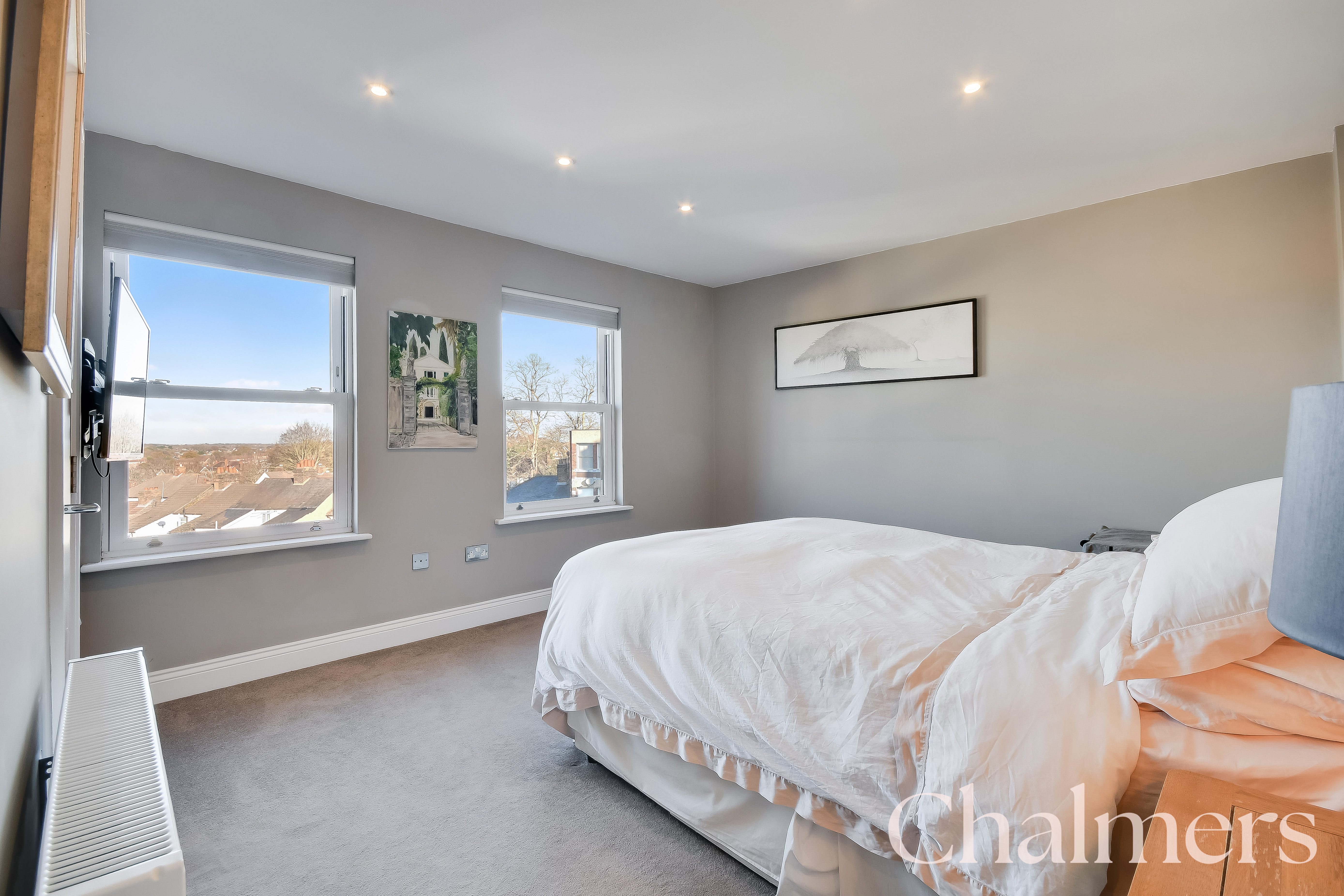 Large light bedroom with two large windows with views towards Weald Park. This bedroom has an ensuite shower room, with basin, vanity unit, heated towel rail and WC.