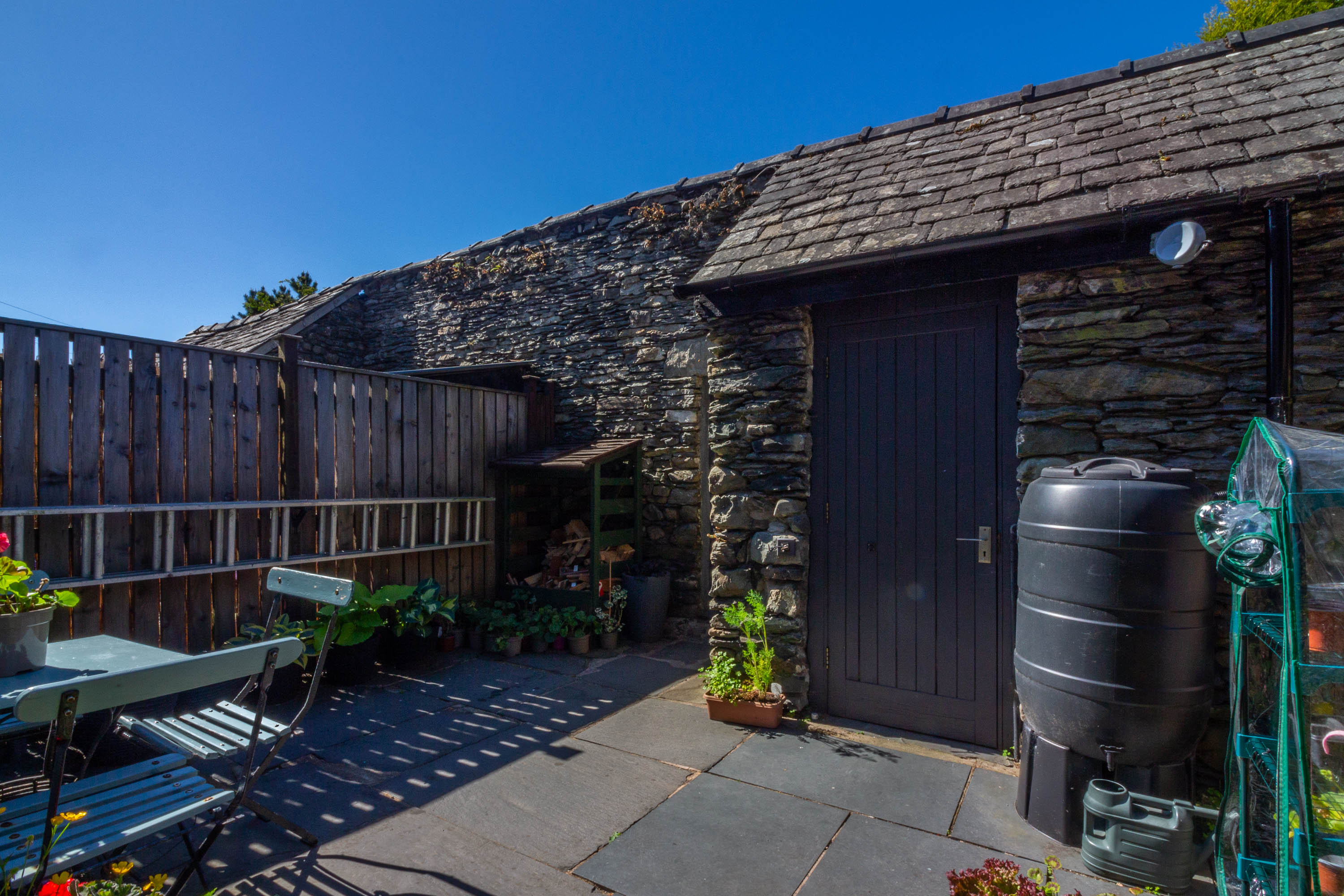 - Rear patio garden with outbuilding and coal store