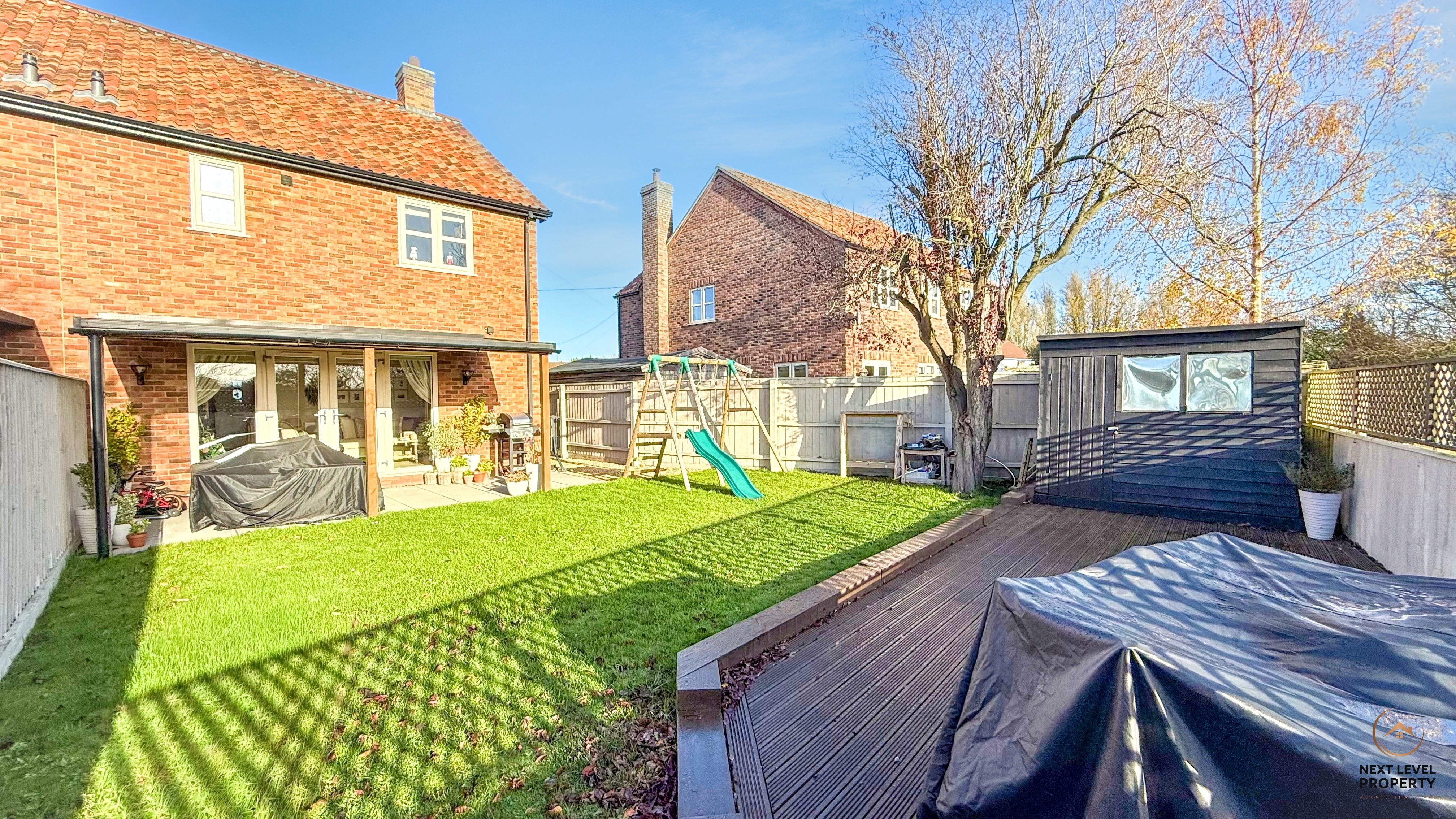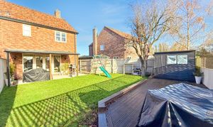 The rear garden is a standout feature — private, south facing and perfectly positioned for all-day sunshine. A generous patio and decked area offer ample space for outdoor dining, summer barbecues and warm-weather entertaining, while the lawn provides room for children to play or for relaxed gardening. A custom-built covered seating area creates the ideal spot for shaded summer lounging, evening drinks or year-round enjoyment, adding both character and practicality to the space. A useful garden shed provides excellent storage for tools, furniture and outdoor equipment. Beyond the boundary, lovely views over neighbouring horse paddocks enhance the sense of calm and countryside connection, making this a garden designed for comfort, lifestyle and relaxation.