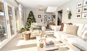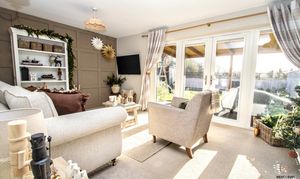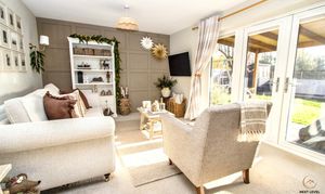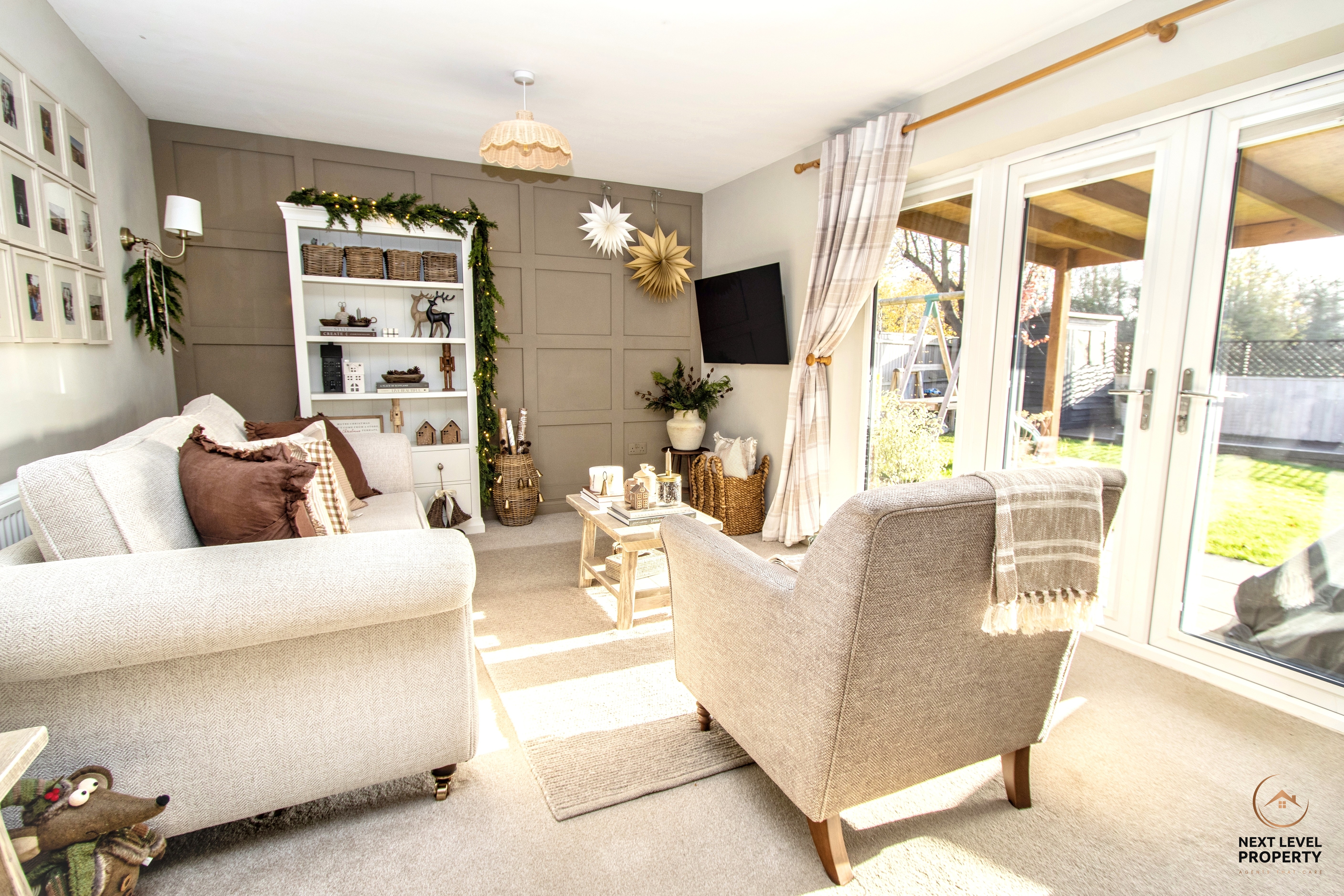 - Spacious and light-filled lounge featuring full-length windows and UPVC French doors that open directly to the rear garden for seamless indoor-outdoor living.