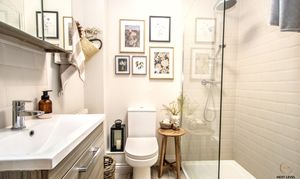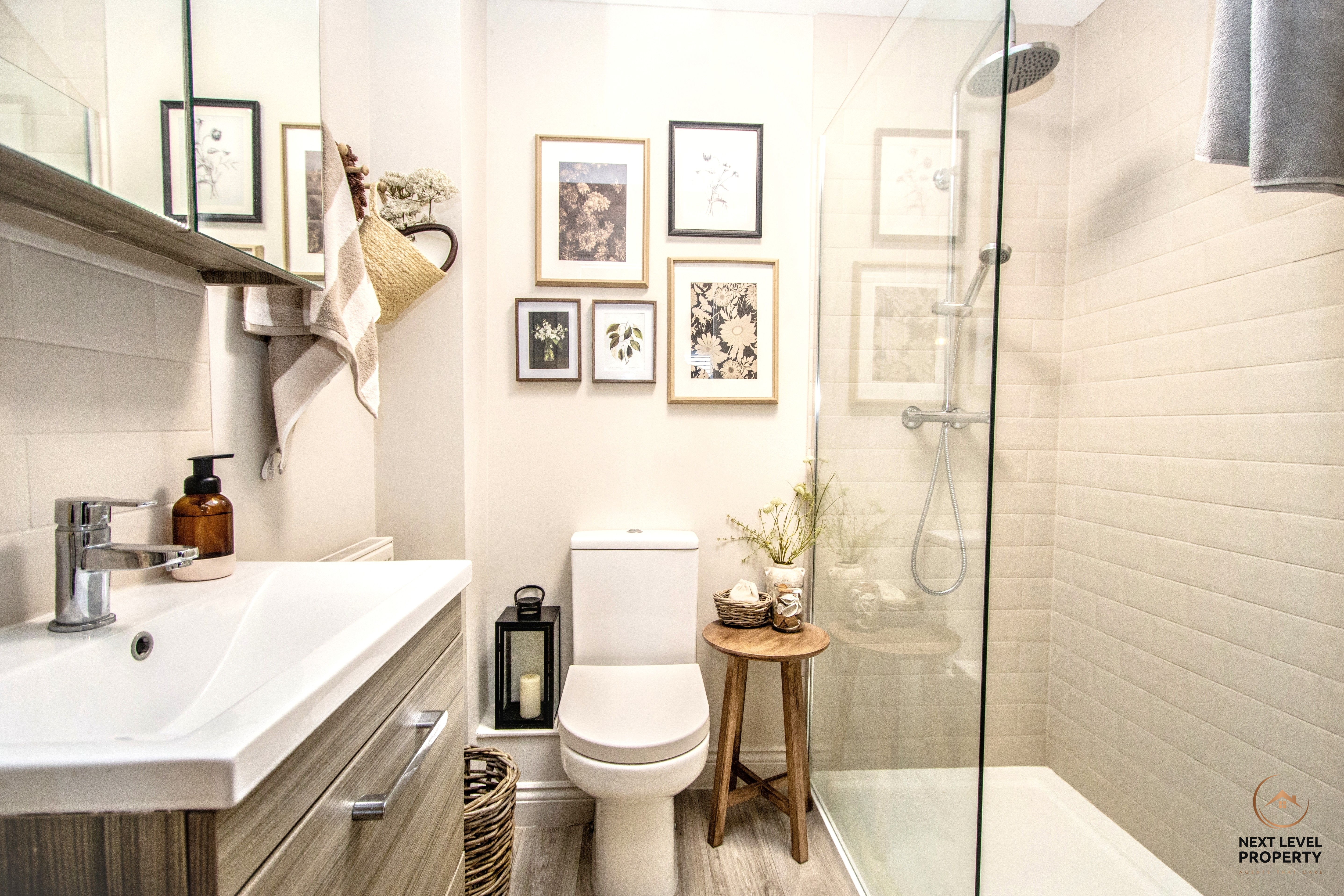 Bedroom 1 is a generous double, styled with tasteful feature panelling and a UPVC double-glazed window to the front that frames the natural light beautifully. A door leads directly into the en-suite, adding privacy and convenience to this calm, well-proportioned room. The en-suite shower room features a spacious walk-in shower with a sleek glass screen, complemented by modern tiled splashbacks for a crisp, stylish finish. A hand basin is set neatly into a vanity storage unit, keeping everyday essentials organised while maintaining a clean, contemporary look.