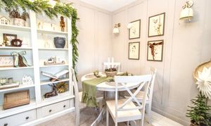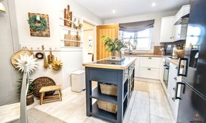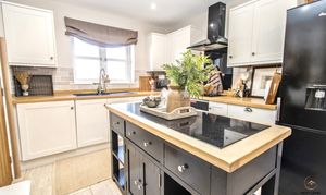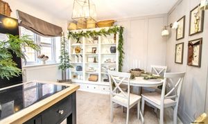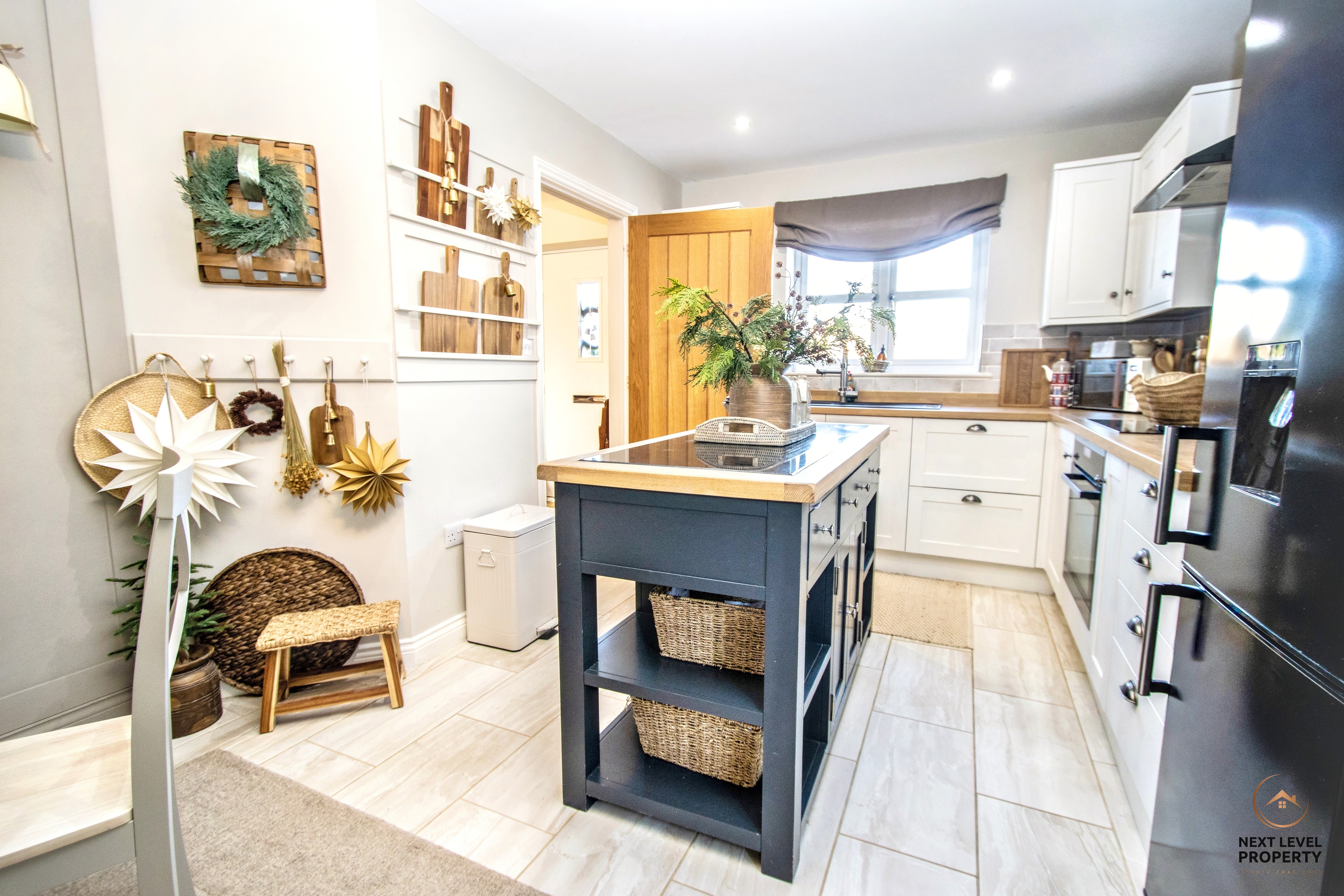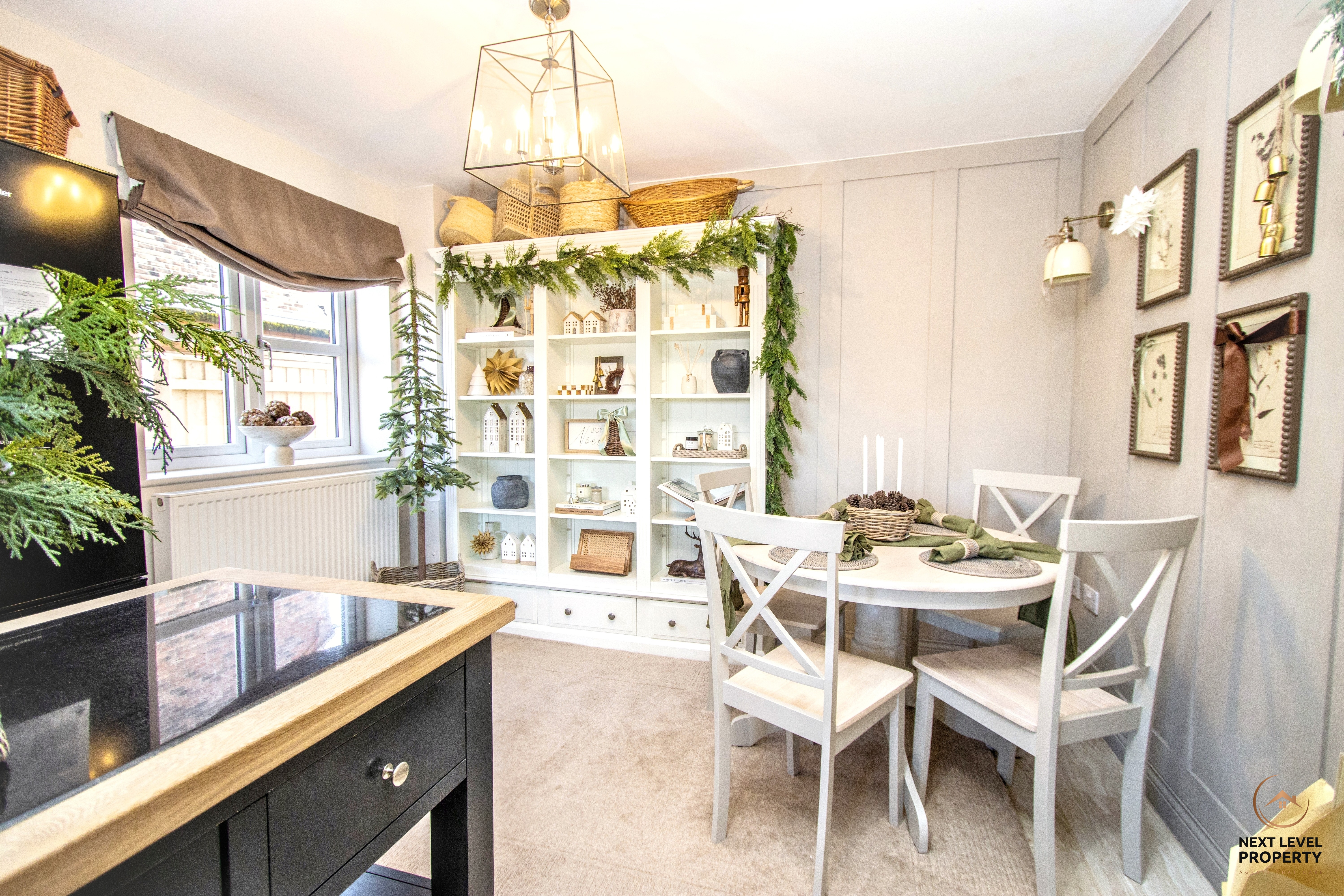 The kitchen/diner is a bright and beautifully composed space, a perfect blend of contemporary style and everyday function. Two feature-panelled walls frame the dining area, creating a warm, sociable atmosphere ideal for family meals and relaxed entertaining. At the heart of the kitchen sits a central island topped with gleaming granite, offering generous prep space, drawer storage and charming basket shelving beneath. Fully fitted units run seamlessly along the walls, finished with a solid wood work surface for a natural, tactile feel. Integrated appliances include an oven, ceramic hob and dishwasher, while a striking black inset sink with a spring-neck mixer tap adds a modern edge. Tiled splashbacks, cool tiled flooring and UPVC double-glazed windows to the front and side enhance the sense of light and practicality, completing a space designed to be both stylish and effortless to live in.