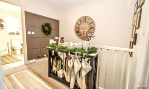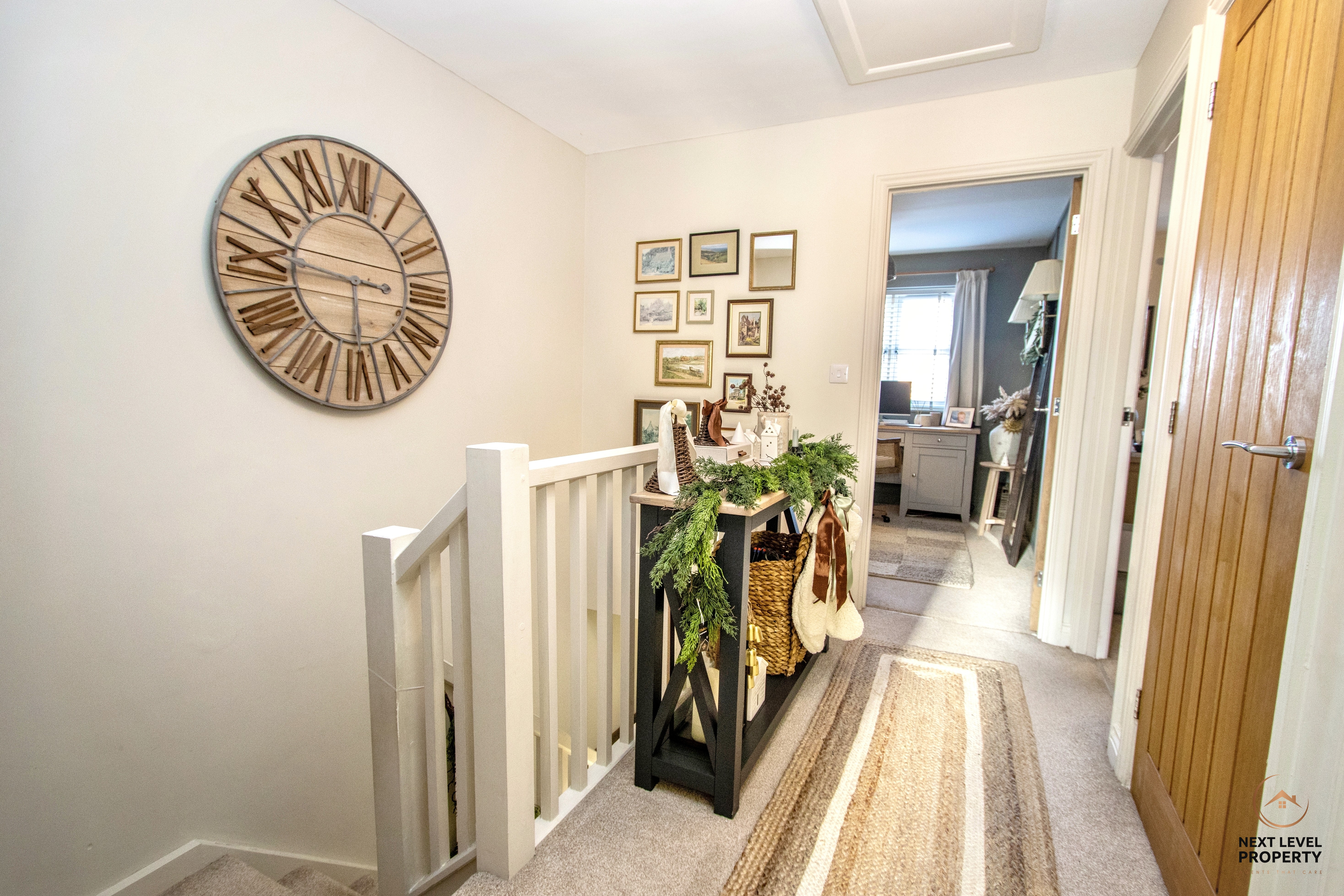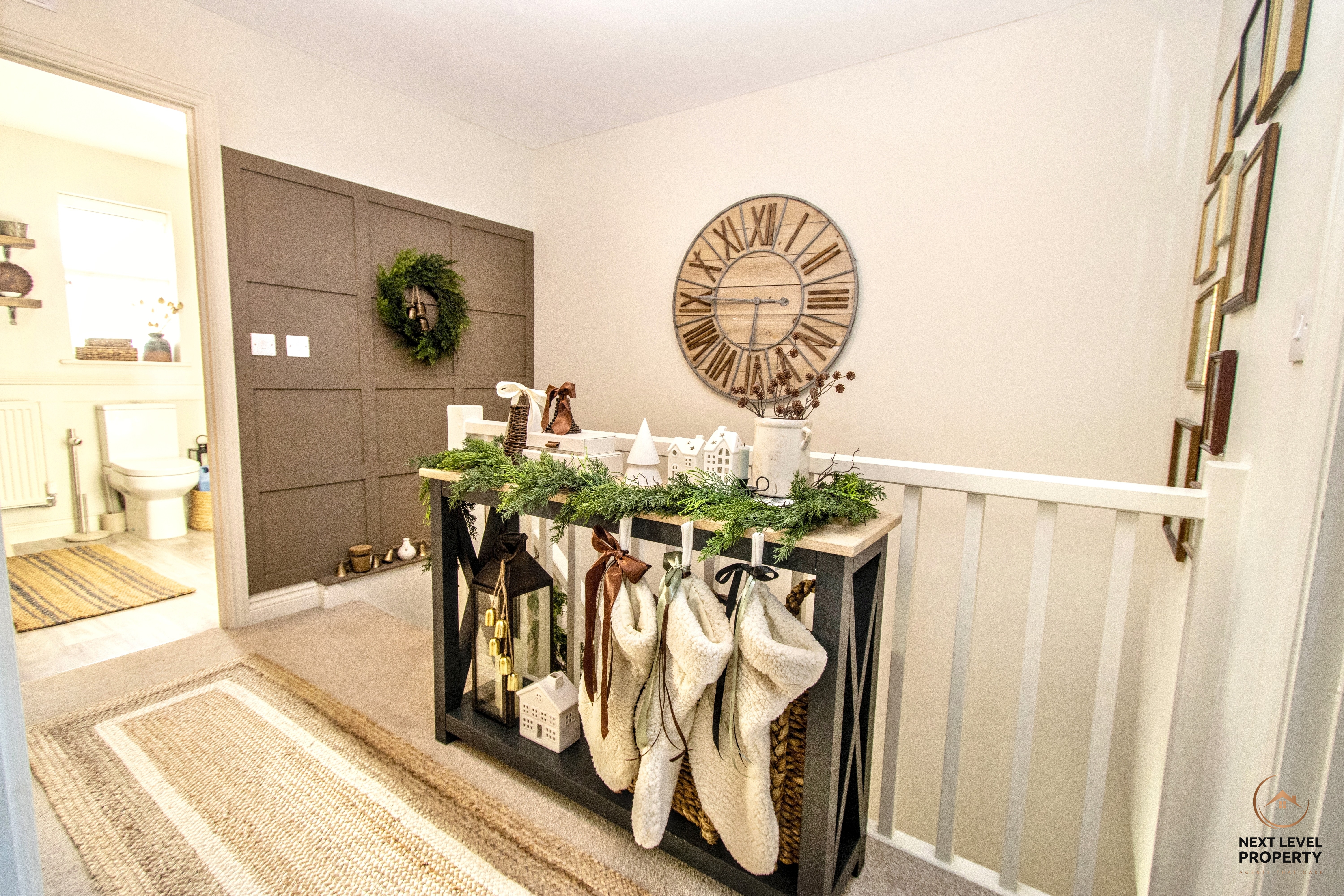 The spacious landing feels open and inviting, finished with stylish feature panelling and oak doors leading to each bedroom and the bathroom. Practical touches include an airing cupboard and convenient loft access, ensuring storage is neatly accommodated without compromising the clean, contemporary feel of the space.