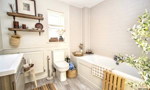 The family bathroom is stylishly finished, featuring a fitted bath along with a close-coupled WC and a hand basin set neatly into a vanity unit for practical storage. LVT flooring adds a contemporary touch underfoot, while a radiator keeps the space cosy and comfortable. A UPVC double-glazed window to the rear allows natural light to brighten the room, creating a calm, refreshing space for everyday routines.