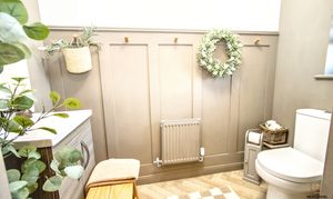 The cloakroom is thoughtfully designed with a modern close-coupled WC and a sleek vanity-set hand basin. Feature wall panelling with wooden coat hooks brings style and practicality together, while a wall-mounted mirror and front-facing UPVC window ensure the space feels bright, fresh and inviting.