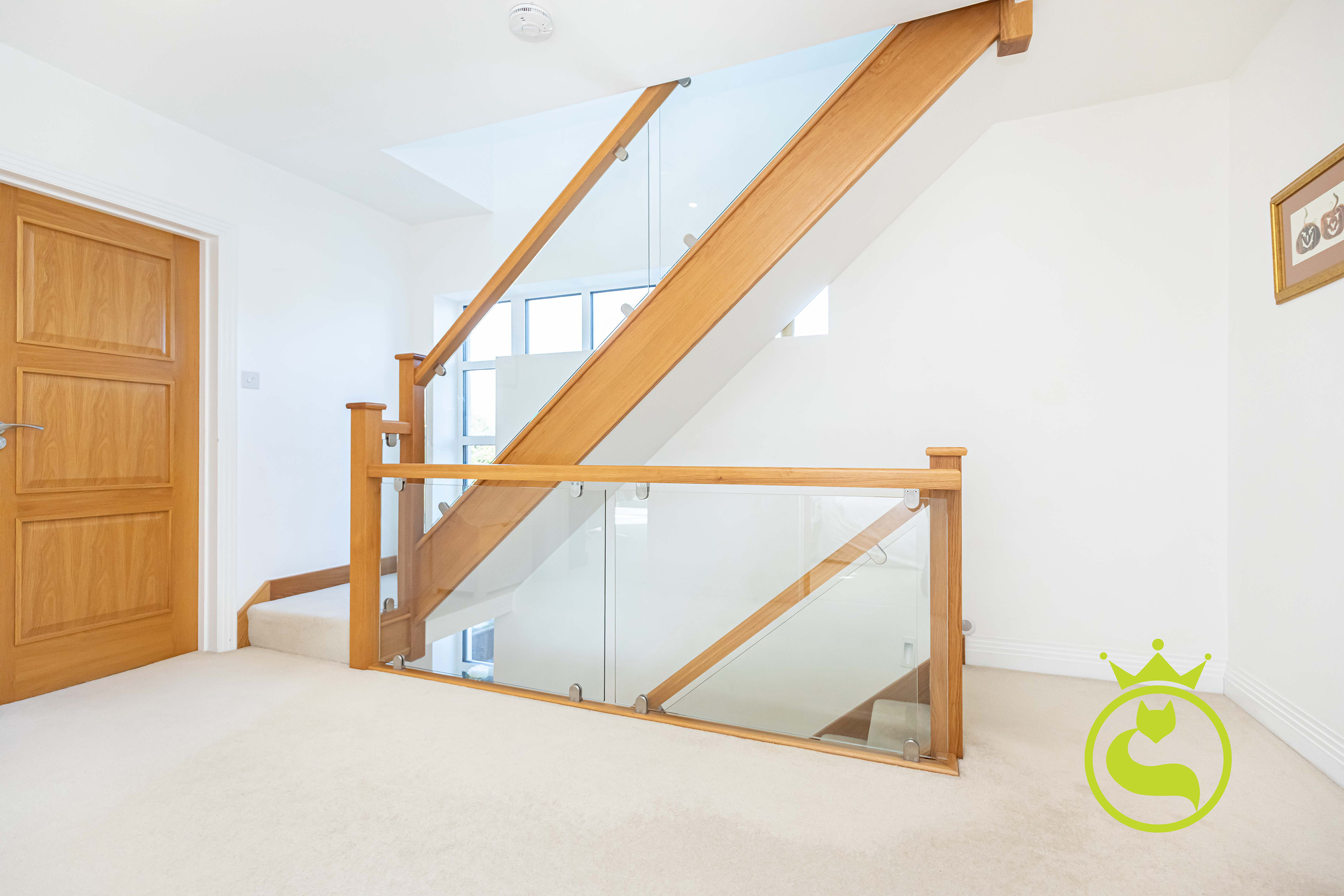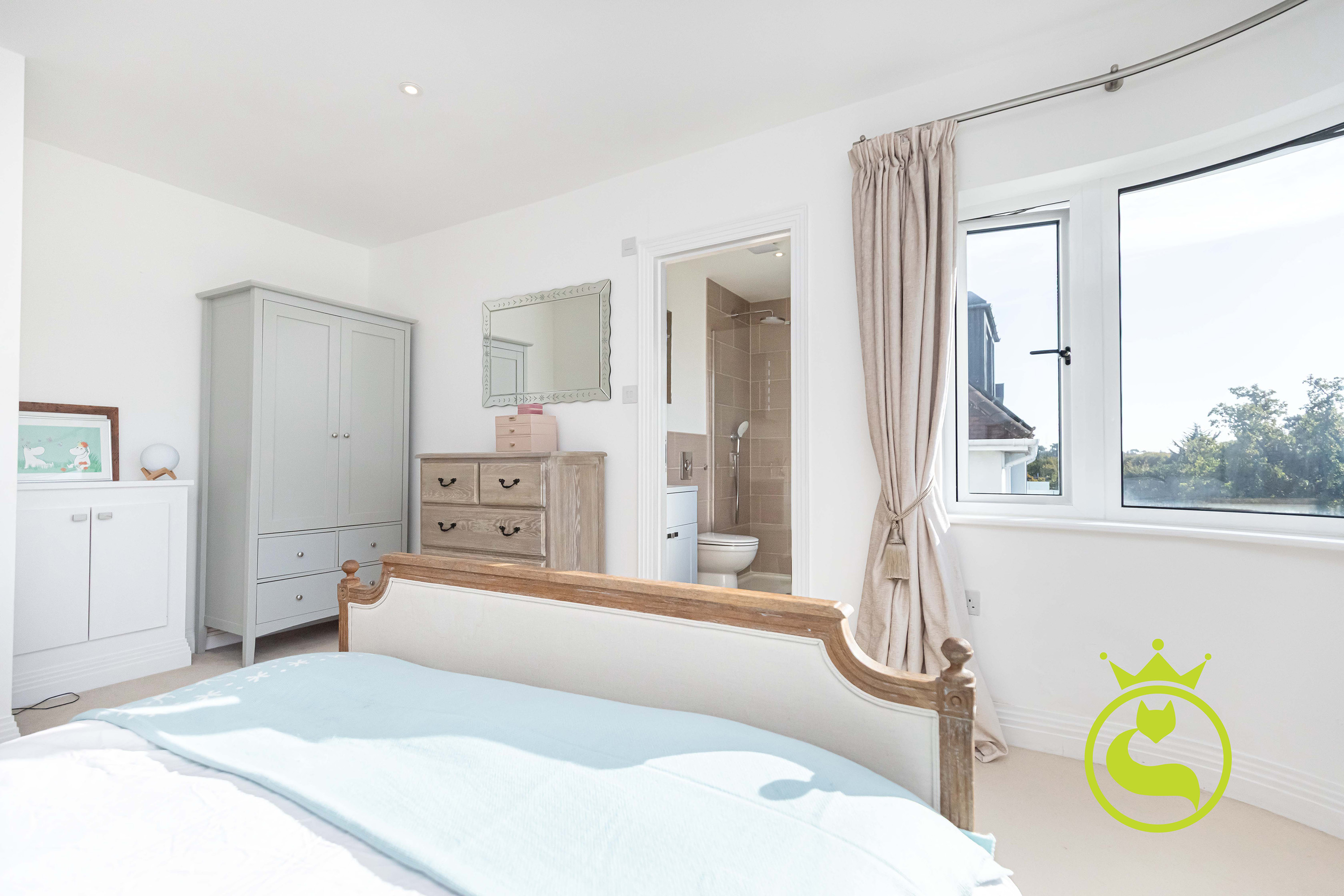 The first floor hosts three generous double bedrooms, two of which boast luxurious en-suites. One bedroom enjoys direct access to a private south-westerly-facing balcony, ideal for morning coffee or evening sunsets. A beautifully designed family bathroom completes this level.