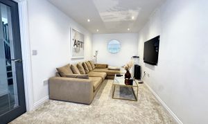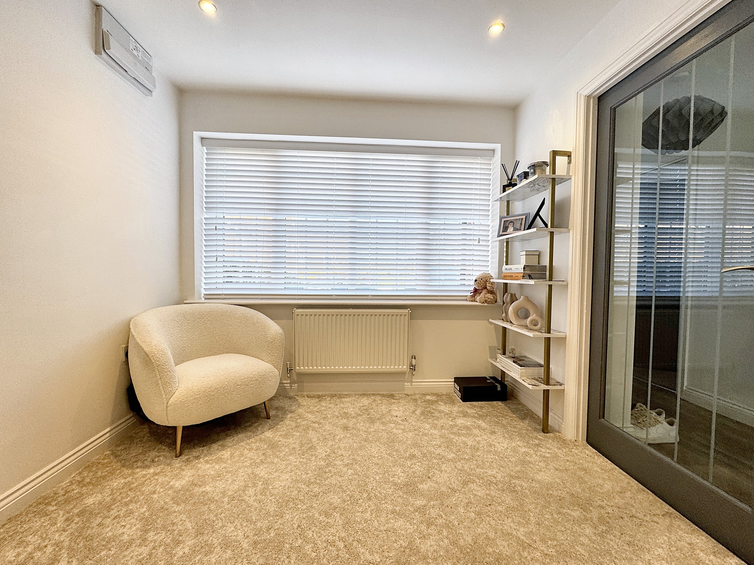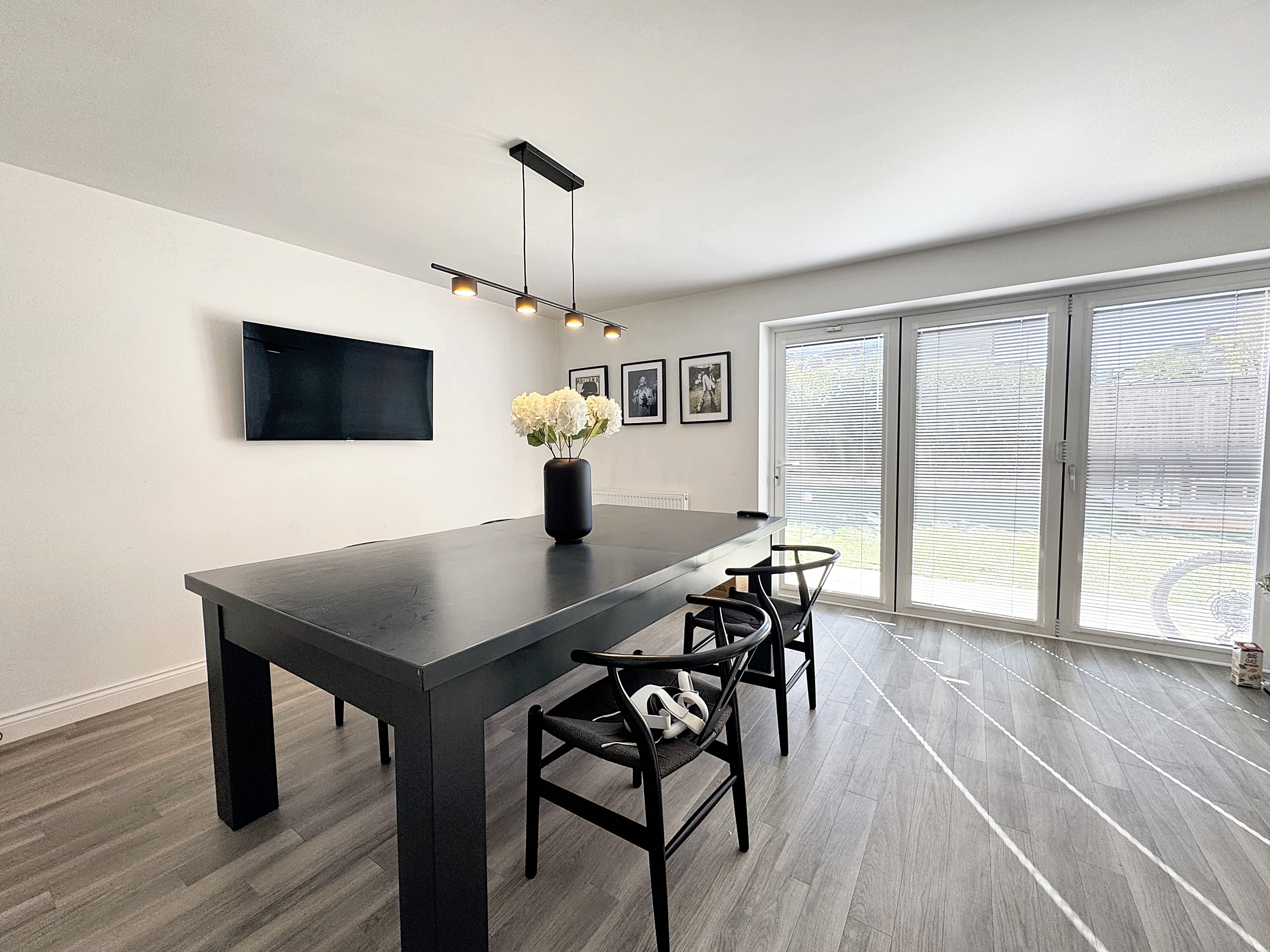 Upon entry, the property greets you with a sense of space and light, showcased by the open plan kitchen/diner featuring sleek modern finishes and bi-folding doors that seamlessly merge indoor and outdoor living. A separate, spacious lounge and additional study/play room.