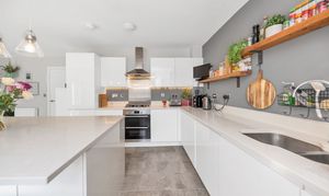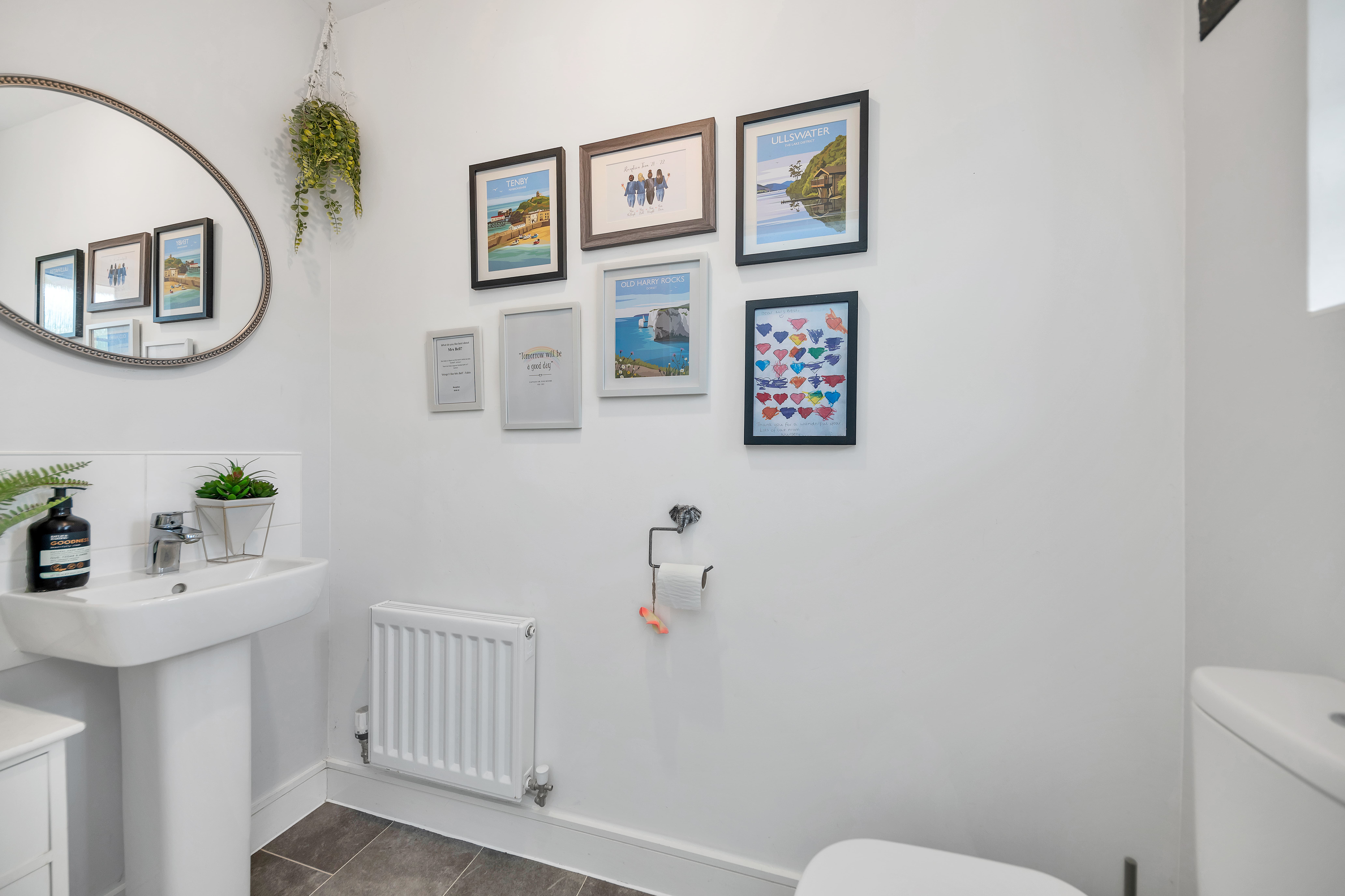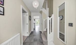 This modern detached family property enjoys excellent kerb appeal, with a tidy and attractive frontage, a front garden with a bed of shrubs, and side access to the rear. Upon stepping inside, the entrance hallway is welcoming and bright, with tiled flooring, pendant lighting, integrated storage, neutral decor, stairs to the first floor, and access through to the downstairs living space, including a cloakroom WC.