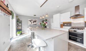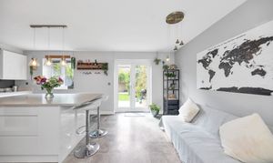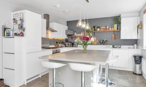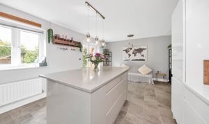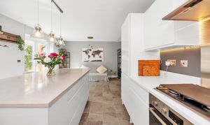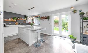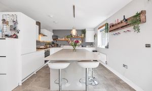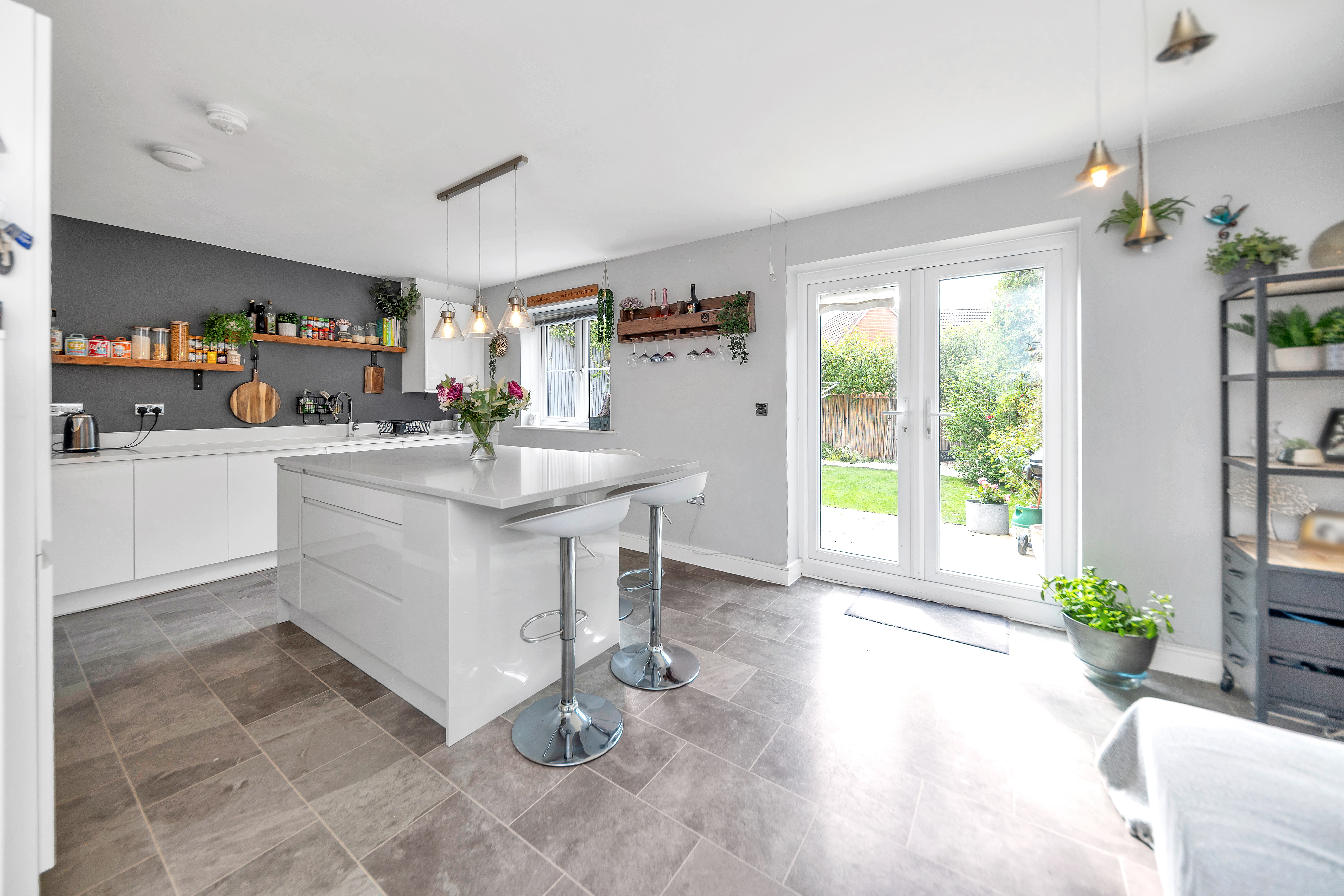 The kitchen/dining room is wonderfully open-plan, benefiting from a window and double French doors to a garden aspect, a range of modern base and wall units, composite worktops, a large kitchen island/breakfast bar, tiled flooring, pendant and under-cabinet lighting, an integrated double oven, gas hob, dishwasher and fridge/freezer, and space for a dining setting, seating and further small kitchen appliances.