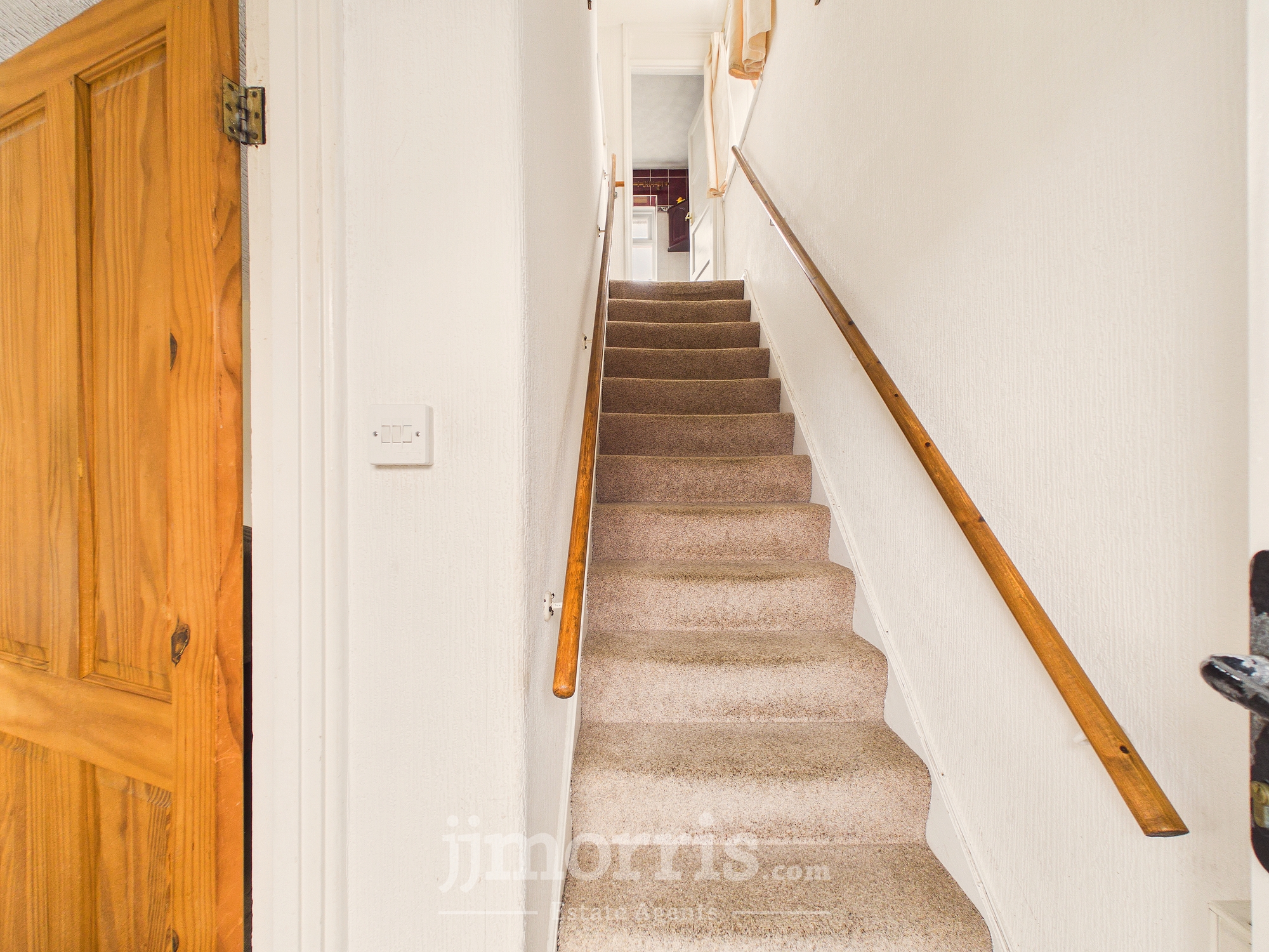 With fitted carpet, double panelled radiator, ceiling light, staircase to First Floor and pine door to:-