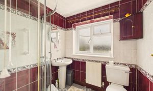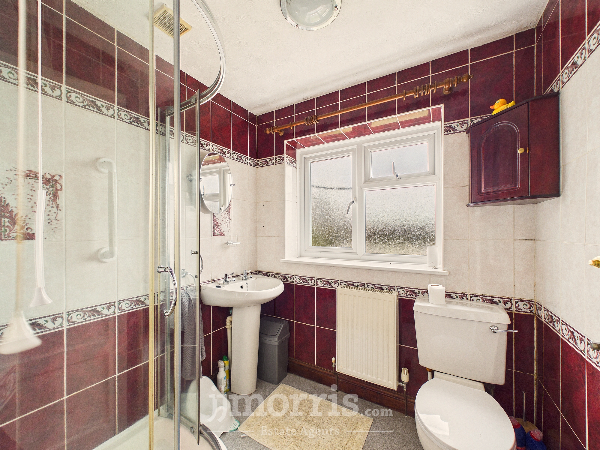 With vinyl floor covering, uPVC double glazed window, white suite of WC, Wash Hand Basin and a glazed and tiled Quadrant Shower with a Mira Advance electric shower, bathroom cabinet, toilet roll holder, wall mirror, toothbrush holder and a towel rail.