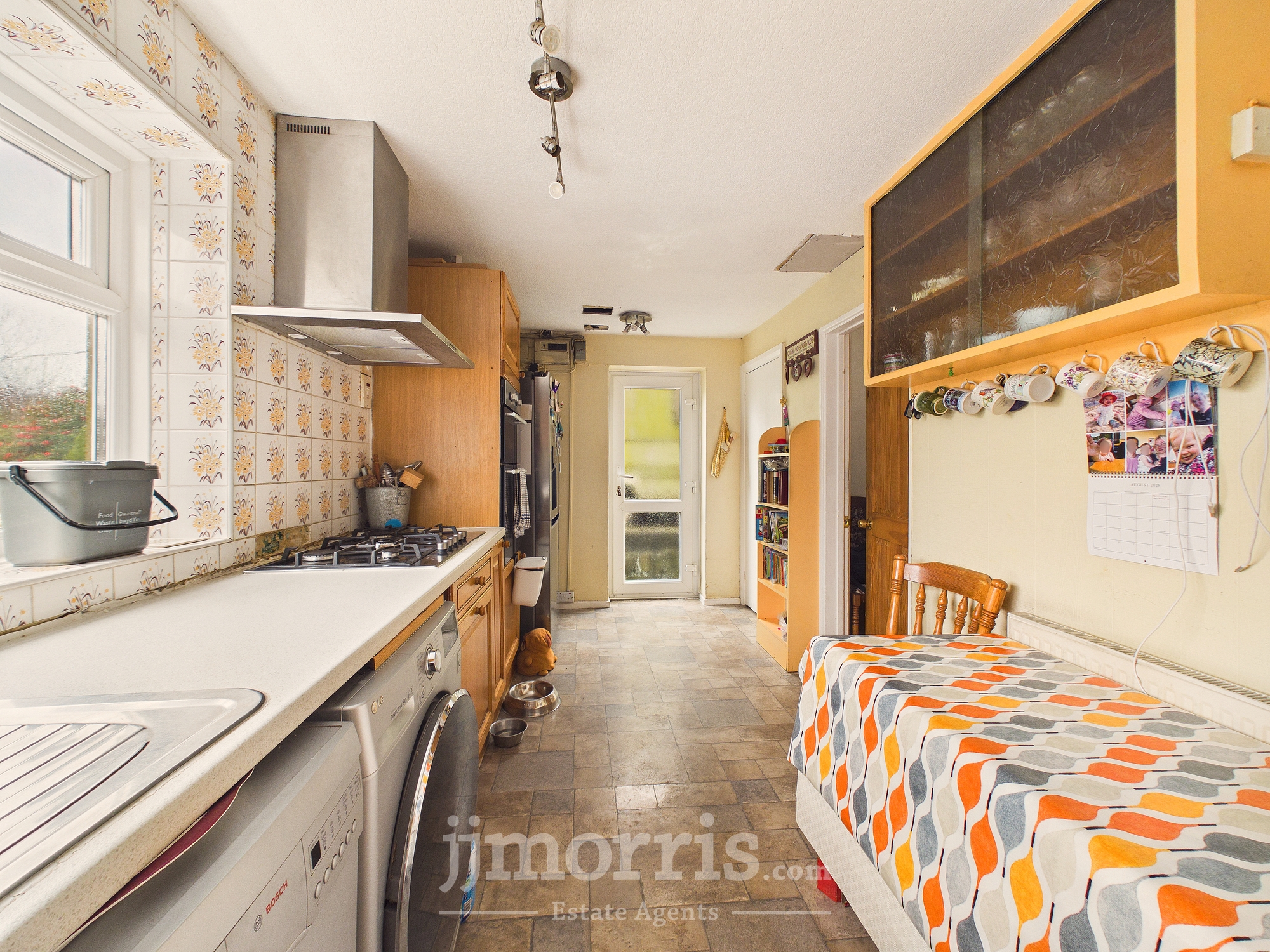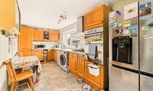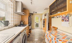 With vinyl floor covering, range of Oak floor and wall cupboards, inset single drainer stainless steel sink unit with mixer tap, 5 ring Gas Cooker Hob, built in eye level Double Oven, 4 ceiling spotlight and a 3 ceiling spotlight, uPVC double glazed window overlooking rear garden, radiator, cooker box, 8 power points, plumbing for washing machine and dishwasher, electricity meter and consumer unit and door to a:-
