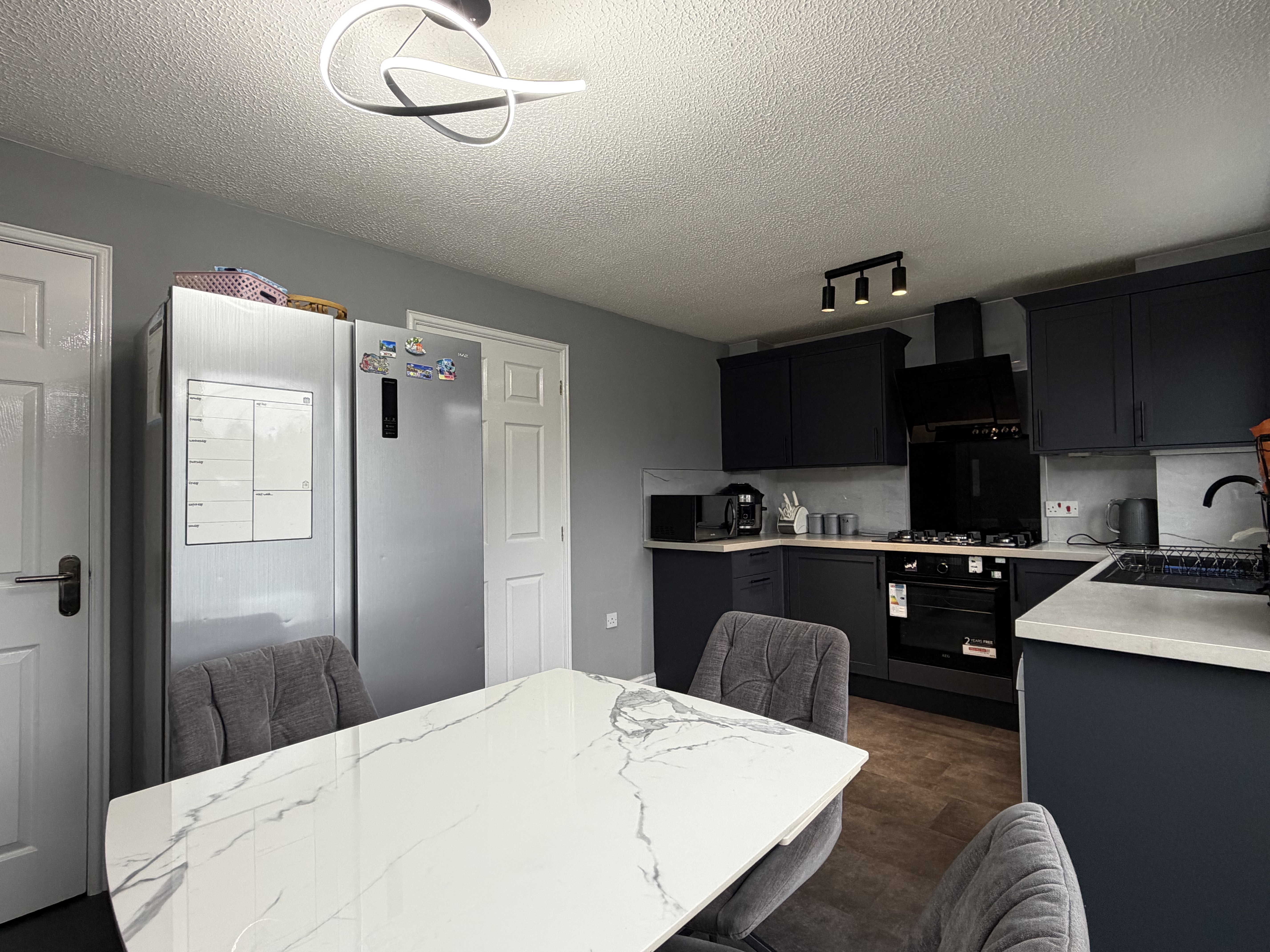 - Very recently refurbished kitchen diner with 5 burner gas hob, AEG oven, freestanding washing machine and dishwasher and an American fridge freezer