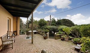 A few steps lead down a pathway to the front door and there is a front lawn. By the garage there is also a path to the side door where there is an outside tap. A path the other side of the house leads round to a side brick paved terrace where there are steps down to a corner level and steps to a rear brick paved patio where there is a door to the Annexe and another outside tap. Further steps lead down to a lawn with ornamental pond. There are sea views to the rear and side.