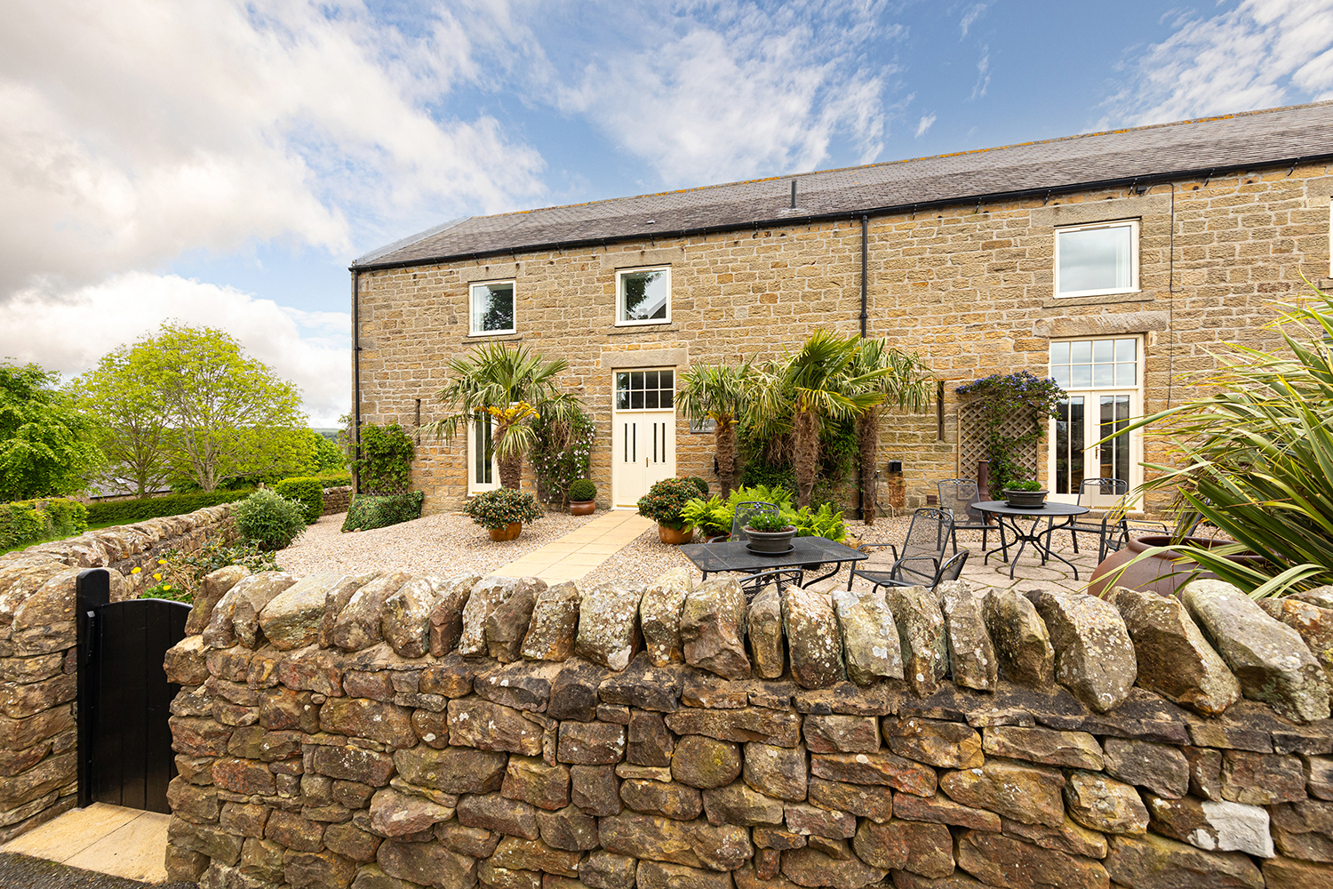 Six barn height double doors open to professionally landscaped, contemporary gardens arranged to the east and south, with wide views over a tributary of the Wansbeck and grazing farmland in the valley. The layout is intentionally low maintenance, using durable finishes and architectural planting for year-round structure, ideal for busy households who want impact without the upkeep. Palm trees and selected shrubs are set within easy care beds, all enclosed by traditional Northumbrian dry-stone walling. To the west, a large, shared courtyard offers privacy and additional space for relaxed outdoor living. Practical touches include fast fibre broadband, a PodPoint electric vehicle charging unit and a 5 kW backup generator.