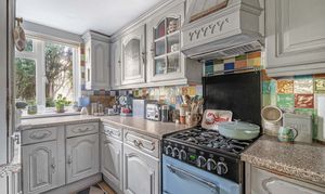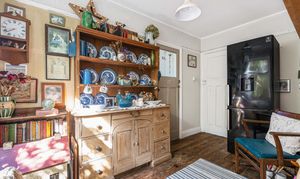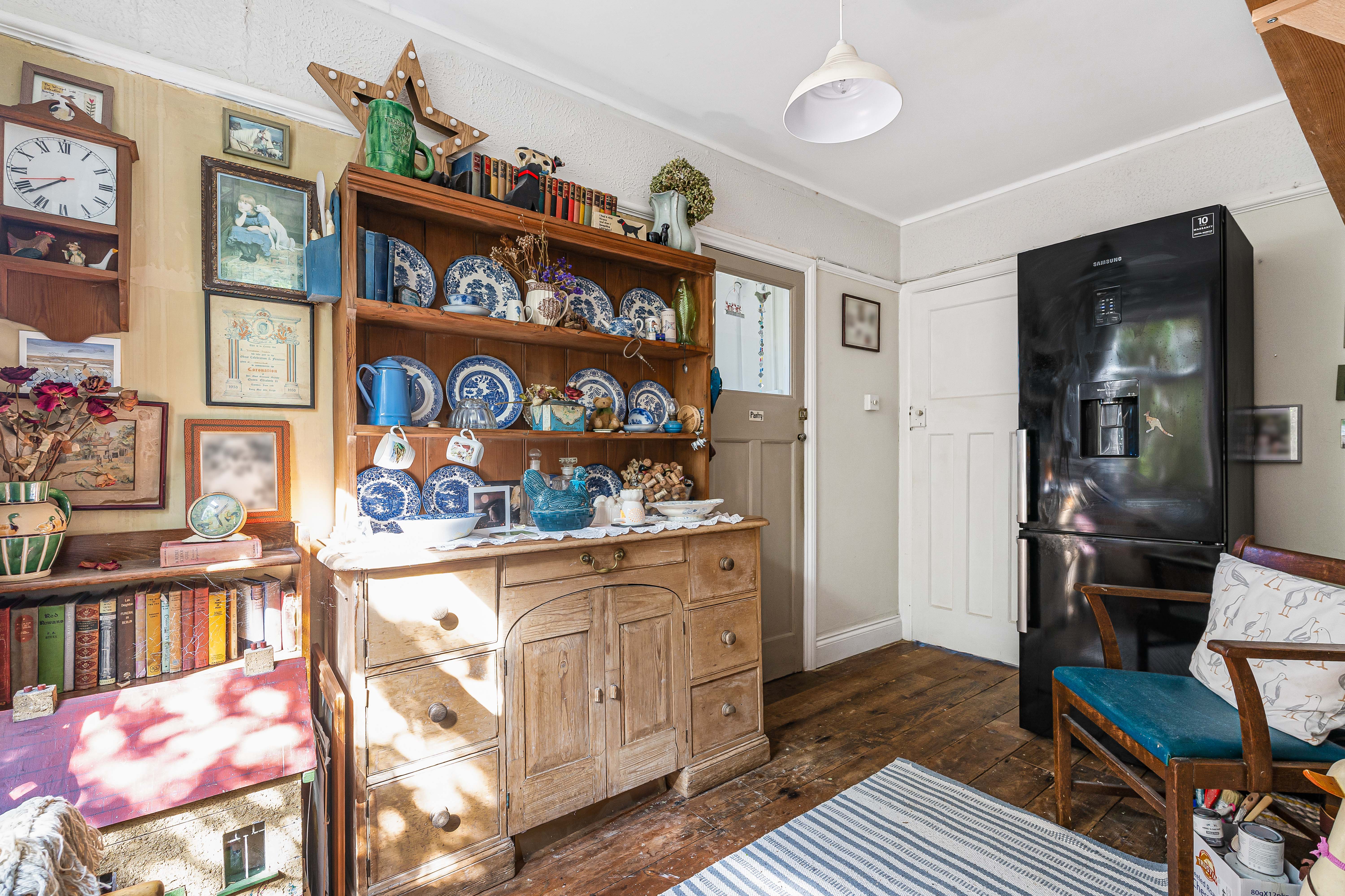 The kitchen is fitted with a range of base and wall units, worktop over, fitted one and a half bowl sink unit, integrated fridge and freezer, freestanding oven with hob and extractor canopy above, window to the rear lobby, window to the side, built in larder cupboard.