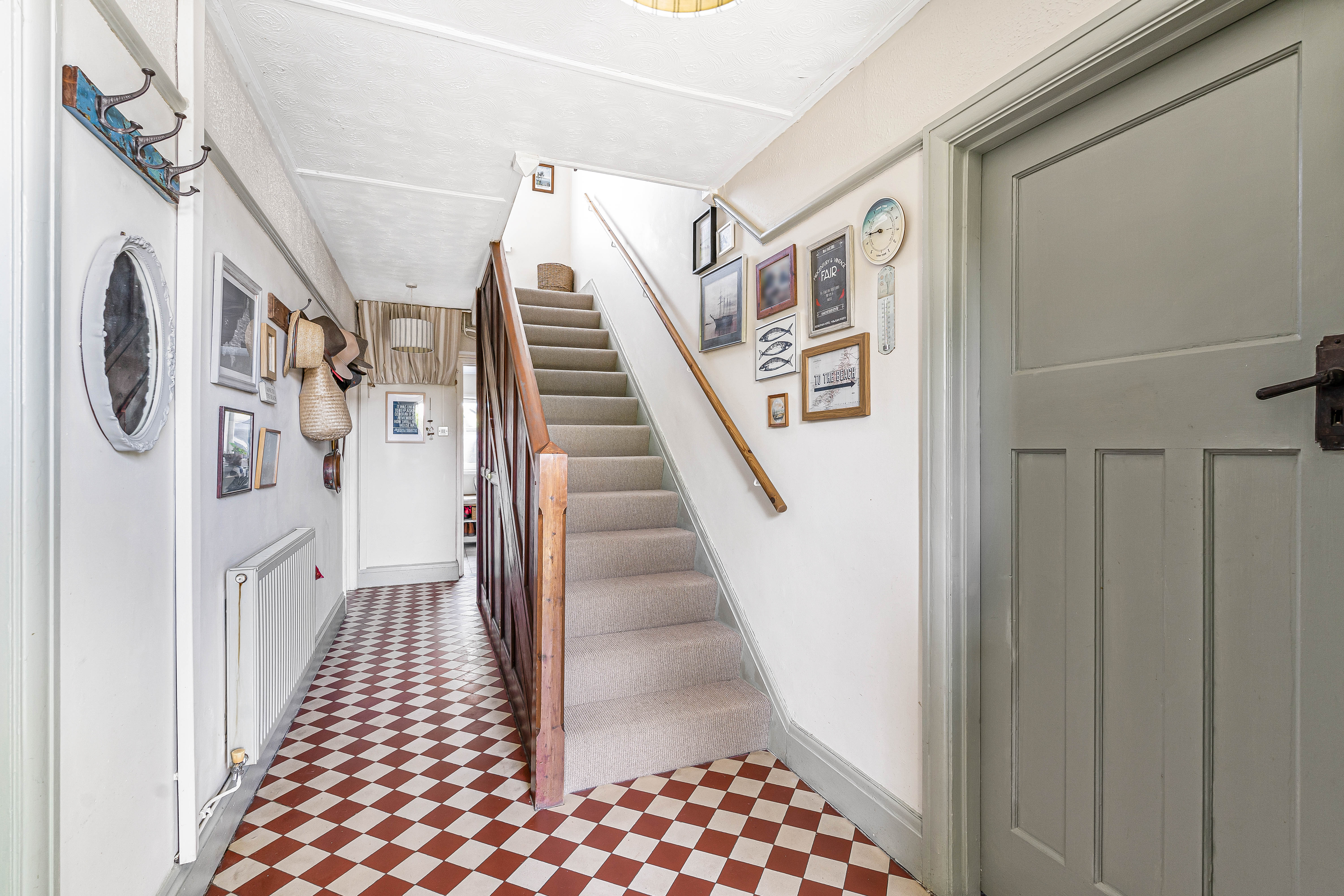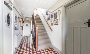 You enter into a beautiful hallway, with stairs to the first floor, two under stairs cupboards, clay mosaic tile floor.