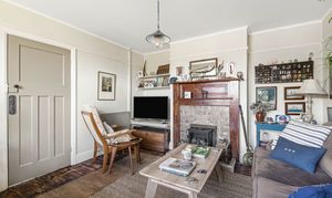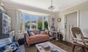 To the right a lovely lounge full of light with bay window to the front, open fireplace with high level wooden mantel tiled backing and hearth, picture rail.