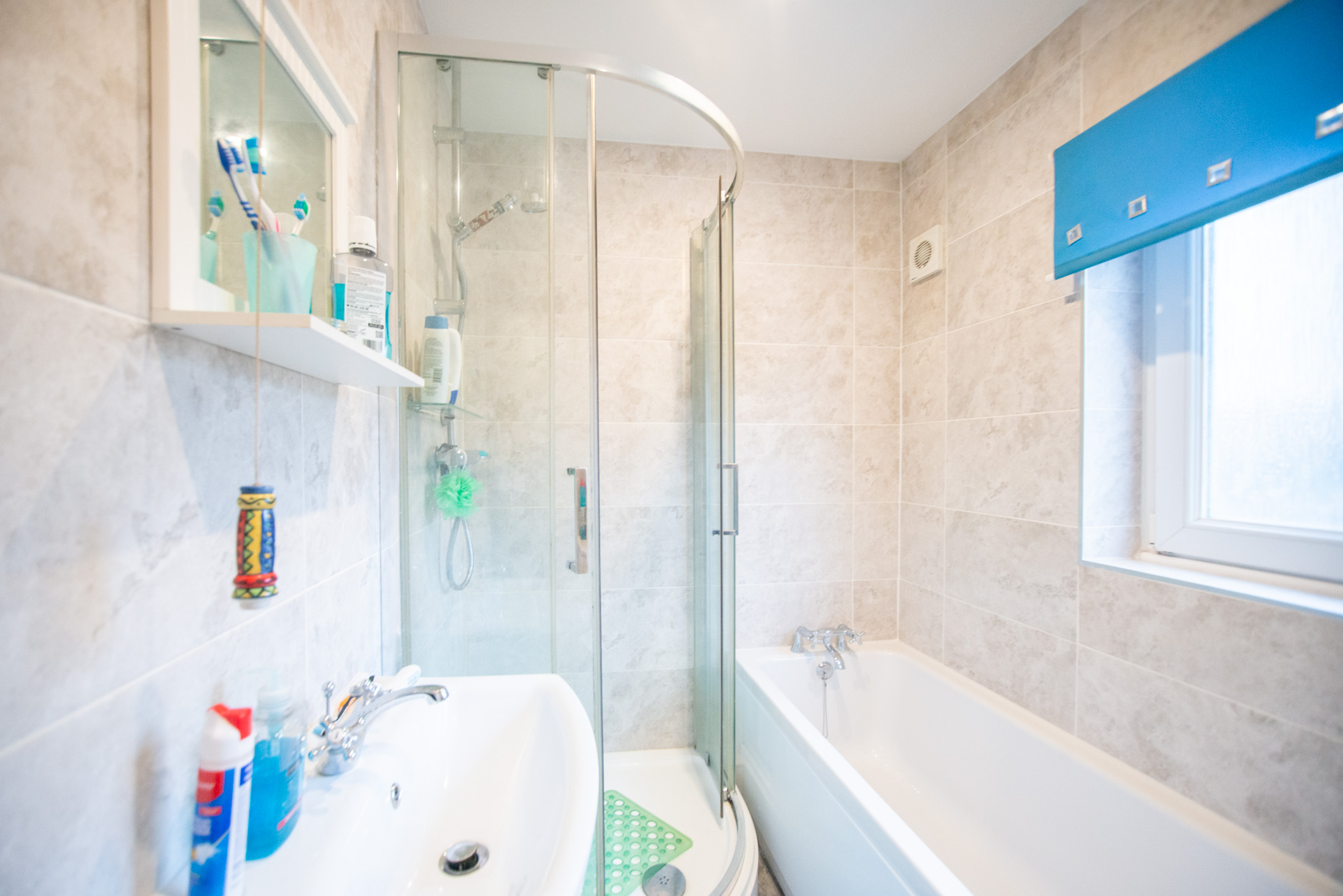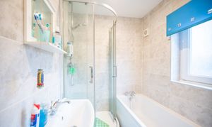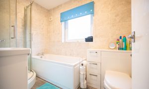 With laminate flooring, W/C, bath, shower cubicle, wash basin with vanity unit, and radiator.