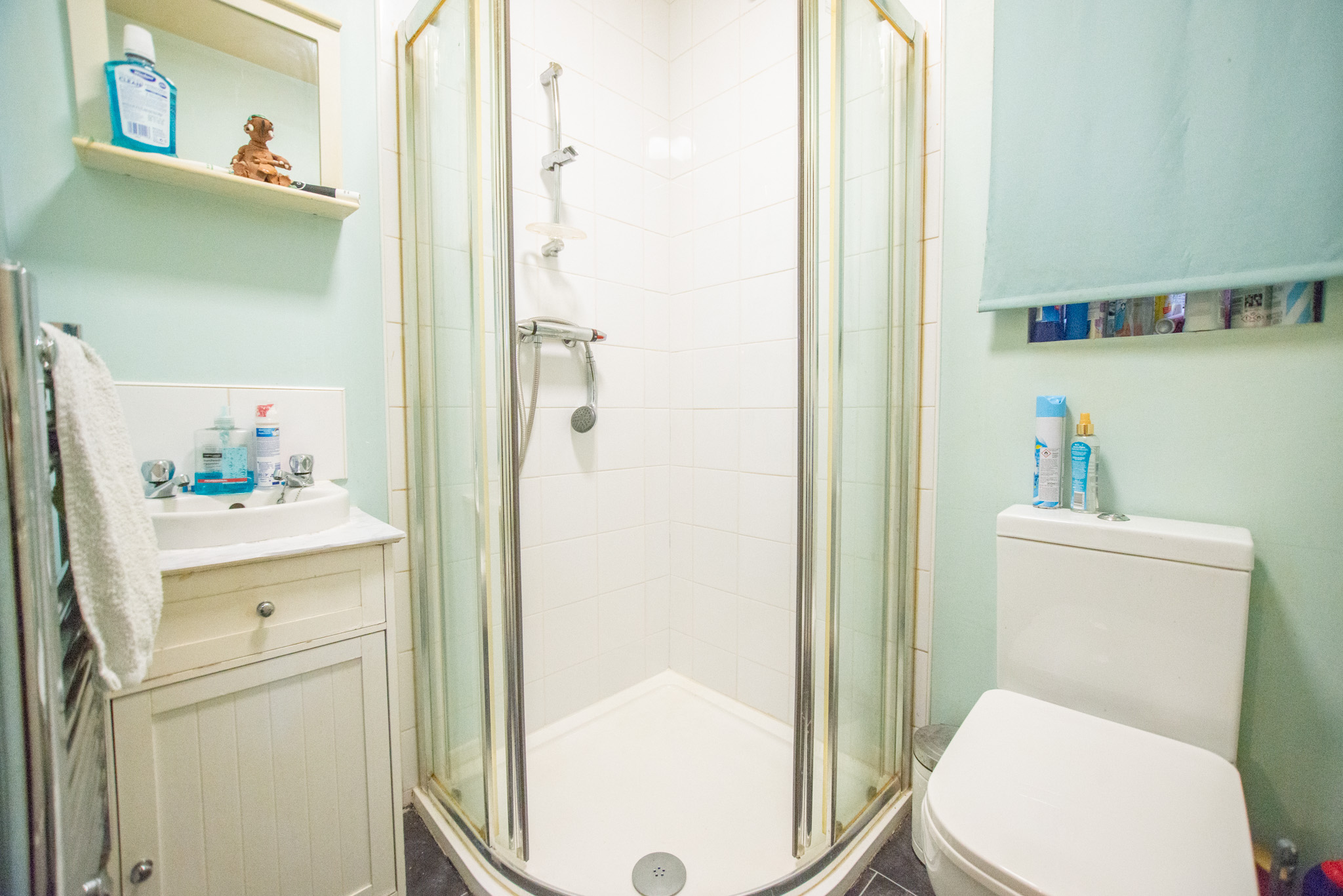 With laminate flooring, W/C, shower cubicle, wash basin with vanity unit, and towel radiator.