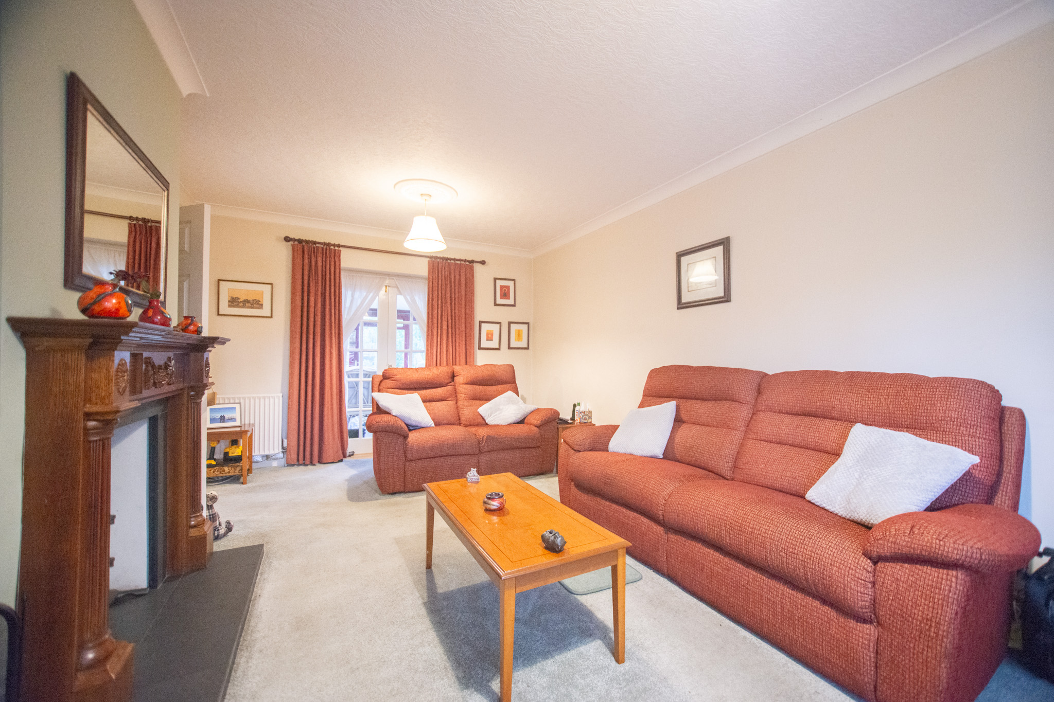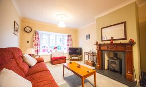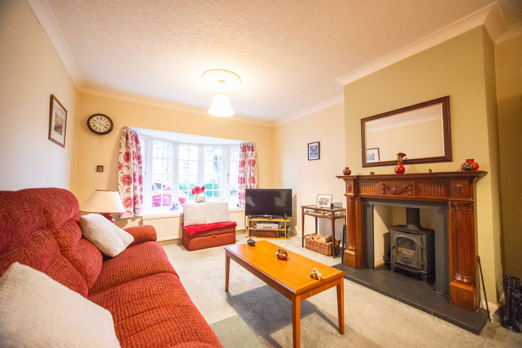 With carpet, radiator, log-burning stove, and large bay window.