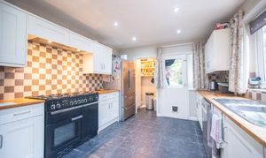 Upon entering, you are greeted by a warm and inviting atmosphere, accentuated by the wood-burning stove in the spacious living area. The open floor plan seamlessly connects the living spaces, leading to a stylish shaker-style kitchen.