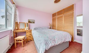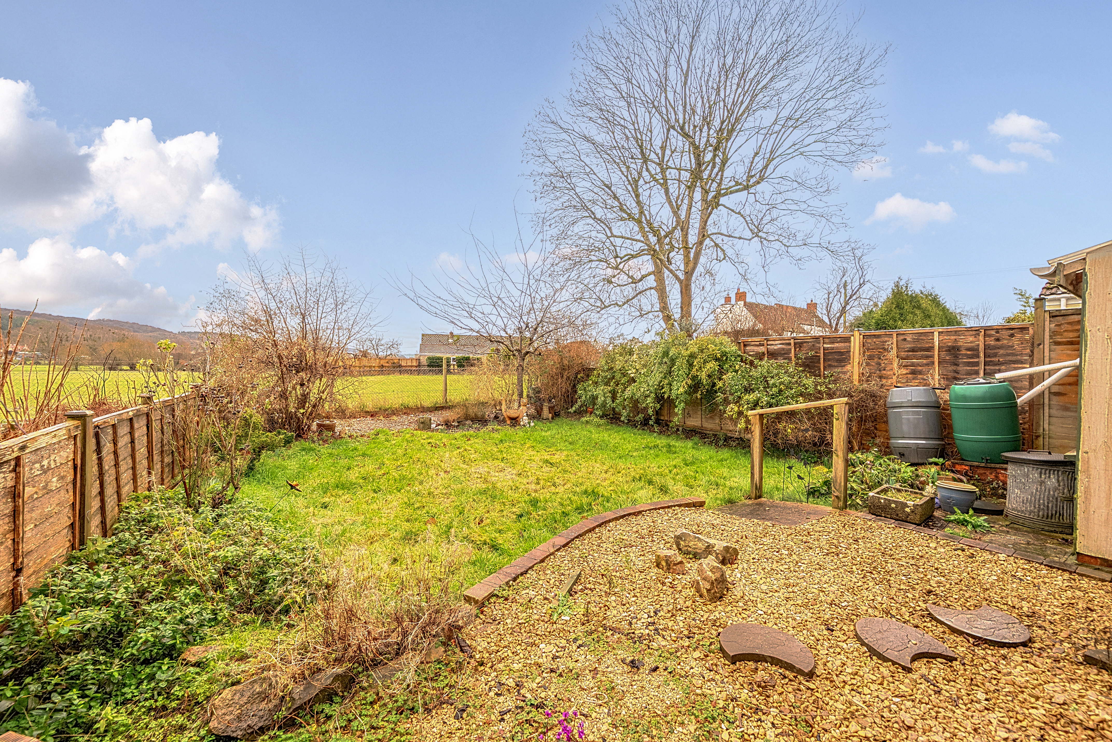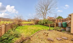 To the rear, the garden backs on to open fields and King’s Wood in the far distance. The garden is fully enclosed and has a small lean to greenhouse/storage room together with a gravelled terraced area to adjacent to the house. The garden is predominantly laid with a lawn with an attractive raised bricked flowerbed.