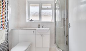 A stylish family bathroom with white three piece suite including shower serves these bedrooms.