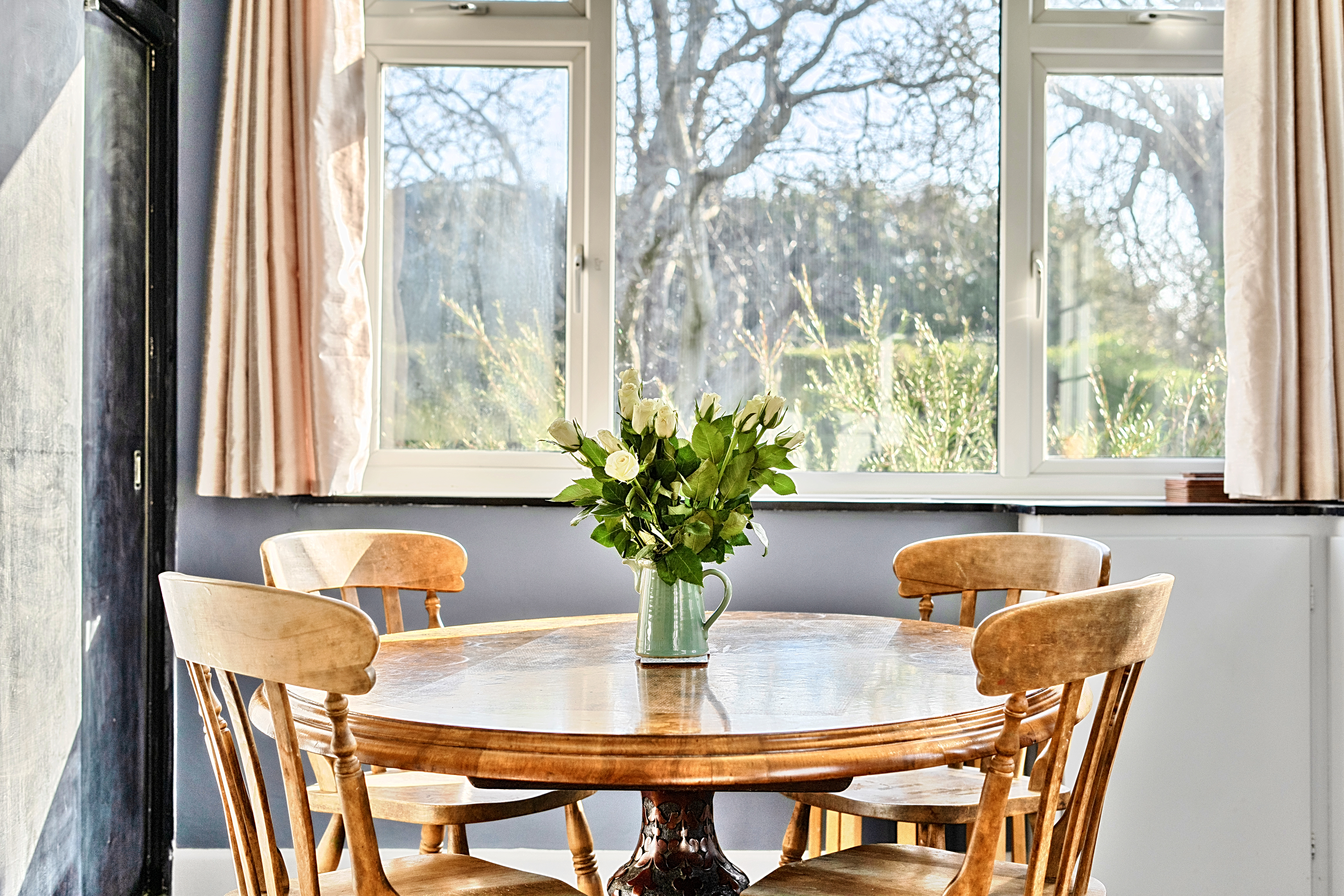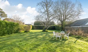 The gardens are a particularly appealing feature of the property. Generous and well established, they are predominantly laid to lawn and interspersed with mature planting, including a notable spreading walnut tree, and bordered by clipped hedging to create a private and tranquil setting.
