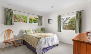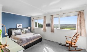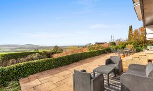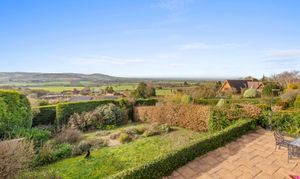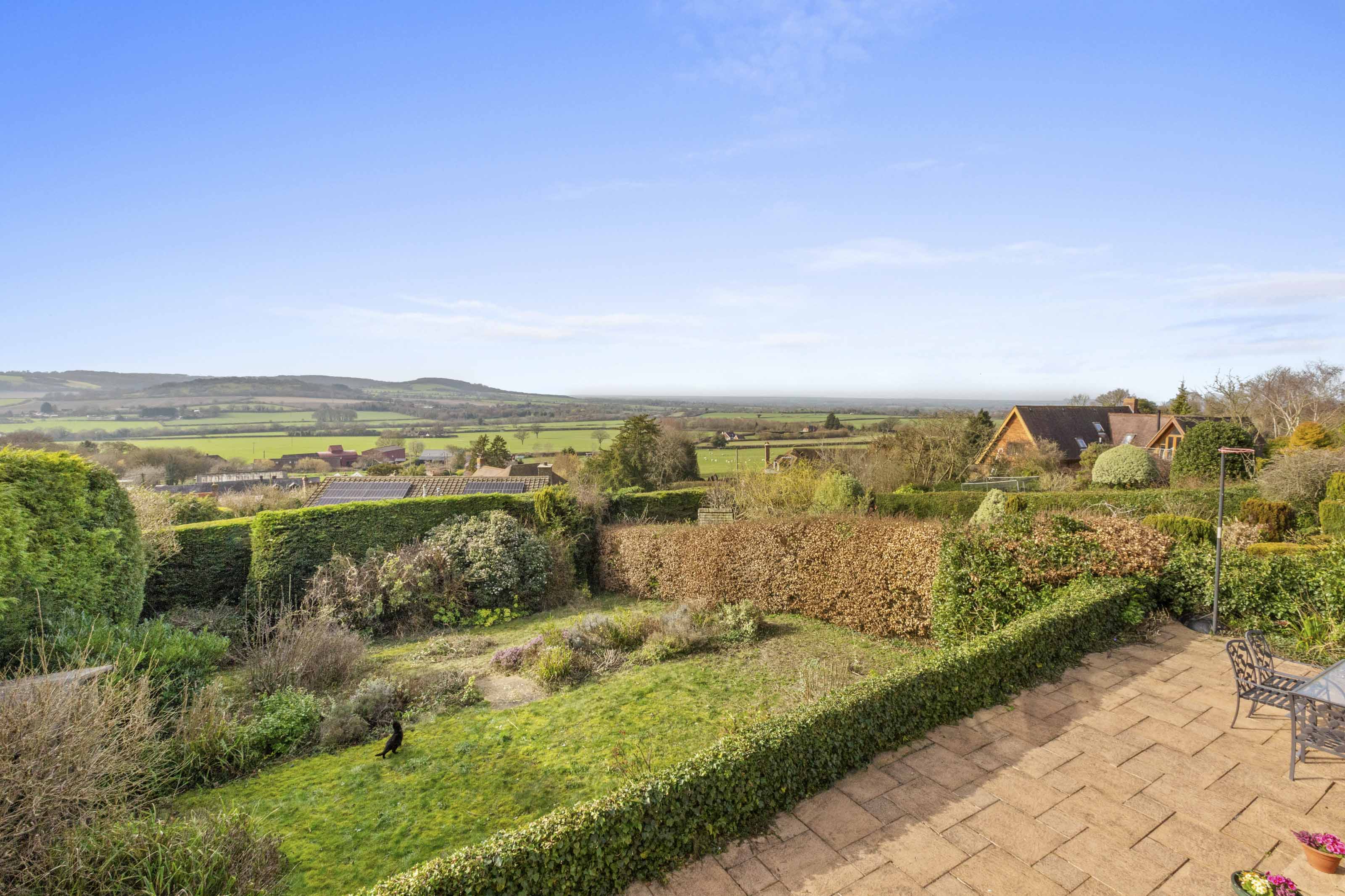 Outside, the attractive garden wraps around the house and is enclosed by neatly clipped hedges. The property is approached via an off-street parking area with space for four cars, in addition to a detached double garage with power, water, and lighting. The rear garden is arranged over three tiers: a paved terrace by the house with impressive views, a lawn with shrub borders, and a lower level that has been landscaped as a natural wild meadow. A private terraced seating area sits to the side of the house, offering a peaceful outdoor space.