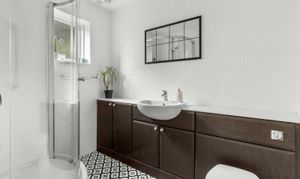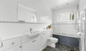 A full-turn staircase leads to the lower ground floor, where there is a versatile family room, a kitchen/breakfast room, a utility/boiler room, and two further double bedrooms. One of these bedrooms connects to a Jack and Jill shower room. A side porch provides useful storage and convenient access to the garden.