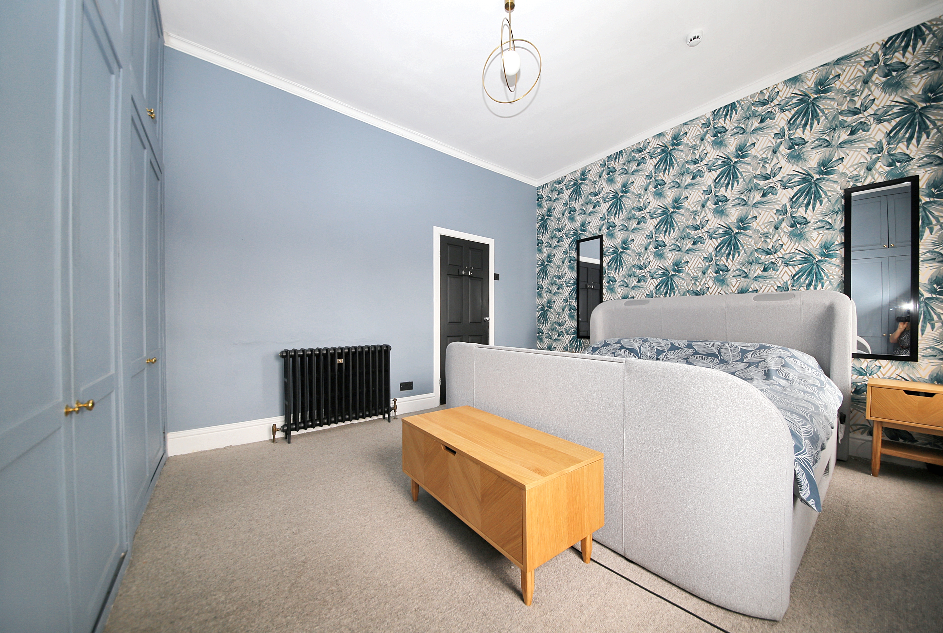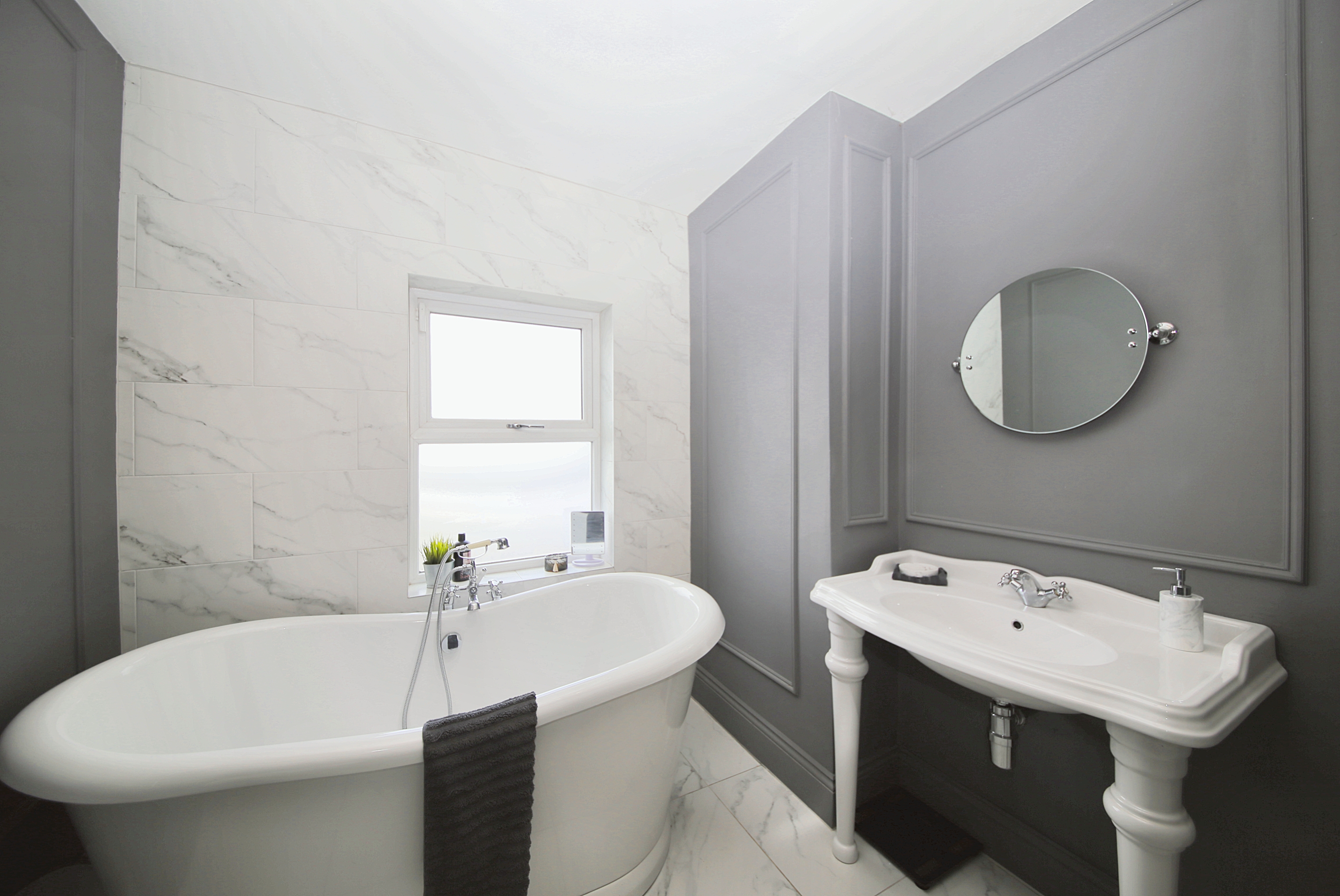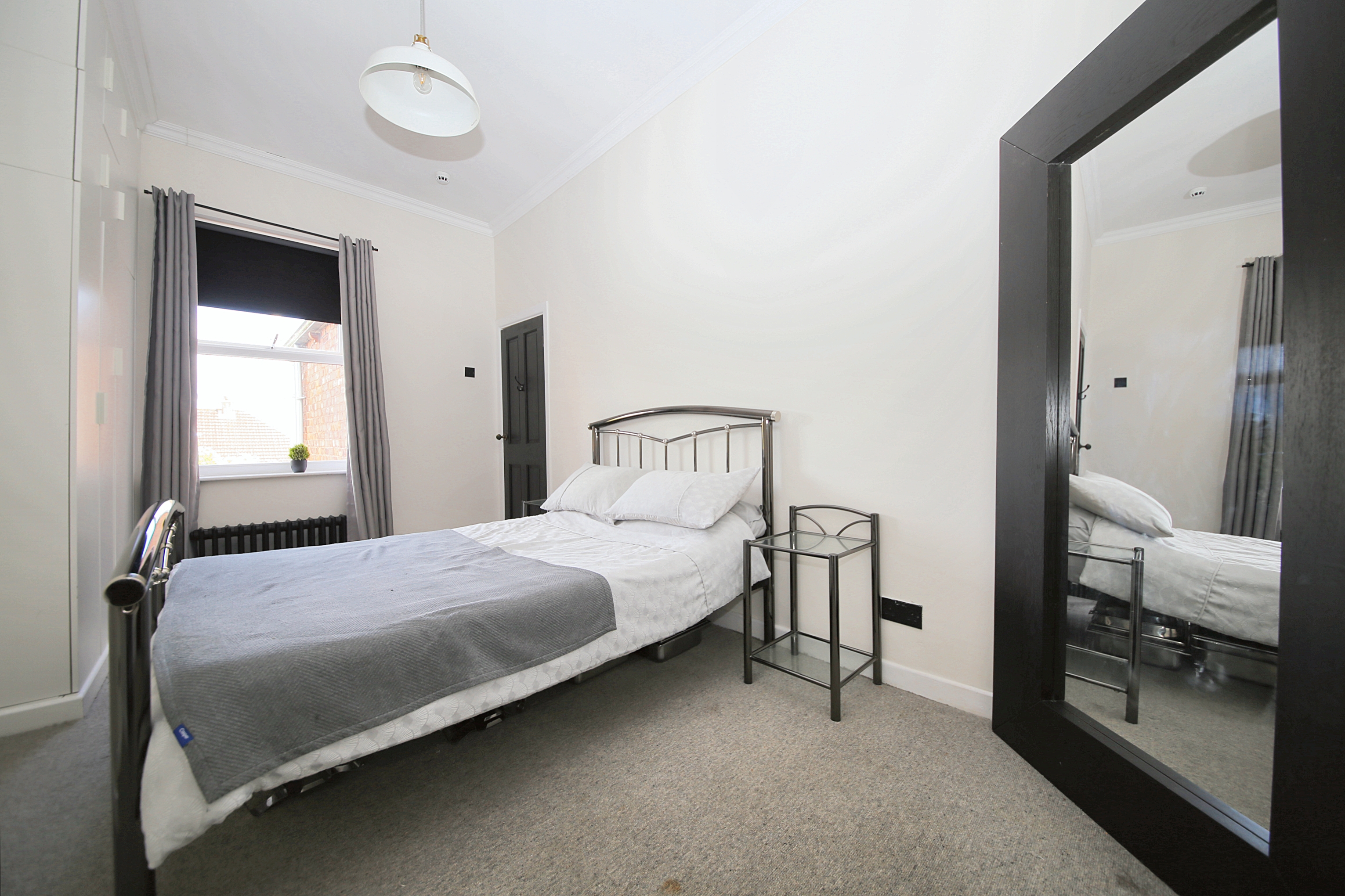 Ascend to the first floor, where two tastefully decorated bedrooms await, each benefiting from built-in wardrobes, exuding a sense of practicality and organisation. A modern family bathroom is conveniently positioned, showcasing a free-standing bath and a separate shower, embodying luxury and functionality.