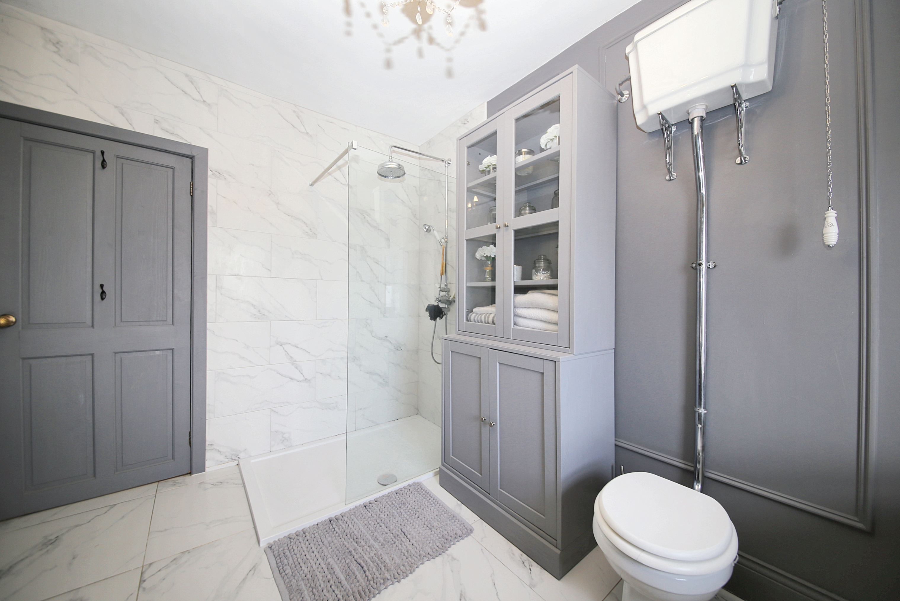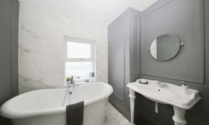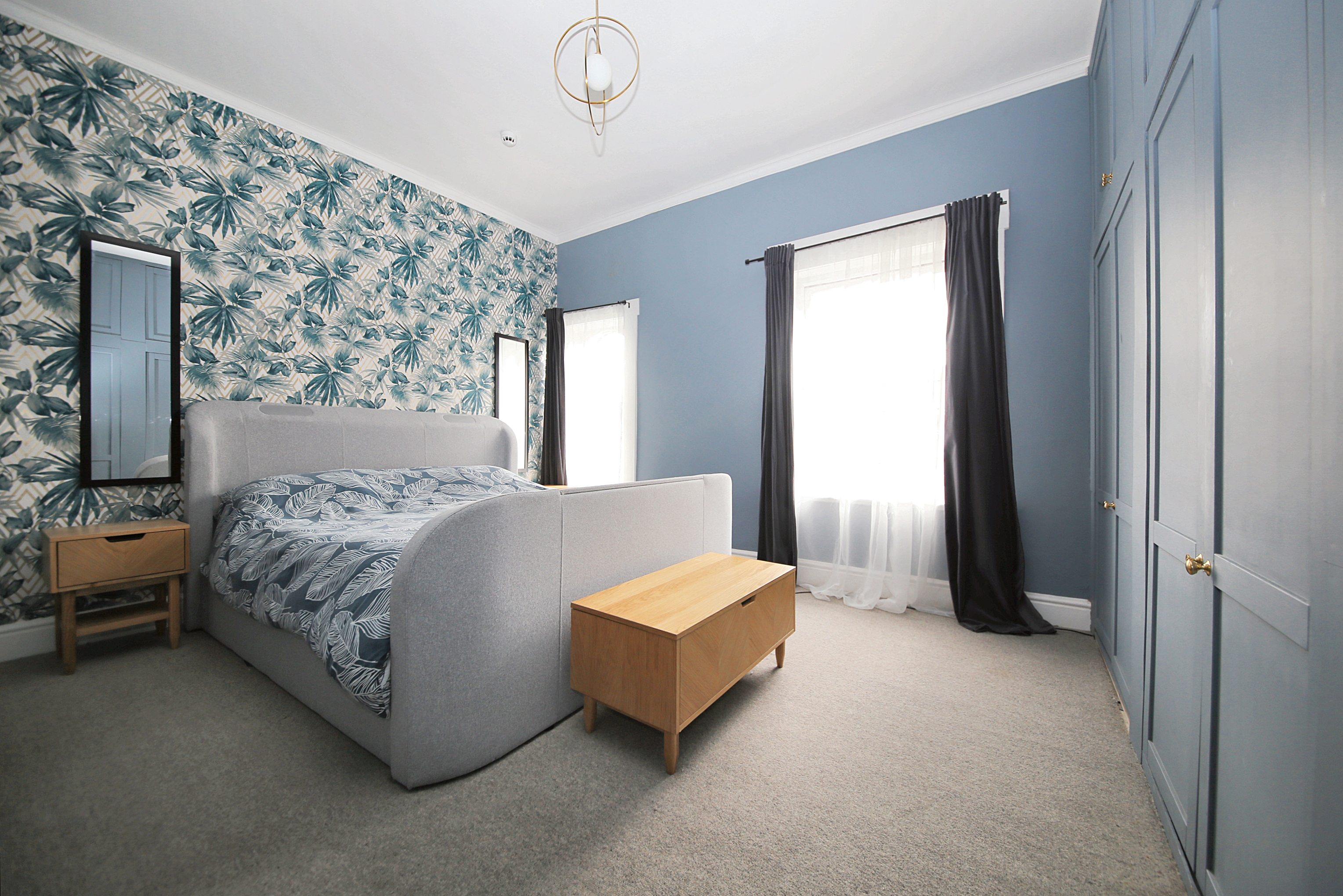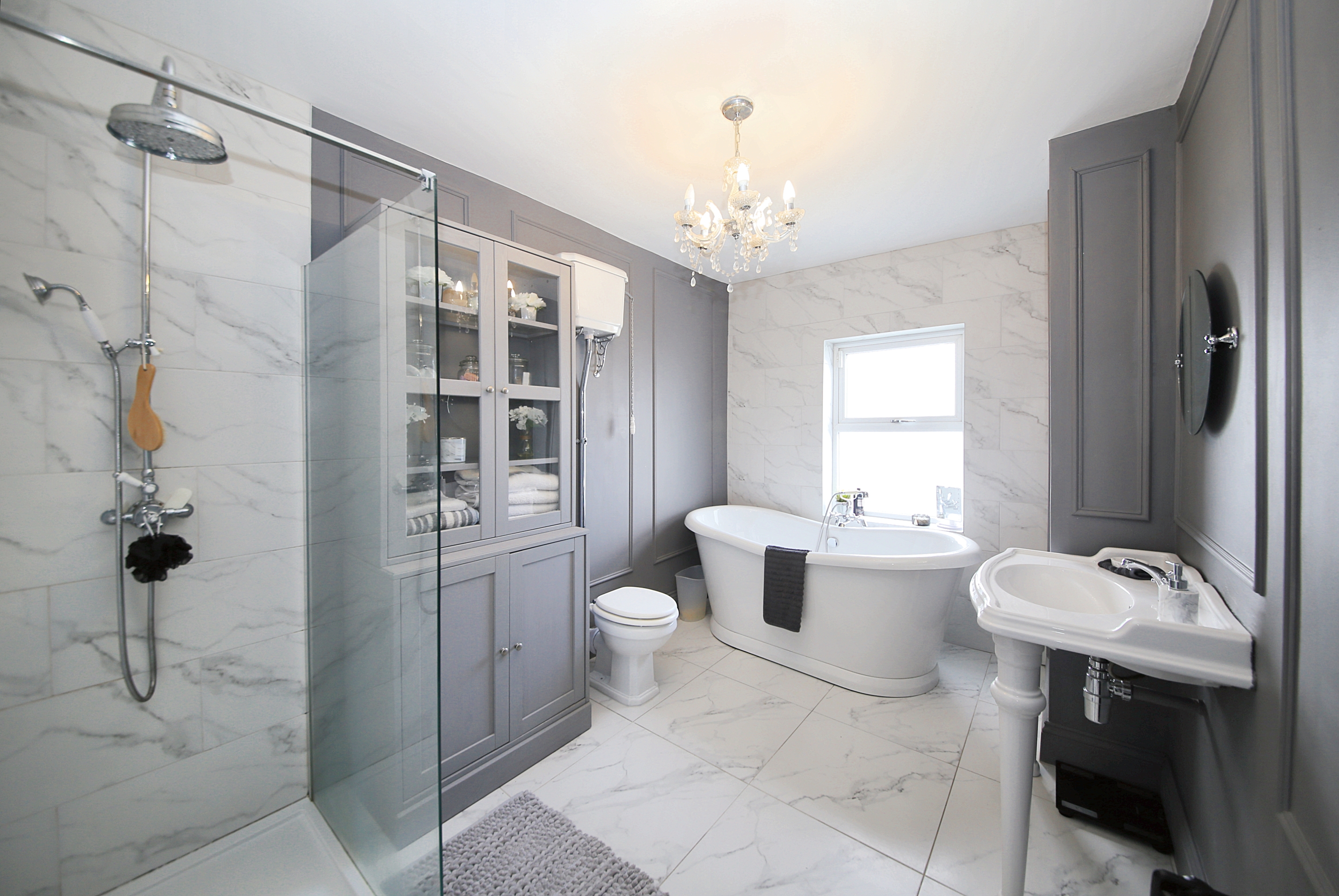 Ascend to the first floor, where two tastefully decorated bedrooms await, each benefiting from built-in wardrobes, exuding a sense of practicality and organisation. A modern family bathroom is conveniently positioned, showcasing a free-standing bath and a separate shower, embodying luxury and functionality.