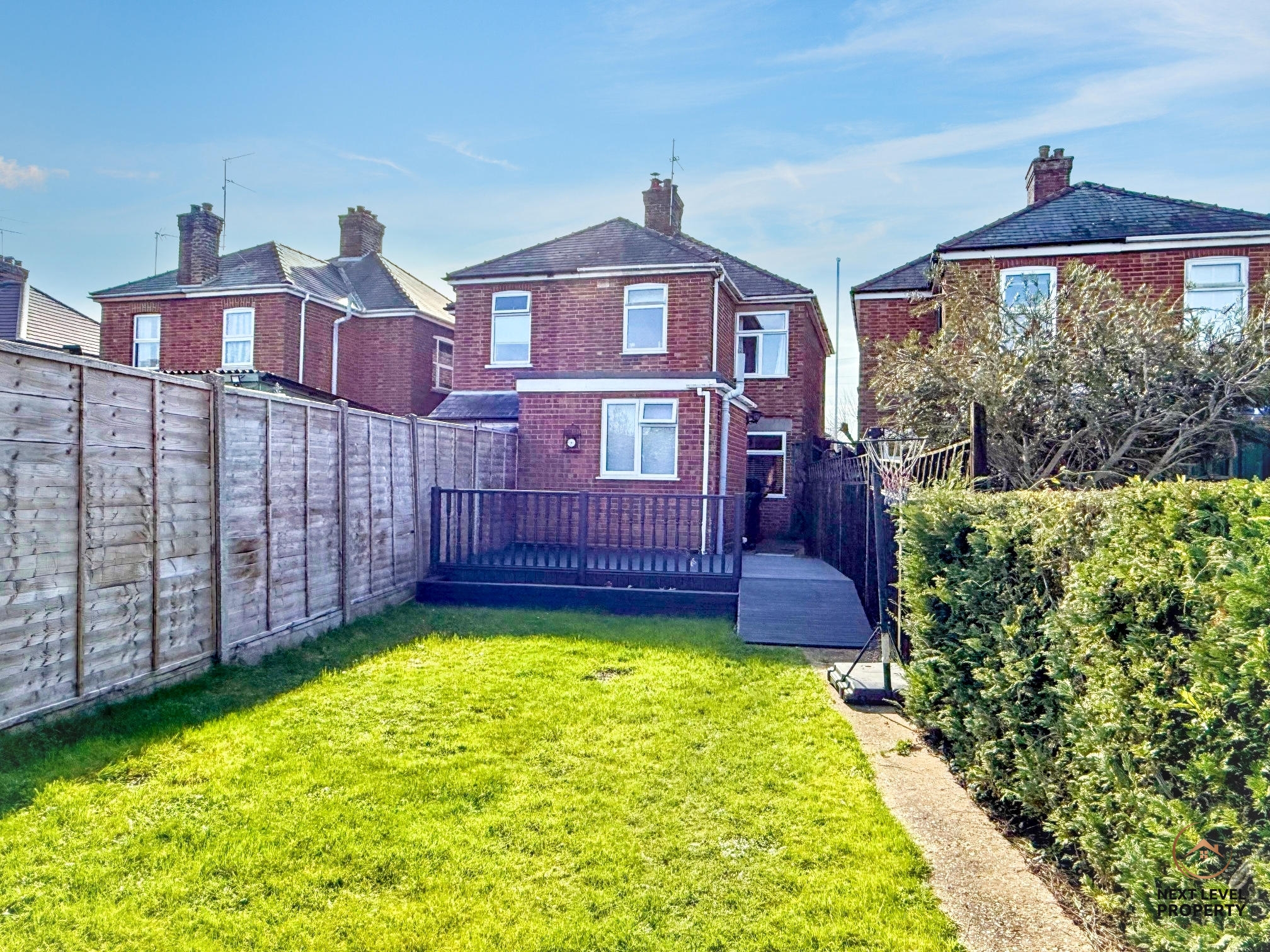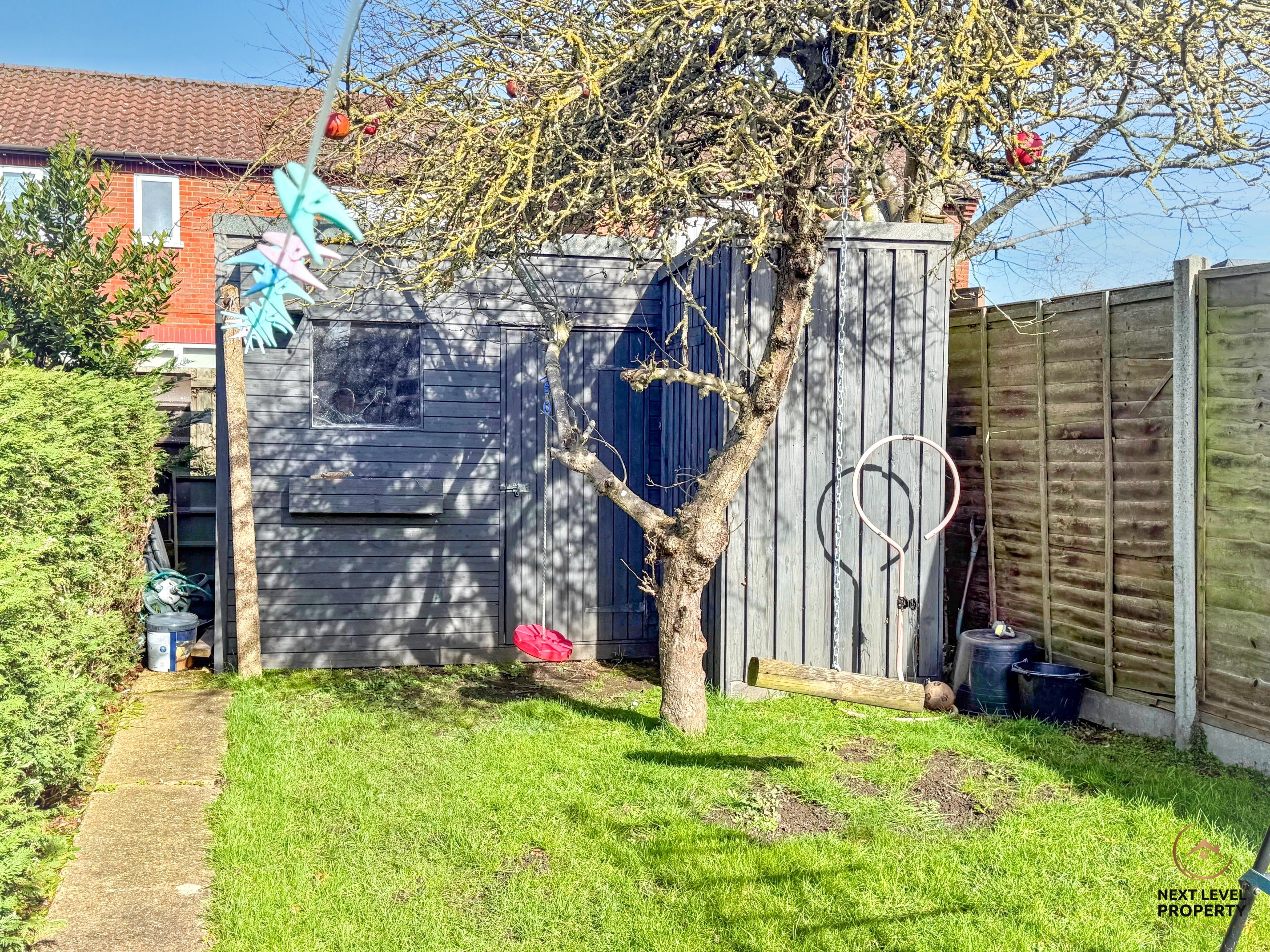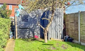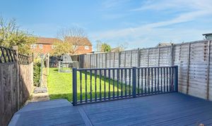 Outside, the property benefits from off-road parking to the front for two vehicles. Gated side access leads to an enclosed rear garden, offering a decked seating area, lawned garden and a timber shed — perfect for relaxing or entertaining during the warmer months.