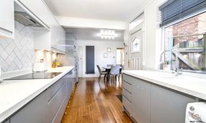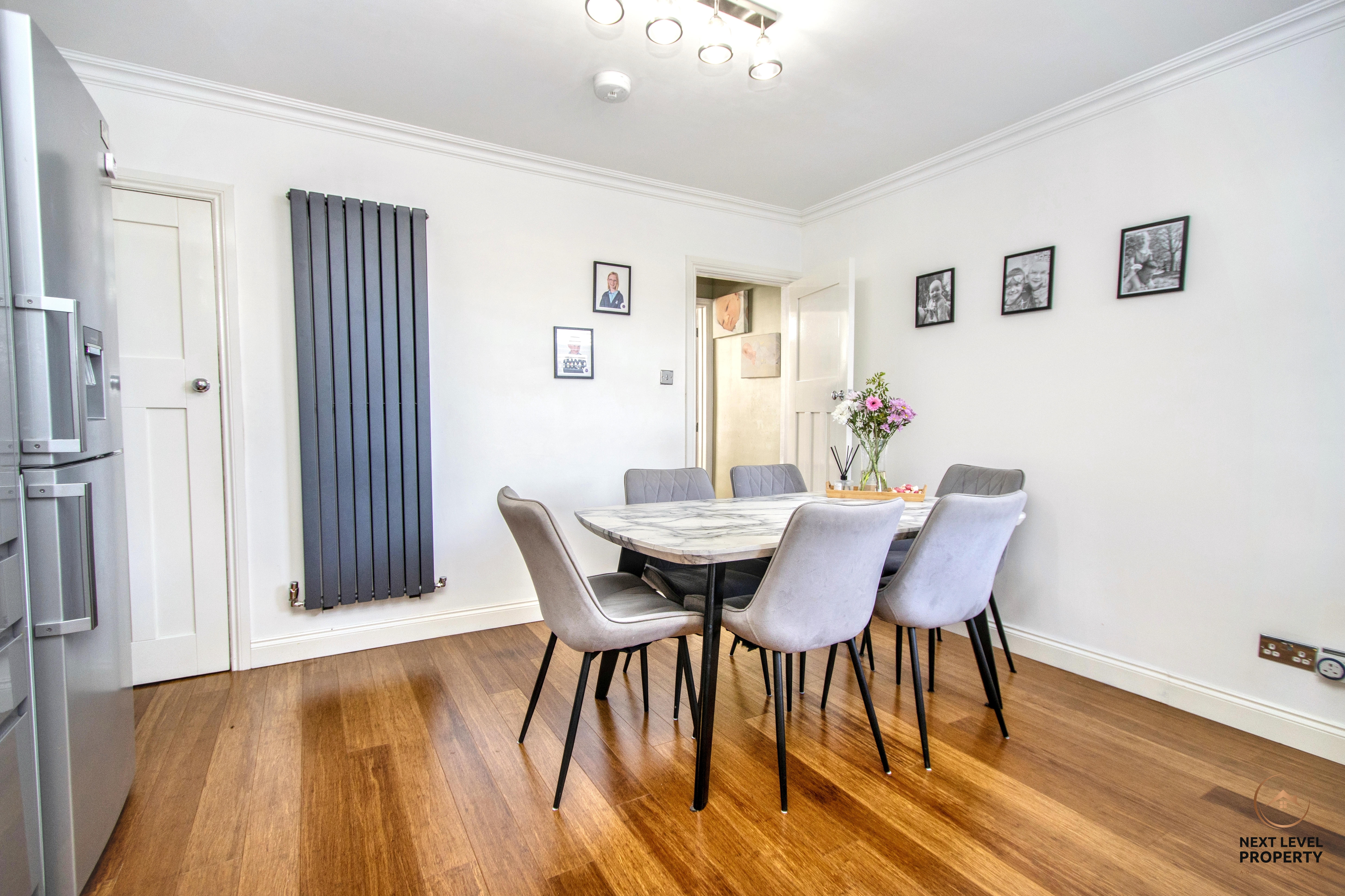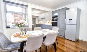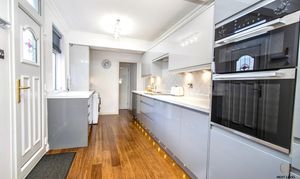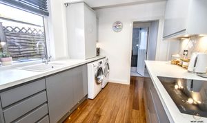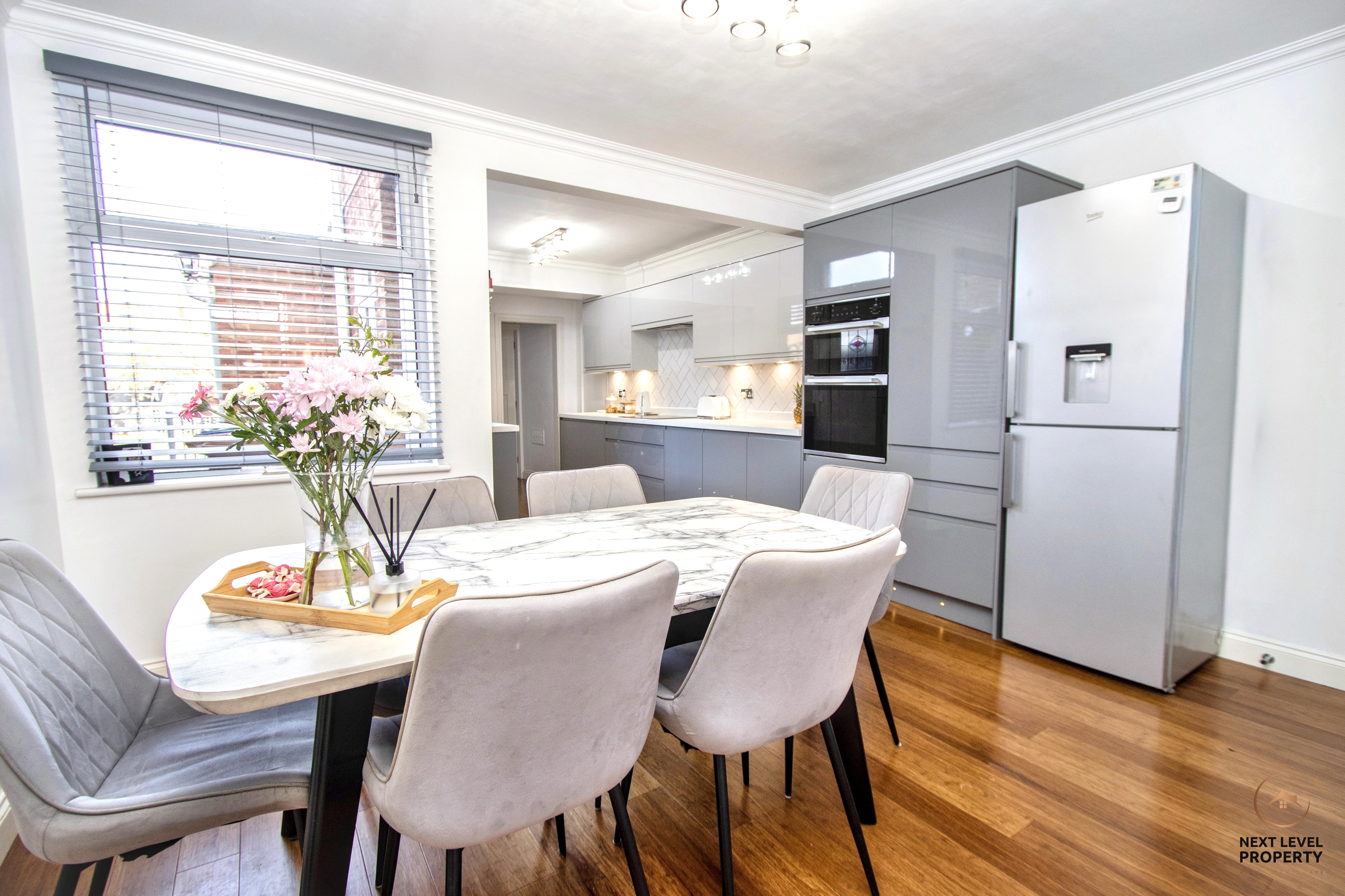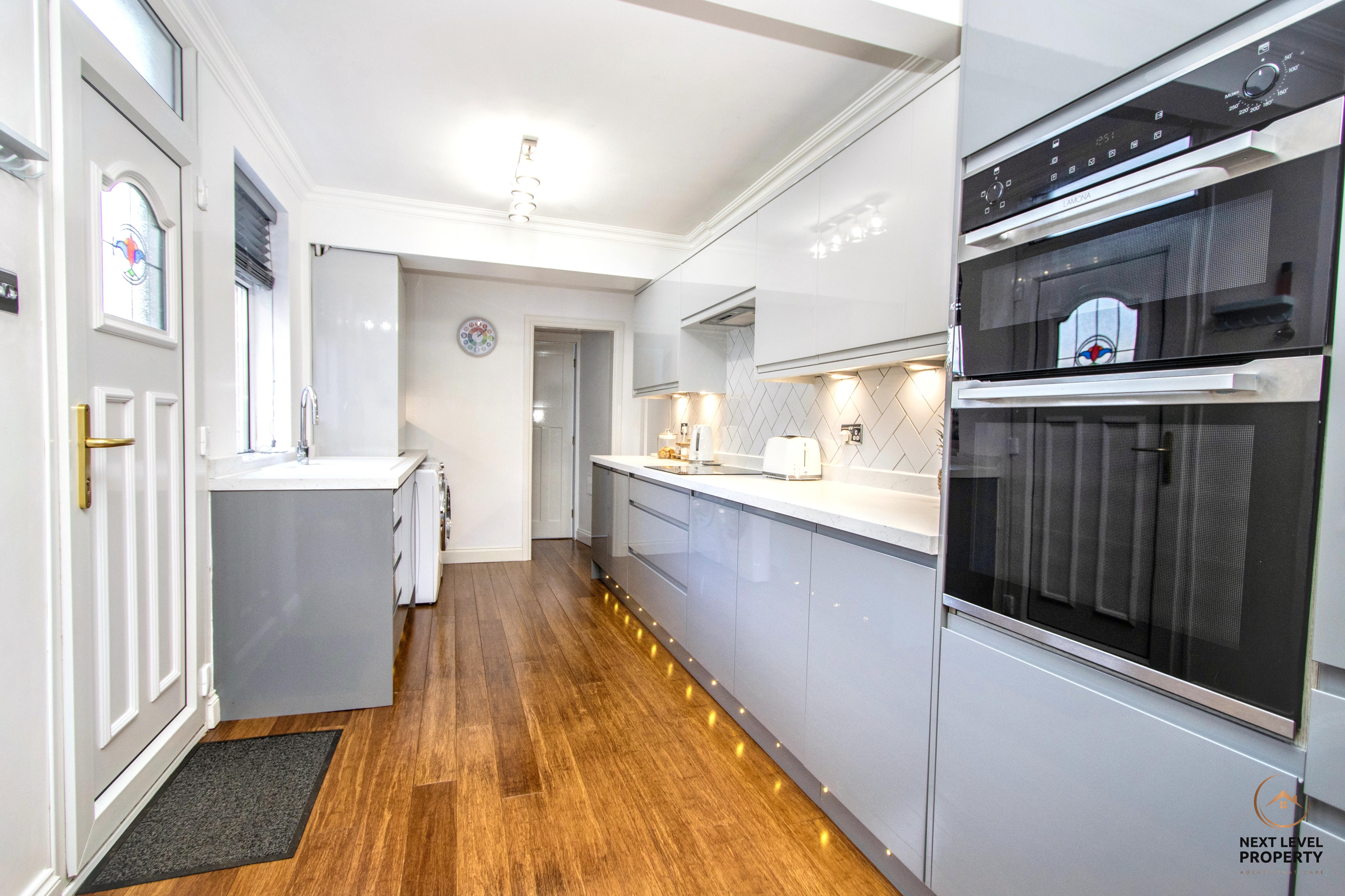 A stylish and sociable kitchen/dining space fitted with a modern grey high-gloss range of units, offering clean lines and contemporary appeal. Integrated appliances include a double oven, ceramic hob with extractor hood and dishwasher, complemented by LED lighting and tiled splashbacks. A white inset sink is set within generous work surfaces, with space for a fridge freezer. The dining area comfortably accommodates a large table and chairs, ideal for family meals and entertaining. Two uPVC windows bring in plenty of natural light, while a tall radiator adds a modern touch. A useful utility area provides space and plumbing for a washing machine and tumble dryer, with a door to the rear entrance. There is also a practical lobby area for coats and shoes, with access through to the bathroom.