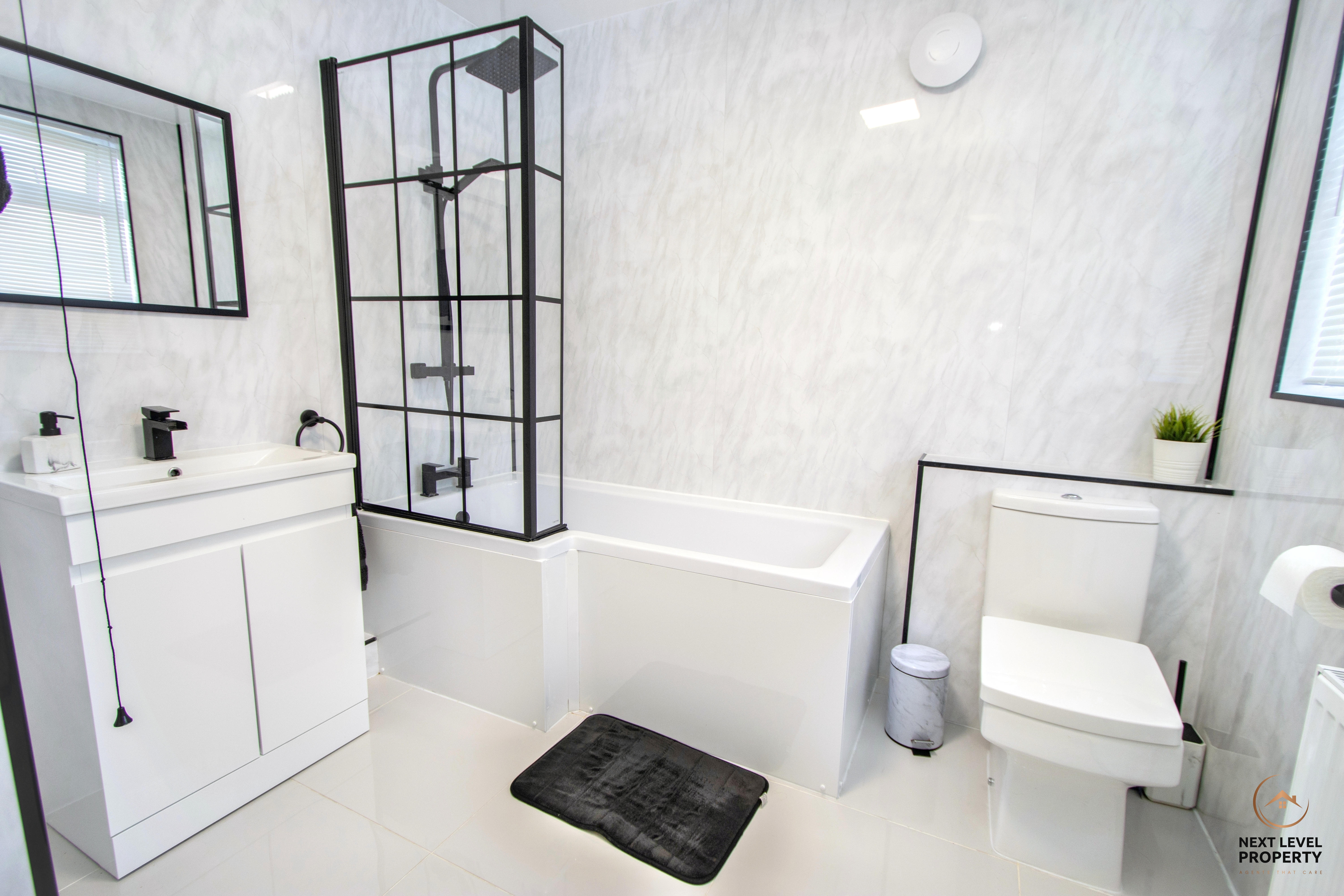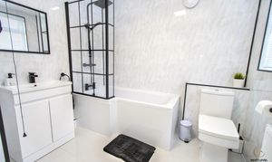 The bathroom is stylishly appointed with a contemporary suite comprising a P-shaped bath with shower taps and a rainfall shower head over, complete with a glass screen. A modern hand basin is set within a vanity storage unit, providing both practicality and clean-lined design, alongside a close-coupled WC. Wet boarding to the walls creates a sleek, low-maintenance finish, complemented by a ceramic tiled floor. A uPVC window to the rear allows natural light to brighten the space while maintaining privacy.