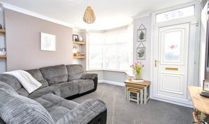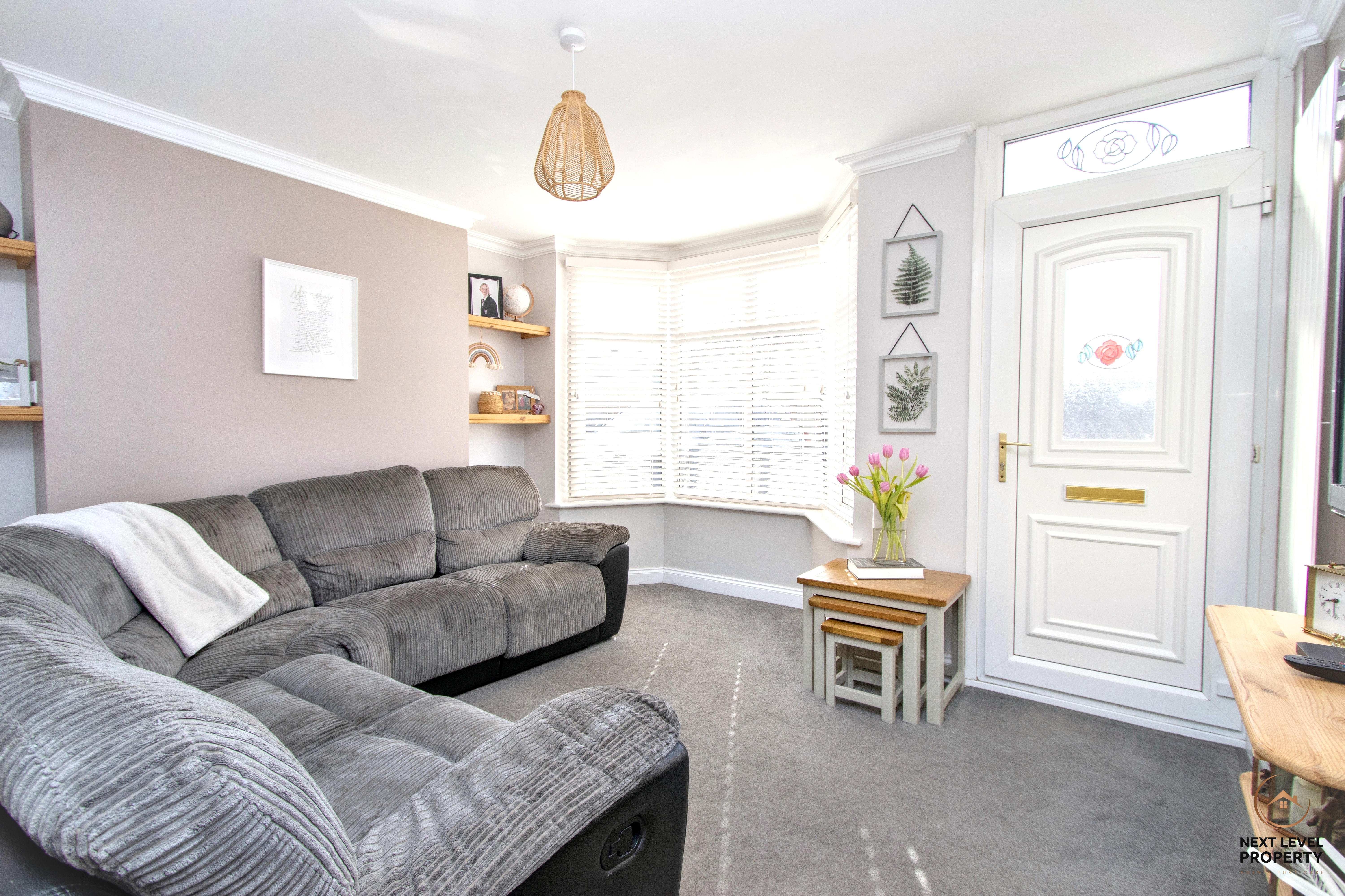 A beautifully bright and welcoming reception room, enhanced by a feature uPVC bay window that draws in plenty of natural light and creates a lovely focal point to the space. Display shelving to either side of the chimney breast adds both character and practicality, perfect for books, artwork or personal touches. A tall contemporary radiator adds a stylish modern edge, while a uPVC door to the front provides convenient access and further natural light. A comfortable and versatile living space, ideal for relaxing evenings or entertaining guests.