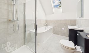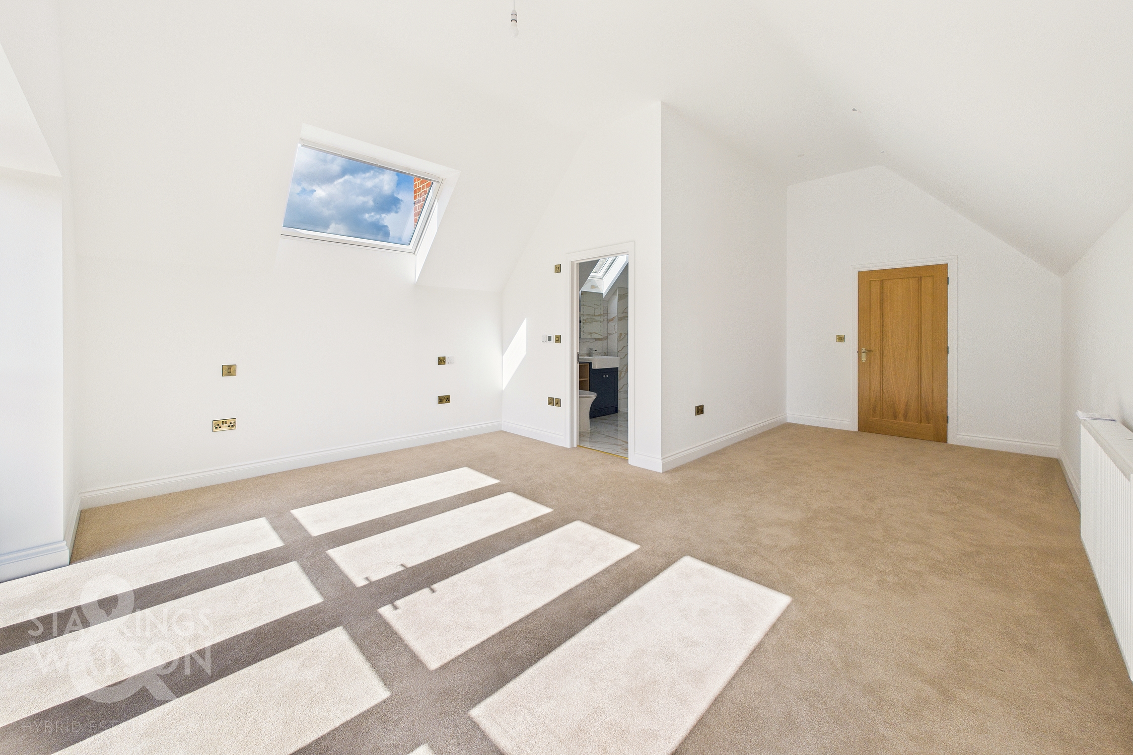 Upstairs, the bespoke stairs include eye catching twisted spindles, whilst excellent natural light floods the room, and doors lead to the three bedrooms. Sitting under a vaulted ceiling, the main bedroom includes a ‘Juliet Style’ balcony which features panoramic countryside views, with fitted carpet underfoot and ample space for wardrobes or a dressing area. The private ensuite includes a part vaulted ceiling, with eye catching tiled flooring and walls, with a bespoke vanity unit including storage and contrasting inset shelving. The velux window ensures a light and bright feel, with a large walk-in shower cubicle including a luxury rainfall shower. The two further double bedrooms are carpeted and ready to occupy. Completing the property, the family bathroom include storage and a heated towel rail, with a separate bath and Rainfall shower.